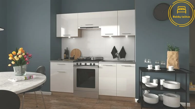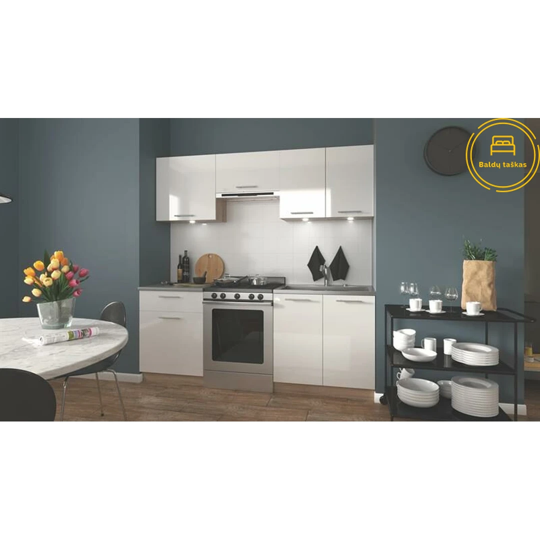 Virtuvės baldų komplektas už itin prieinamą kainą, puikiai pasitarnaus Jūsų virtuvėje. Virtuvės komplekto ilgis: 200 cm. Baldui būdingas dujinis keltuvas. Stalviršio storis: 28 mm. Spalva: fasadas - vanilinis, korpusas - ąžuolas sonoma, stalviršis - baltas arba fasadas - baltas blizgus, korpusas - baltas matinis, stalviršis - baltas.