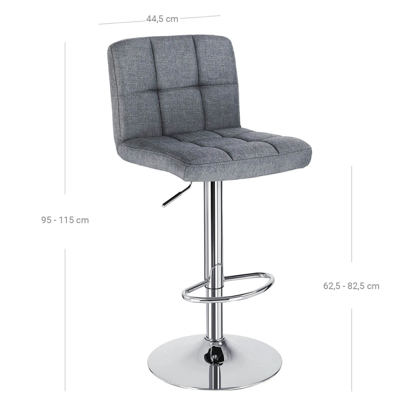 Aprašymas buvo automatiškai išverstas, gali pasitaikyti klaidų.Produkto aprašymas Songmics baro kėdė pasižymi patogia sėdyne, geru stabilumu ir švariu apdirbimu. Jame yra didelio tankio putplasčio paminkštinimas, patogus PU paviršius, didelis pagrindas, aukštos kokybės dujinė spyruoklė ir blizgus pagrindas. Jis yra reguliuojamo aukščio ir laisvai sukasi. Be to, apatinis guminis žiedas apsaugo grindis nuo subraižymo Songmics baro kėdė puikiai tinka užkandžių bare, kavinėje, universalinėje parduotuvėje, net namuose prie prekystalio. Tai ne tik praktiška sėdėti, bet ir pasitarnauja kaip puošmena, kuria madas ir tendencijas.Išsami informacija apie gaminį: - Sėdynės: 44,5 x 38 cm (P x G) - Bendras aukštis: apie 95 - 115 cm - Bepakopis sėdynės aukščio reguliavimas: apie 62,5 - 82,5 cm - Atlošo aukštis: 32 cm - Pagrindo skersmuo : 41 cm - Medžiaga: linas + chromuotas plienas - Spalva: pilka Rinkinį sudaro: Pristatymo komplektas: - 2 x baro kėdės - 1 x instrukcijos (DE, EN, FR, IT, ES) - 1 x furnitūros maišelis