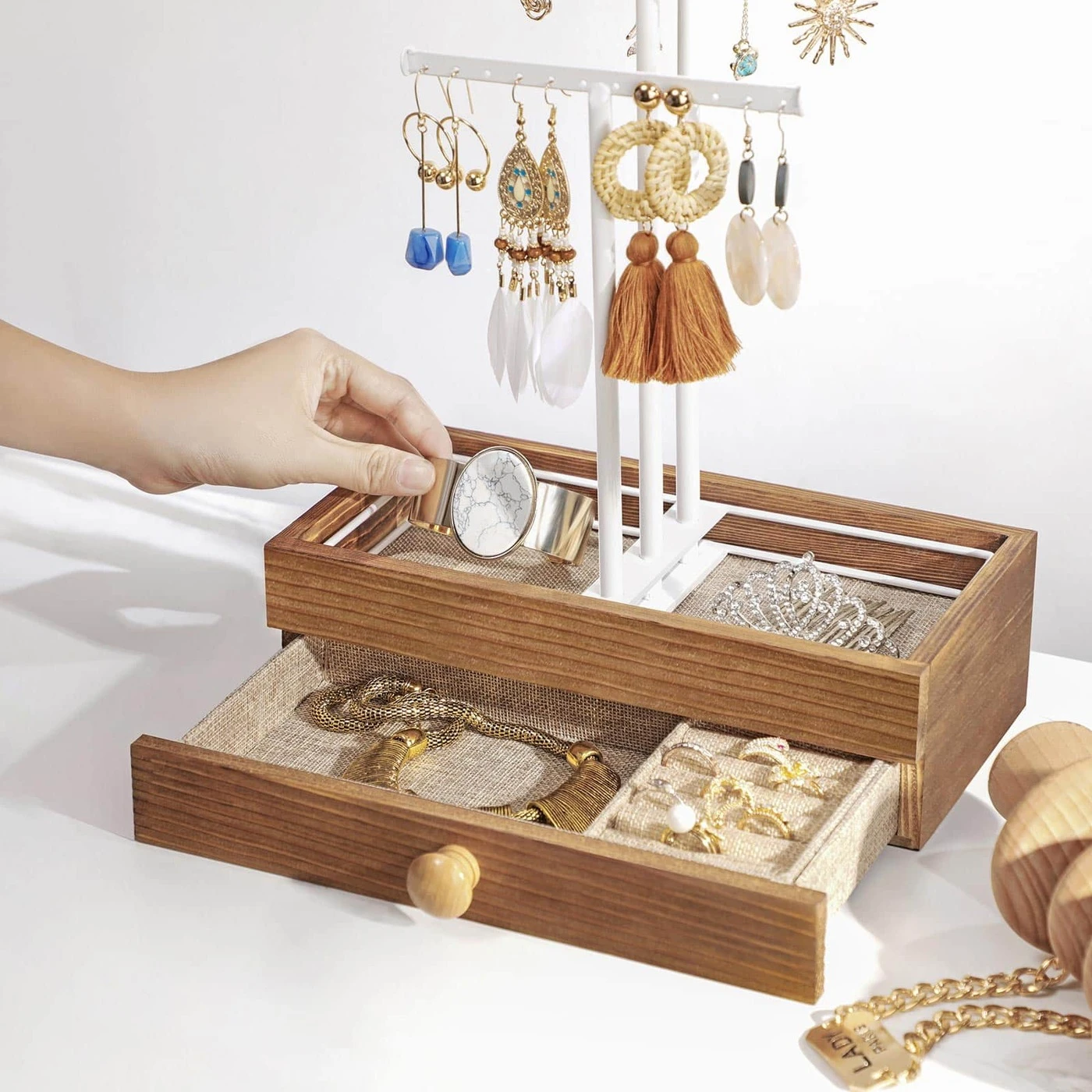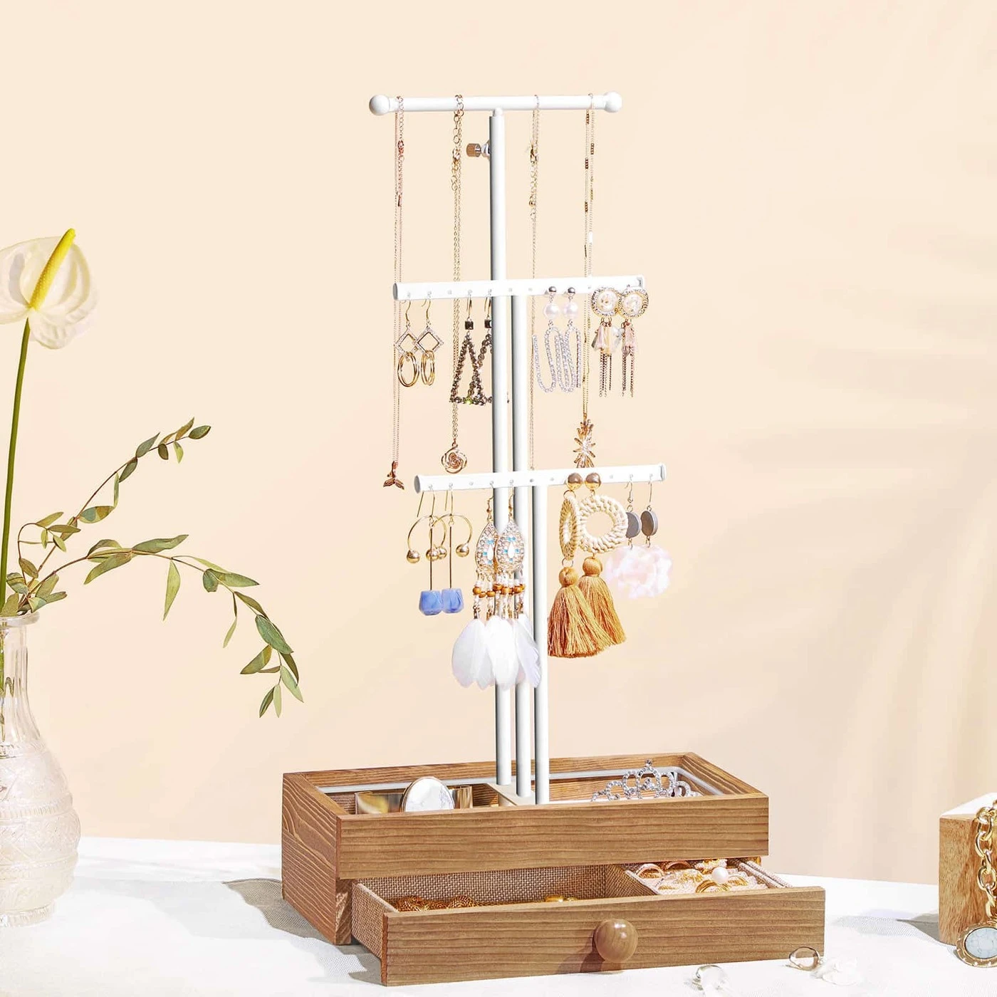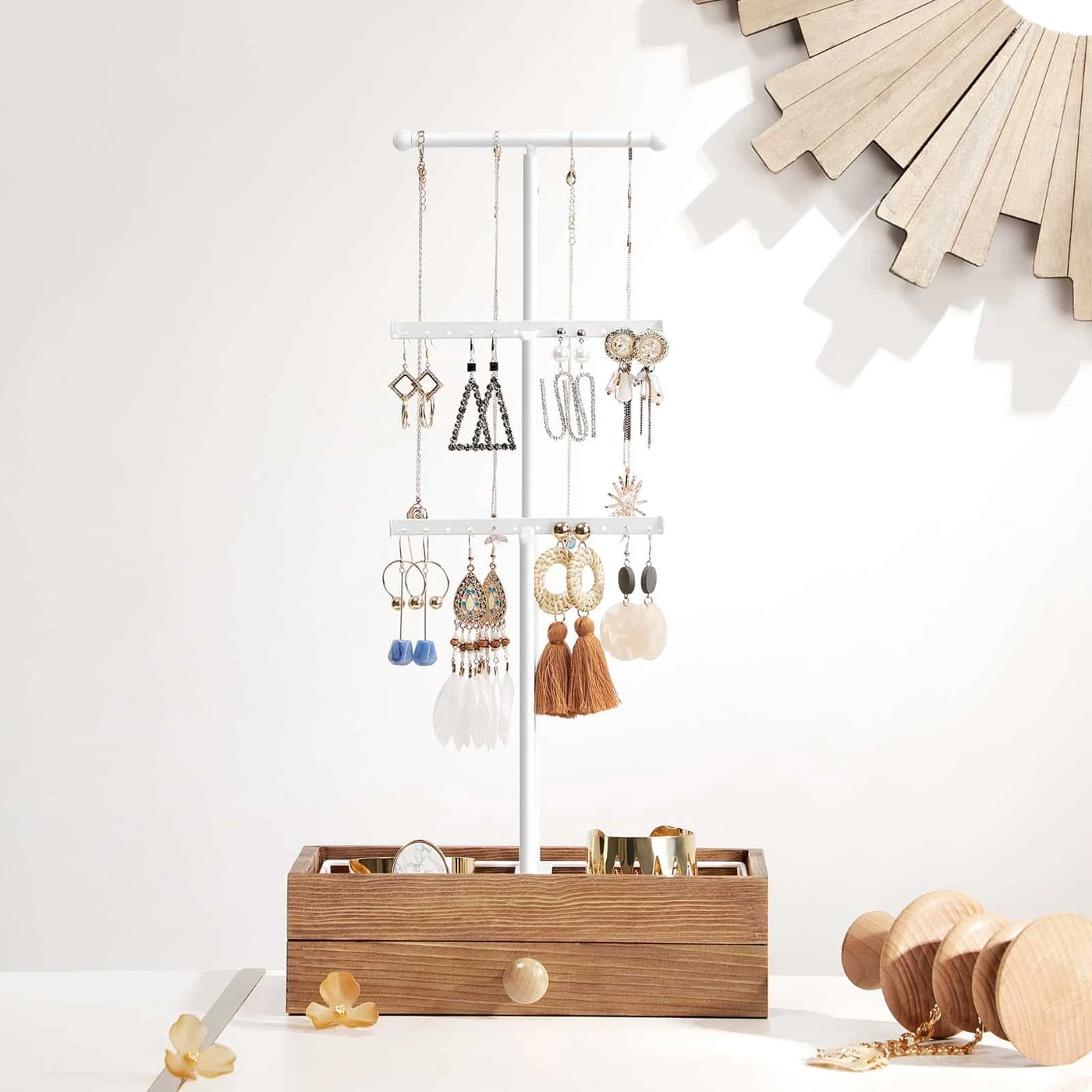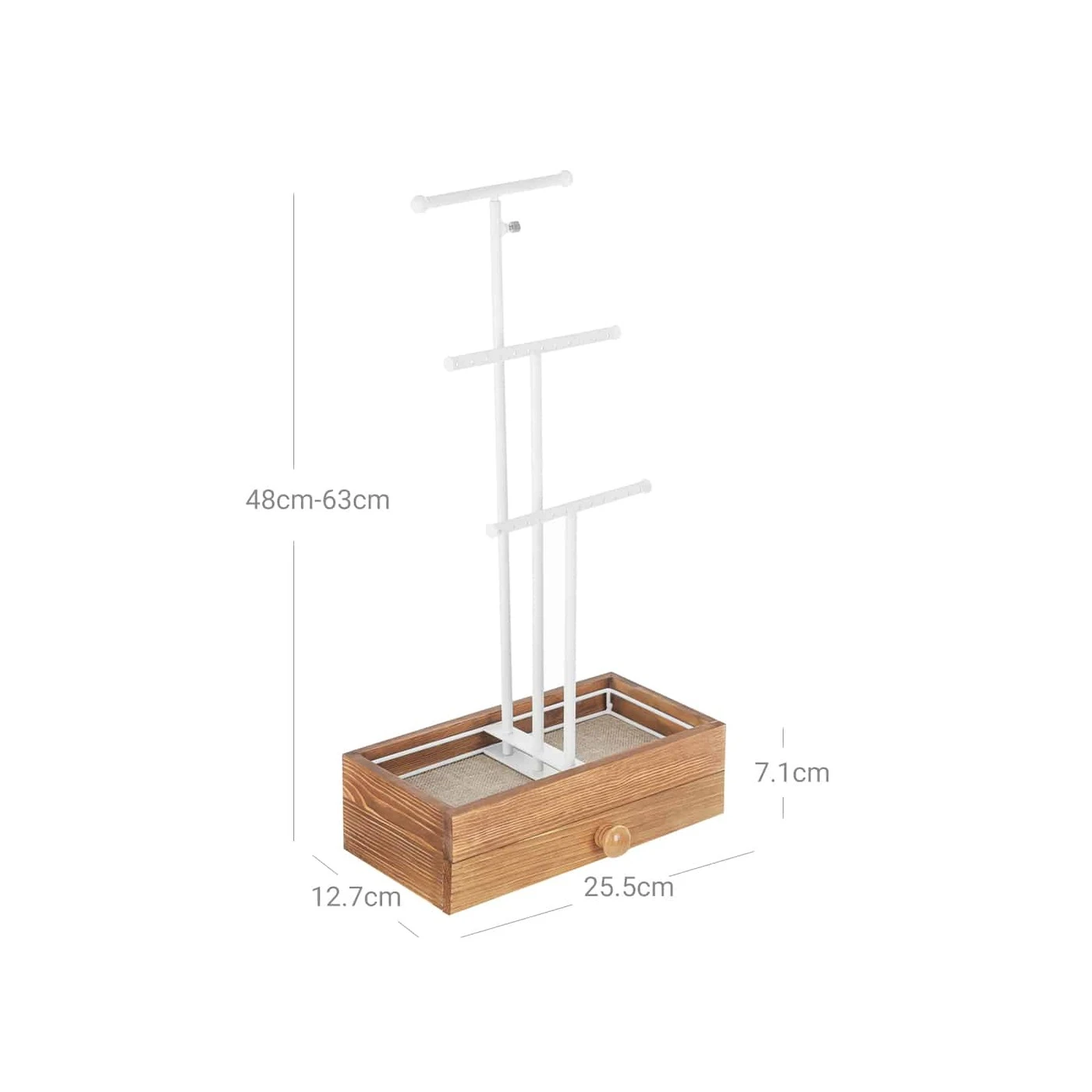 Aprašymas buvo automatiškai išverstas, gali pasitaikyti klaidų.Padėkite savo papuošalus tinkamoje šviesoje Ar jūsų papuošalų kolekcija auga? Nekraukite savo žiedų, karolių, apyrankių ir auskarų į stalčių! Šis sumanus juvelyrinių dirbinių stovas „du viename“ siūlo jums daugiau pagalbos nei kiti. Laikykite daugybę lobių ant grotelių ir mažame stalčiuje! Geros medžiagos kalba pačios už save. Viršutinėje dalyje esantys metaliniai strypai yra stabilūs ir tvirti, todėl jūsų lobiai tvirtai laikosi. Apatinėje dalyje esanti papuošalų dėžutė pagaminta iš kokybiškos pušies medienos ir turi lininį pamušalą, kuris apsaugo jūsų papuošalus nuo subraižymo.Išsami informacija apie gaminį: - Spalva: vintažinė ruda ir balta - Medžiaga: pušies mediena, metalas, lininis audinys - Dydis: 25,5 x 12,7 x (48-63) cm (P x P x A) - Galinio strypo aukštis: 40-55 cm - Svoris: 1,1 kg Pristatymo komplektas: - 1 x papuošalų stovas - 1 x instrukcija (DE, FR, EN, ES, IT) SONGMICS Pastabos: - Jei norite reguliuoti galinės juostos aukštį, pirmiausia turite atsukti varžtą ant vertikalios juostos.