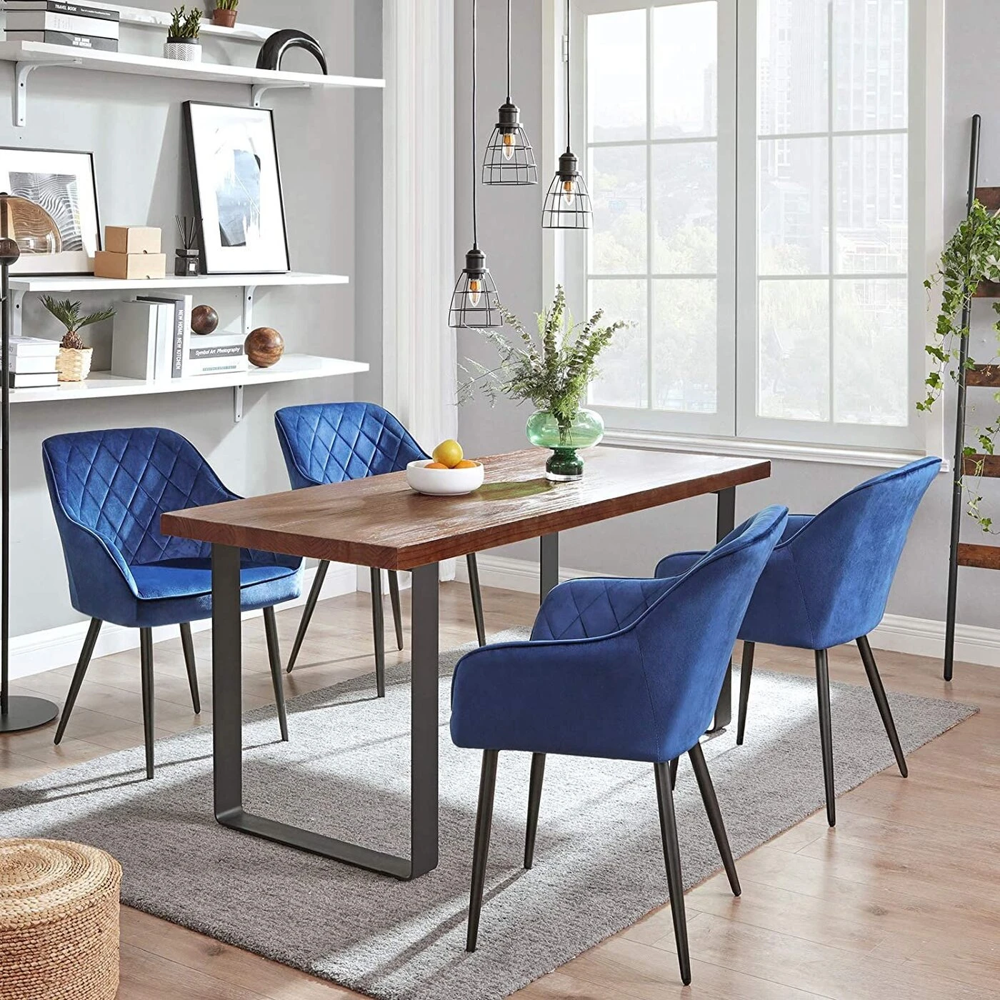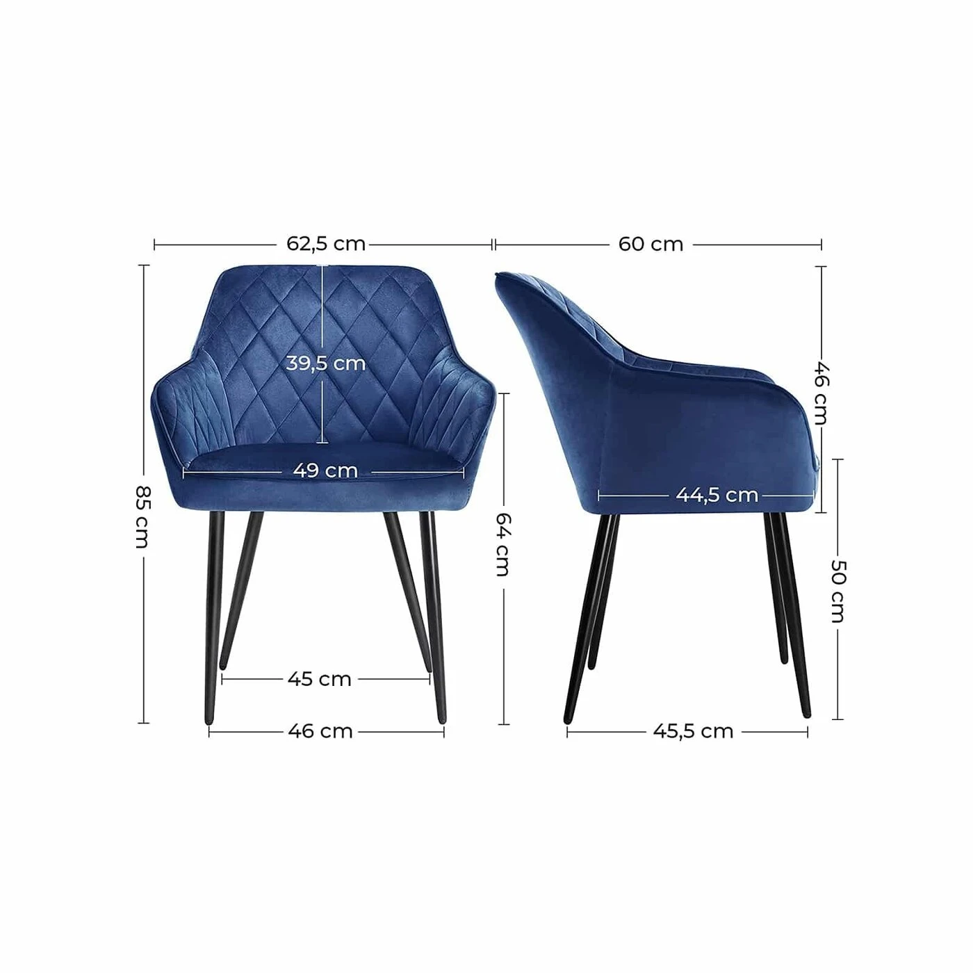 Aprašymas buvo automatiškai išverstas, gali pasitaikyti klaidų.Išbandykite patogiai: Ergonomiškas dizainas, 7 cm storio putplasčio paminkštinimas, kokybiškas aksominis užvalkalas ir patvarios metalinės kojelės, kurių apkrova iki 110 kg – šie elementai sukuria tvirtą ir patogią kėdę. Dar geriau, kad kėdė yra gražios išvaizdos, kuri įneša malonią atmosferą į bet kurį kambarį.Visada šalia jūsų: kur norite sėdėti ir atsipalaiduoti, ši minkšta kėdė jums paruošta. Ar valgomajame, svetainėje, miegamajame, darbo kambaryje ar deginantis balkone, ši kėdė visada tinka poilsio akimirkoms Išsami informacija apie gaminį: Spalva: Mėlyna Medžiaga: Milteliniu būdu dengtos metalinės kojelės, medinis viršus, aksomas, putplasčio paminkštinimas Bendras dydis: 62,5 x 60 x 85 cm (P x P x A) Sėdynės aukštis: 50 cm Sėdynės Plotis cm: 49 cm Sėdynės gylis: 44,5 cm Atlošo aukštis: 39,5 cm Porankių aukštis (nuo grindų): 64 cm Sėdynės storis sėdynės pagalvė: 7 cm Svoris: 6,5 kg Maks. statinė apkrova: 110 kgPakuotės turinys: 1 x kėdė 1 x priedų paketas 1 x instrukcija SONGMICS Pastabos: Saugokite gaminį nuo tiesioginių saulės spindulių. Saugokite gaminį nuo smailių ar aštrių daiktų, kad nesugadintumėte. Nestokite ant kėdės ir nenaudokite jos kaip laipiojimo priemonė arba kopėčios. Jei kėdė sušlapo, nedelsdami nuvalykite sausu skudurėliu. Padėkite kėdę ant lygaus paviršiaus. Grindų kilimėlis po kėde gali apsaugoti jūsų parketo grindis.