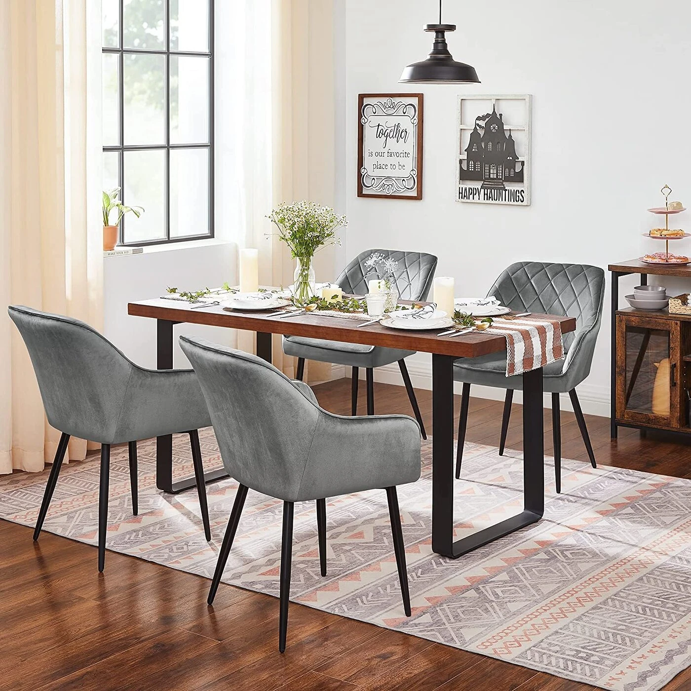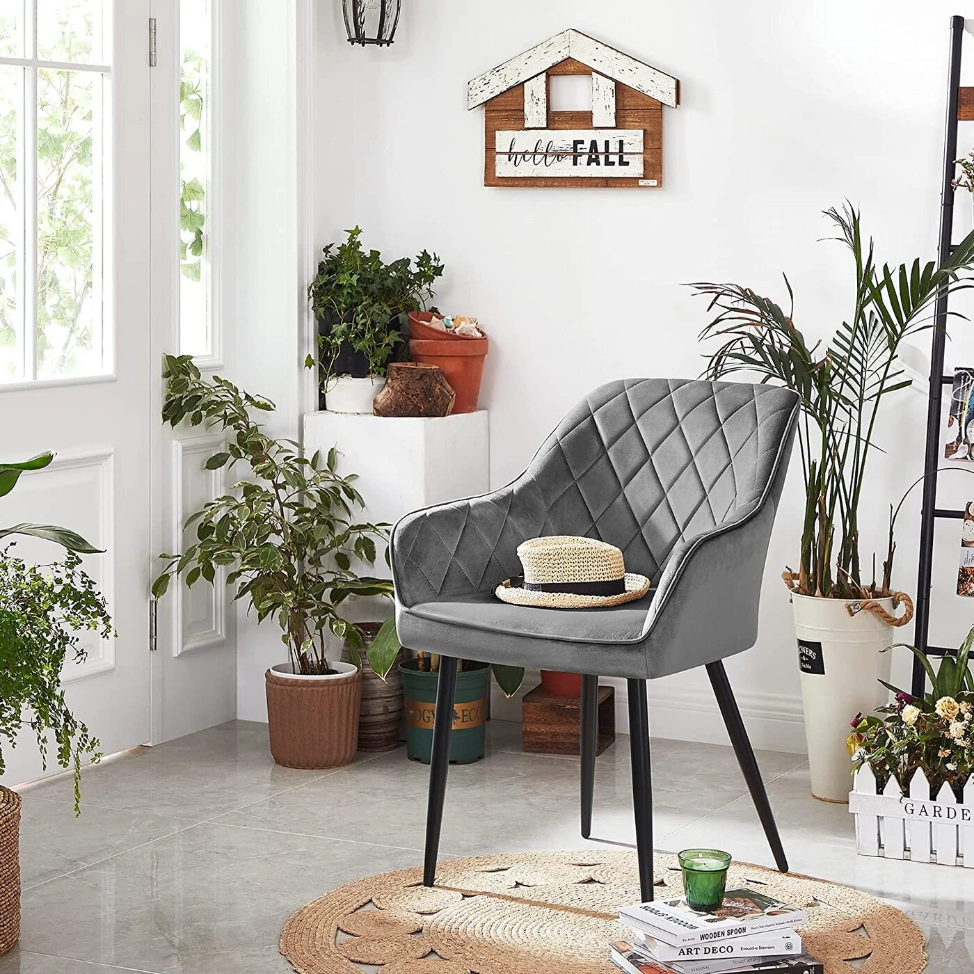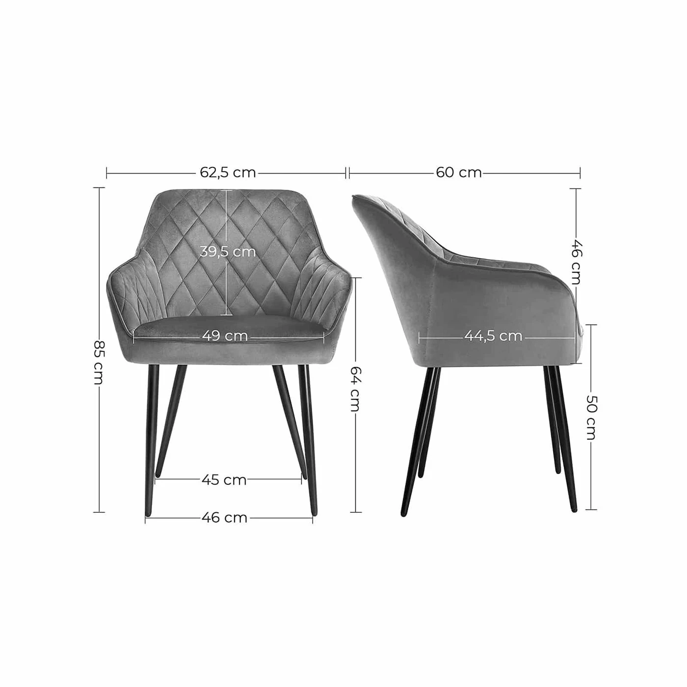 Aprašymas buvo automatiškai išverstas, gali pasitaikyti klaidų.Išbandykite patogiai: Ergonomiškas dizainas, 7 cm storio putplasčio paminkštinimas, aukštos kokybės aksominis užvalkalas ir patvarios metalinės kojelės, kurių apkrova iki 110 kg – šie elementai sukuria tvirtas ir patogias kėdes. Dar geriau, kad kėdės yra gražios išvaizdos, kuri suteikia malonią atmosferą bet kokiam kambariui.Visada šalia jūsų: kad ir kur norėtumėte sėdėti ir atsipalaiduoti, šios minkštos kėdės jums paruoštos. Nesvarbu, ar valgomajame, svetainėje, miegamajame, darbo kambaryje ar deginantis balkone, šios kėdės visada tiks poilsio akimirkoms Išsami informacija apie gaminį: Spalva: šviesiai pilka Medžiaga: milteliniu būdu dengtos metalinės kojelės, medinis viršus, aksomas, putplasčio paminkštinimas Kėdės dydis: 62,5 x 60 x 85 cm (P x P x A) Sėdynės aukštis: 50 cm Sėdynės Plotis cm: 49 cm Sėdynės gylis: 44,5 cm Atlošo aukštis: 39,5 cm Porankių aukštis (nuo grindų): 64 cm Storis sėdynės pagalvėlė: 7 cm Svoris: 6,5 kg Maks. statinė vienos kėdės apkrova: 110 kgPakuotės turinys: 2 x kėdė 2 x priedų paketas 2 x instrukcijos SONGMICS Pastabos: Saugokite gaminį nuo tiesioginių saulės spindulių. Saugokite gaminį nuo smailių ar aštrių daiktų, kad nesugadintumėte. Nestokite ant kėdžių ir nenaudokite jomis kaip laipiojimo priemonė arba kopėčios. Jei kėdes sušlapo, nedelsdami nuvalykite jas sausa šluoste. Padėkite kėdes ant lygaus paviršiaus. Grindų kilimėlis po kėdėmis gali apsaugoti jūsų parketo grindis.