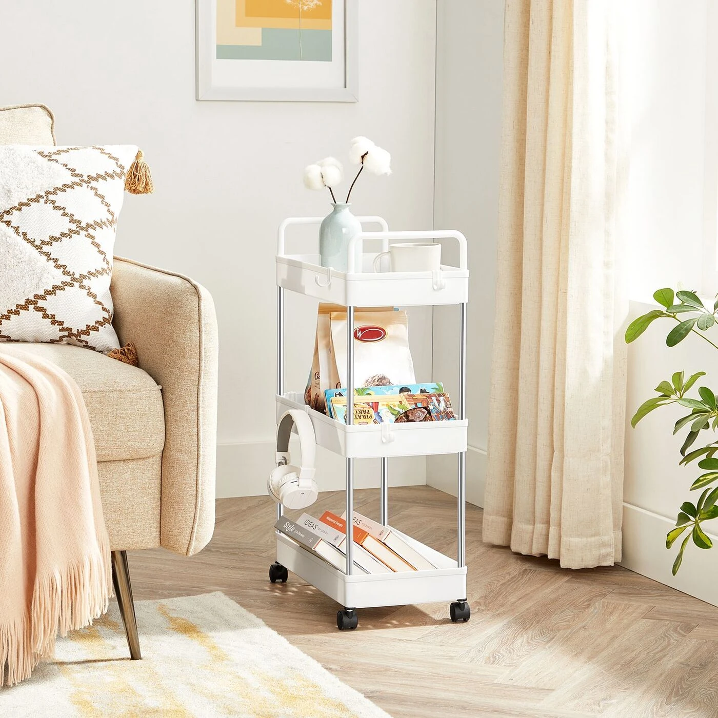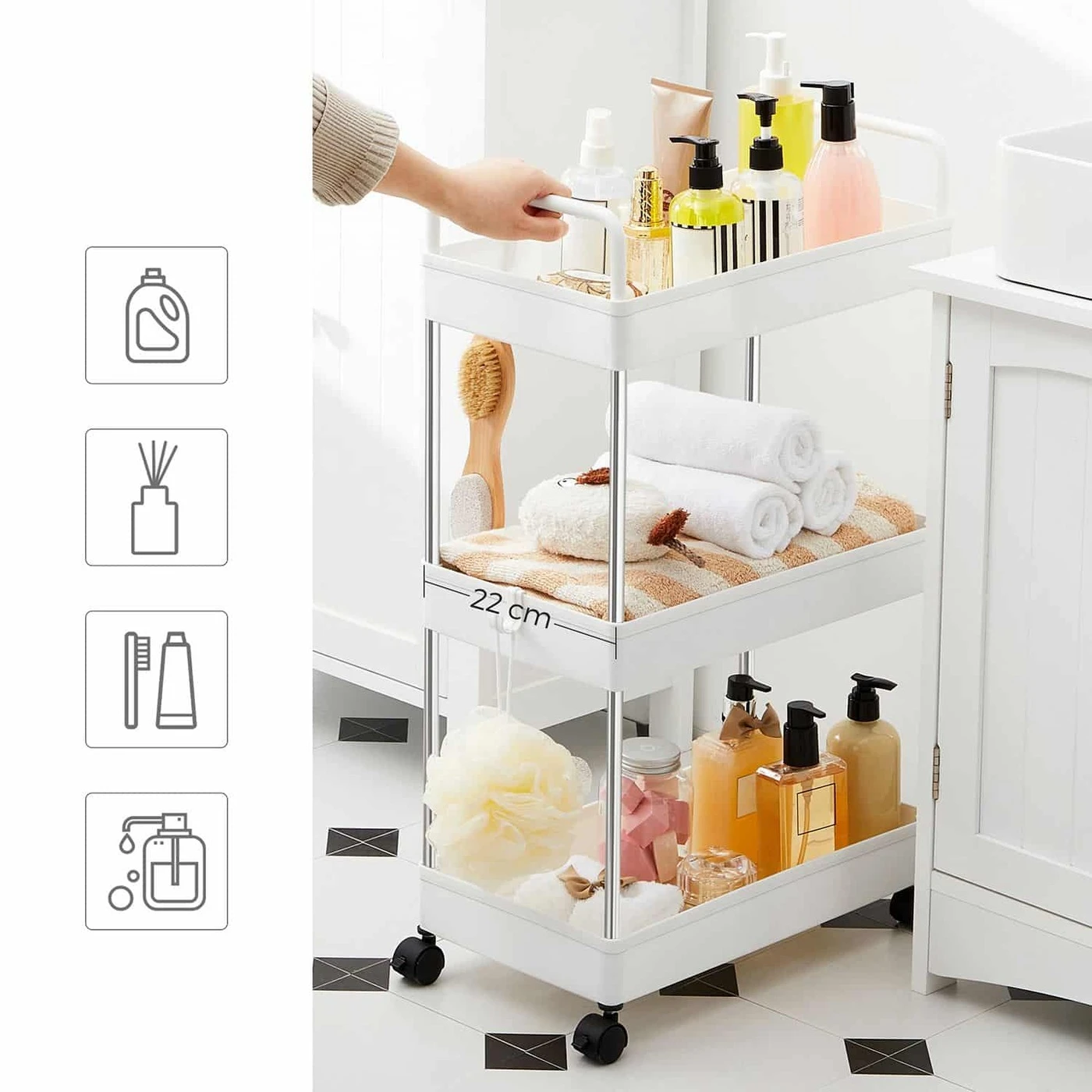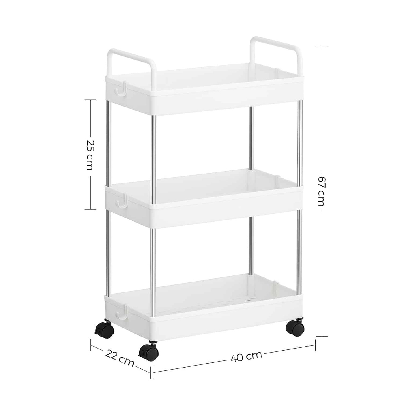 Aprašymas buvo automatiškai išverstas, gali pasitaikyti klaidų. Informacija apie gaminį: - Spalva: balta - Medžiaga: nerūdijantis plienas, PP (polipropilenas) - Bendras dydis: 40 x 22 x 67 cm (P x P x A) - Svoris: 1,2 kg - Maksimali statinė apkrova vienam lygiui: 5 kg pristatymas: - 1 x vežimėlis - 6 x kabliukai - 1 x instrukcijosSONGMICS Pastabos: - Sunkesnius daiktus laikykite apatinėje lentynoje ir tolygiai padėkite arba pakabinkite ant kiekvienos pakopos, kad neapvirstumėte. - Montuodami nespauskite vamzdelių galų tiesiai rankomis, kad nesusižeistumėte.