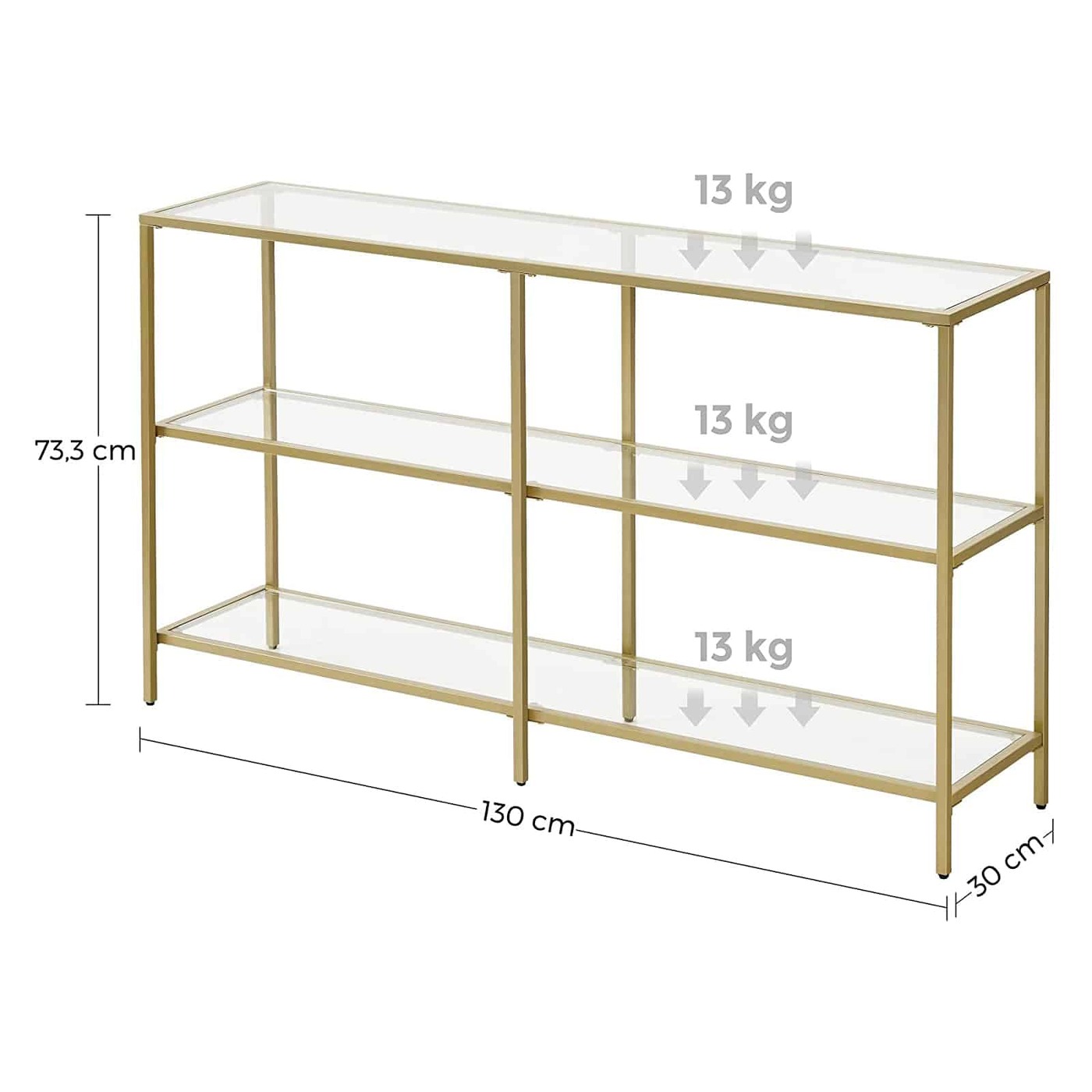 Aprašymas buvo automatiškai išverstas, gali pasitaikyti klaidų. Išsami informacija apie gaminį: - Spalva: auksas - Medžiaga: plienas, grūdintas stiklas - Bendras dydis: 130 x 30 x 73 cm (P x P x A) - Svoris: 20,1 kg - Didžiausia statinė apkrova: 40 kgPristatymo komplektas:- 1 x konsolinis staliukas- 1 x priedų paketas- 1 x apsaugos nuo posvyrio įtaisas- 1 x instrukcijaVASAGLE Pastabos:- Saugumo sumetimais vaikams draudžiama lipti ant gaminio ar žaisti su juo.- Pritvirtinkite tai. gaminį prie pateikto apsaugos nuo pakrypimo įtaiso prie sienos, kad būtų užtikrintas saugus naudojimas.