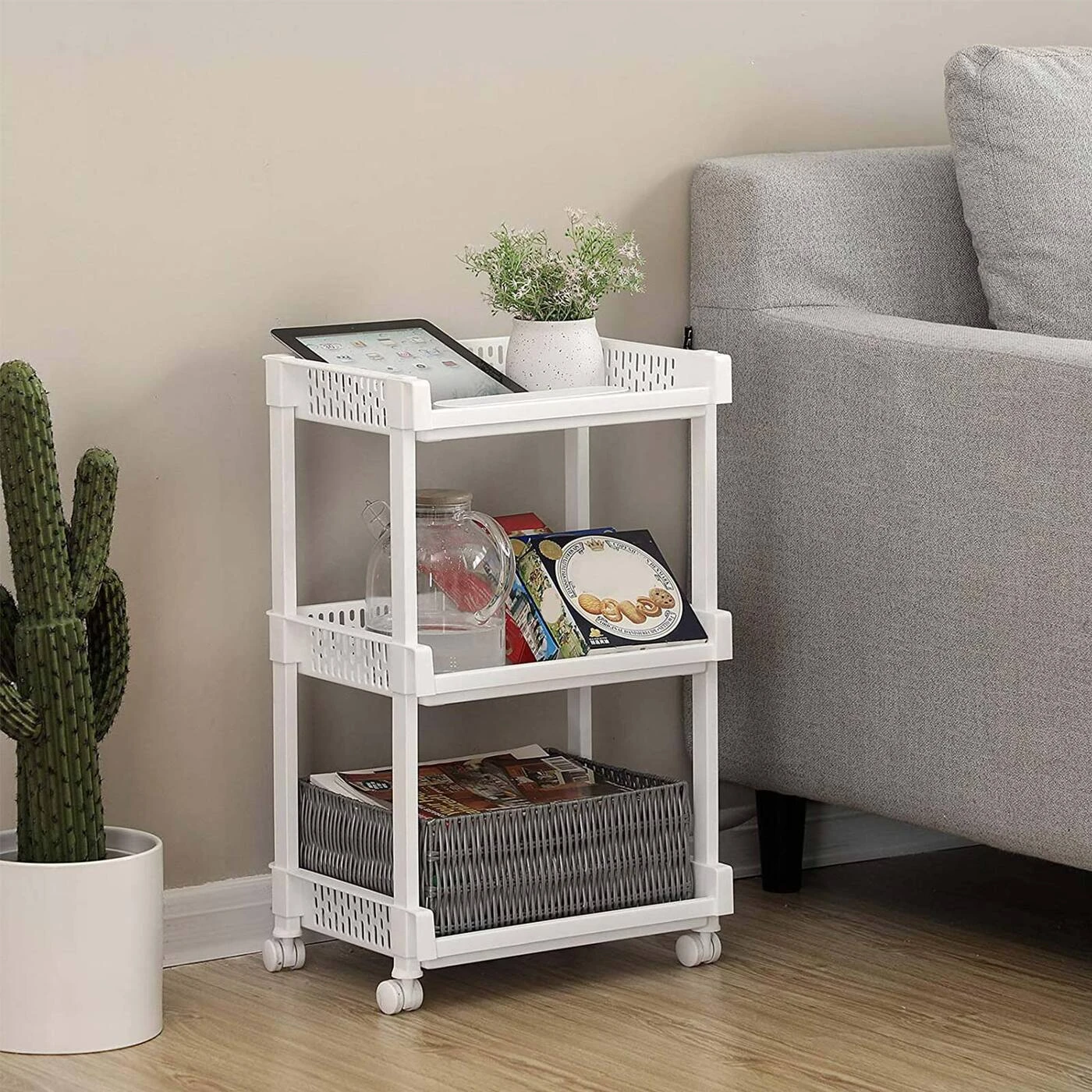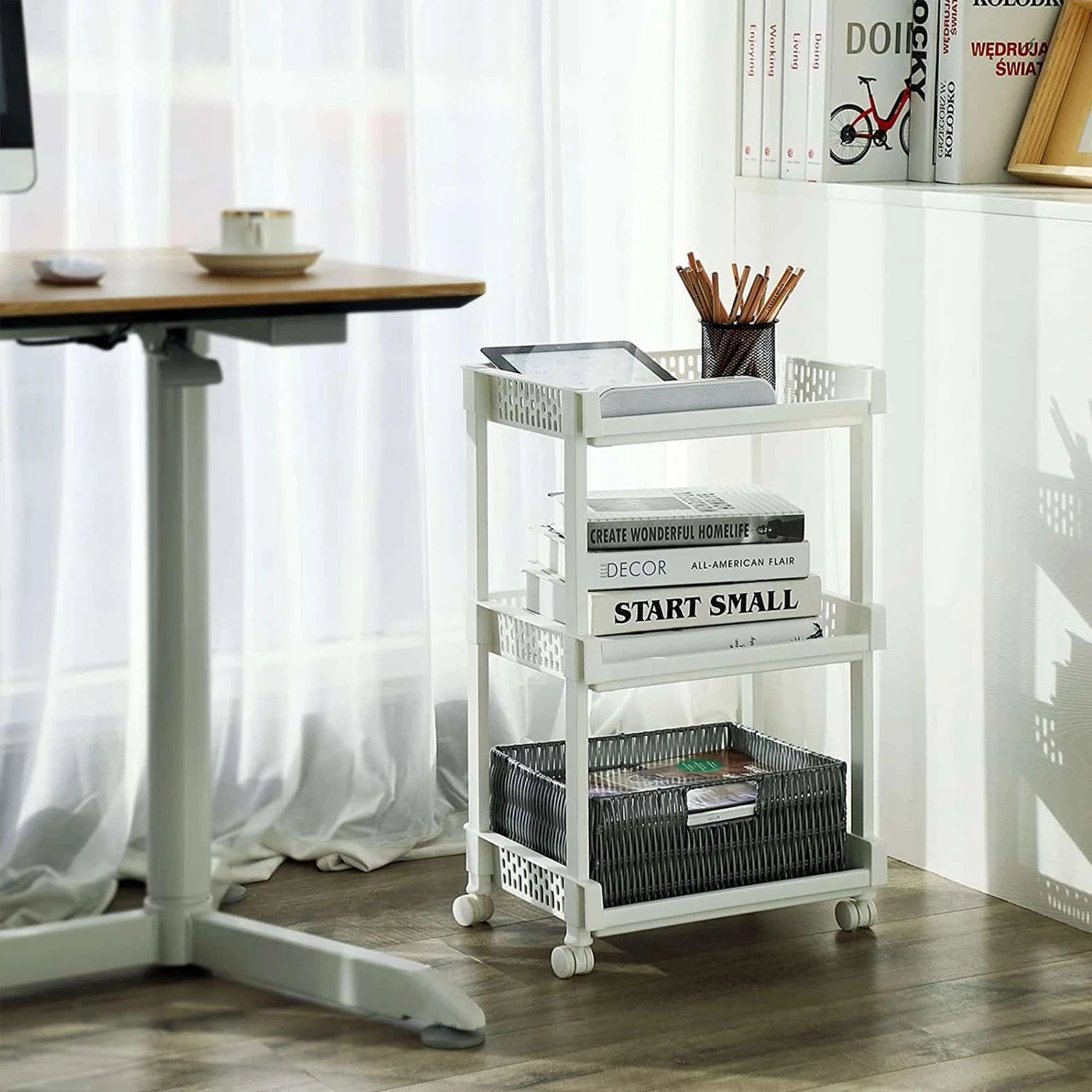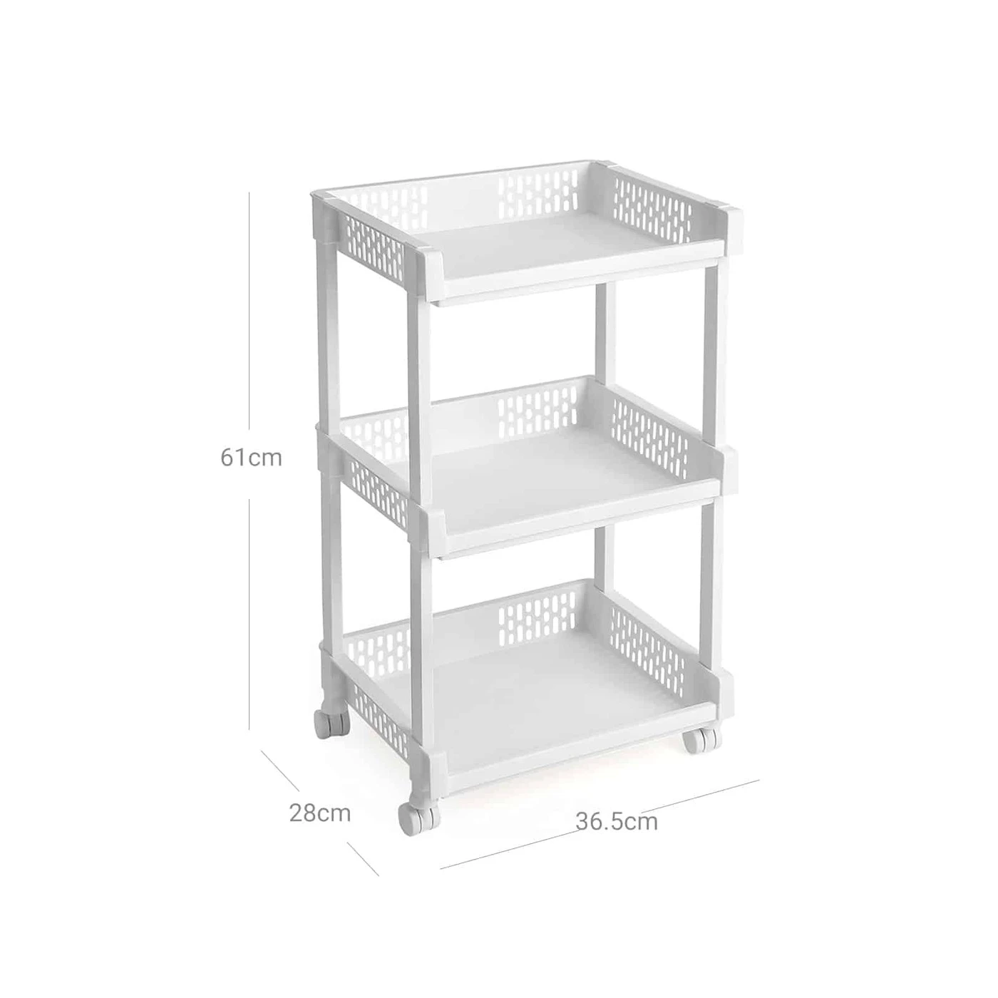 Aprašymas buvo automatiškai išverstas, gali pasitaikyti klaidų.Daug vietos saugojimui ir mažai vietos: 36,5 x 28 x 61 cm dydžio vežimėlis turi 3 daiktų laikymo skyrius, kurie gerai paskirstyti lentynoje. Savo vietą gali rasti įvairūs virtuvės reikmenys, bakalėjos prekės, kosmetika, žaislai ar byla biure. Skydai šoninėse daiktadėžių sienelėse suteikia lentynai žaismingą dizainą. Tvirtas ir patikimas:Pagaminta iš baltos spalvos PP plastiko, pati lentyna yra atspari, tačiau labai stabili ir tvirta. Jį galima lengvai stumti ir traukti ant 4 universalių ratų. Jo apkrova 15 kilogramų Lengva valyti ir surinkti: iliustruotose instrukcijose paaiškinama, kaip surinkti lentyną. Atskiros dalys tiesiog sujungiamos viena į kitą, o tai atliekama be jokių pastangų ir per kelias minutes. Perkeliant arba nenaudojant lentyną galima taip pat greitai išardyti.Informacija apie gaminį: Spalva: balta Medžiaga: PP plastikas Gaminio matmenys: 36,5 x 28 x 61 cm (P x A x G) Svoris: 1,25 kg Keliamoji galia: 15 kg Pristatymo komplektas: 1 x vežimėlis 1 x instrukcijos (DE, EN, FR, ES, IT) SONGMICS Pastabos: norėdami užtikrinti, kad jungtys būtų sandarios ir lentyna nepažeista, NESUNINKITE ir NENAUDOKITE gaminio pakartotinai. Kad nesugadintumėte gaminio, nelaikykite jo nuo šilumos šaltinių.