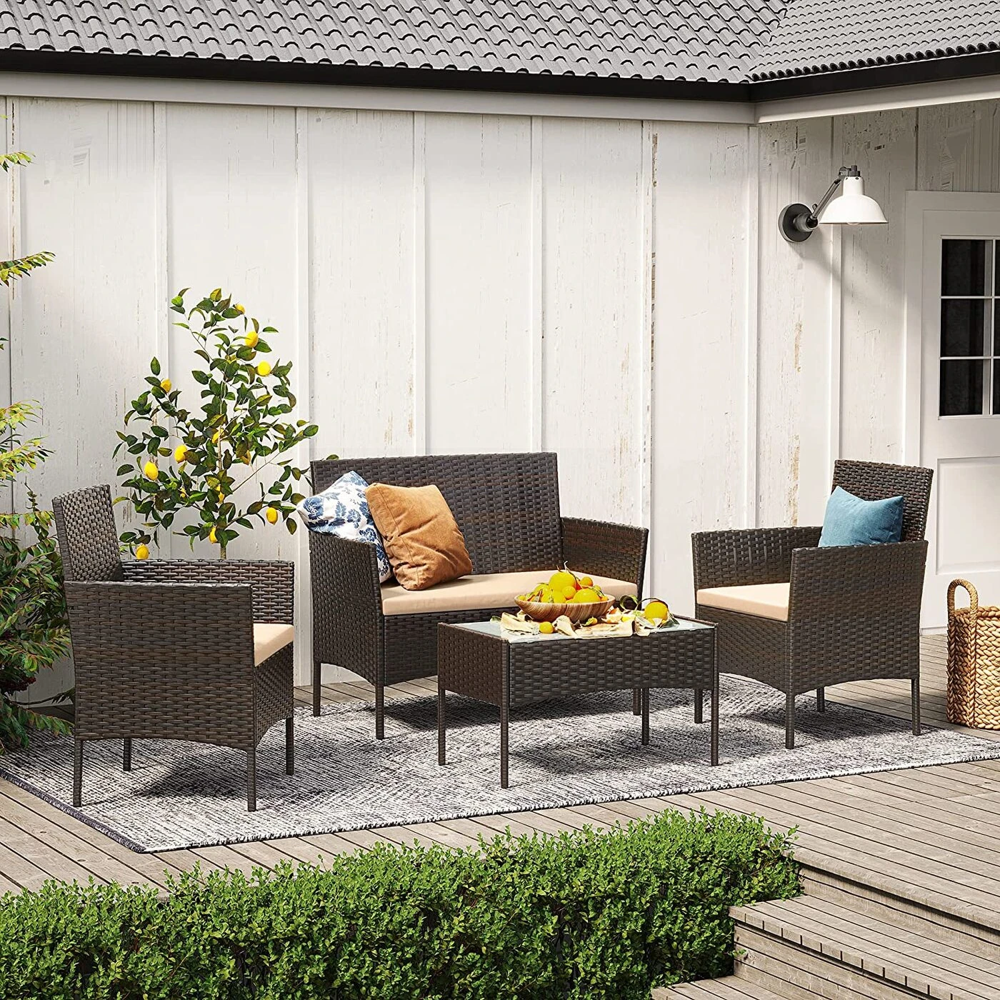 Aprašymas buvo automatiškai išverstas, gali pasitaikyti klaidų.Ar praleistas laikas su šeima pripildo jūsų širdį džiaugsmo? Atsisėskite prie šio sodo baldų komplekto iš SONGMICS ir praleiskite kokybišką laiką lauke su savo artimaisiais! Jauskitės patogiai: sodo kėdės ir sofa turi į išorę išlenktus porankius ir daugiau nei 90° pasvirusią atlošą, kad atitiktų formą. savo kūną ir paremkite stuburą. Mėgaukitės laisvalaikiu lauke: pastatykite lauko baldų komplektą sode ar kieme, kad sukurtumėte poilsio vietą. Galite paskaityti knygą tingią popietę, pabendrauti su draugu pavėsyje ar mėgautis maloniu vasaros vėjeliu prie baseino. Su šia sėdimų vietų grupe viskas įmanoma!SONGMICS Pastabos: Šį baldų komplektą rekomenduojame uždengti esant blogam orui arba žiemą. Taip pailgėja tarnavimo laikas. Šiuos gaminius valykite tik drėgna šluoste.Siekiant užtikrinti saugų naudojimą, negalima viršyti maksimalios apkrovos. Surinkimo metu tuoj pat neužveržkite varžtų. Tik įsukus visus varžtus reikia juos atsargiai priveržti.Jei gaminys kliba, sureguliuokite varžtus, kad gaminys stabilizuotųsi Išsami informacija apie gaminį: Spalva: ruda-tape Kėdės, stalo ir sofos medžiaga: cinkuotas metalinis rėmas, PE polietilenas rotangas, grūdintas stiklas, pagalvėlės medžiaga: VFT paminkštinimas (Vertical Fiber Technology), užvalkalas iš poliesterio audinio, kėdės dydis: 56,5 x 54,5 x 81,5 cm (P x P x A), sofos dydis: 99 x 54, 5 x 81,5 cm (P x P x A) Stalo dydis: 71 x 41 x 39 cm (P x P x A) Bendras svoris: 25,4 kg Maks. statinė vienos kėdės apkrova: 150 kgMaks. statinė sofos apkrova: 200 kgMaks. statinė stalo apkrova: 30 kg