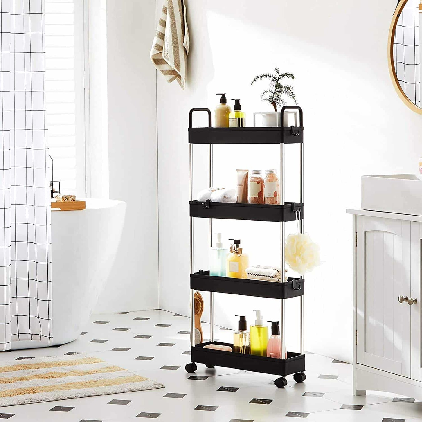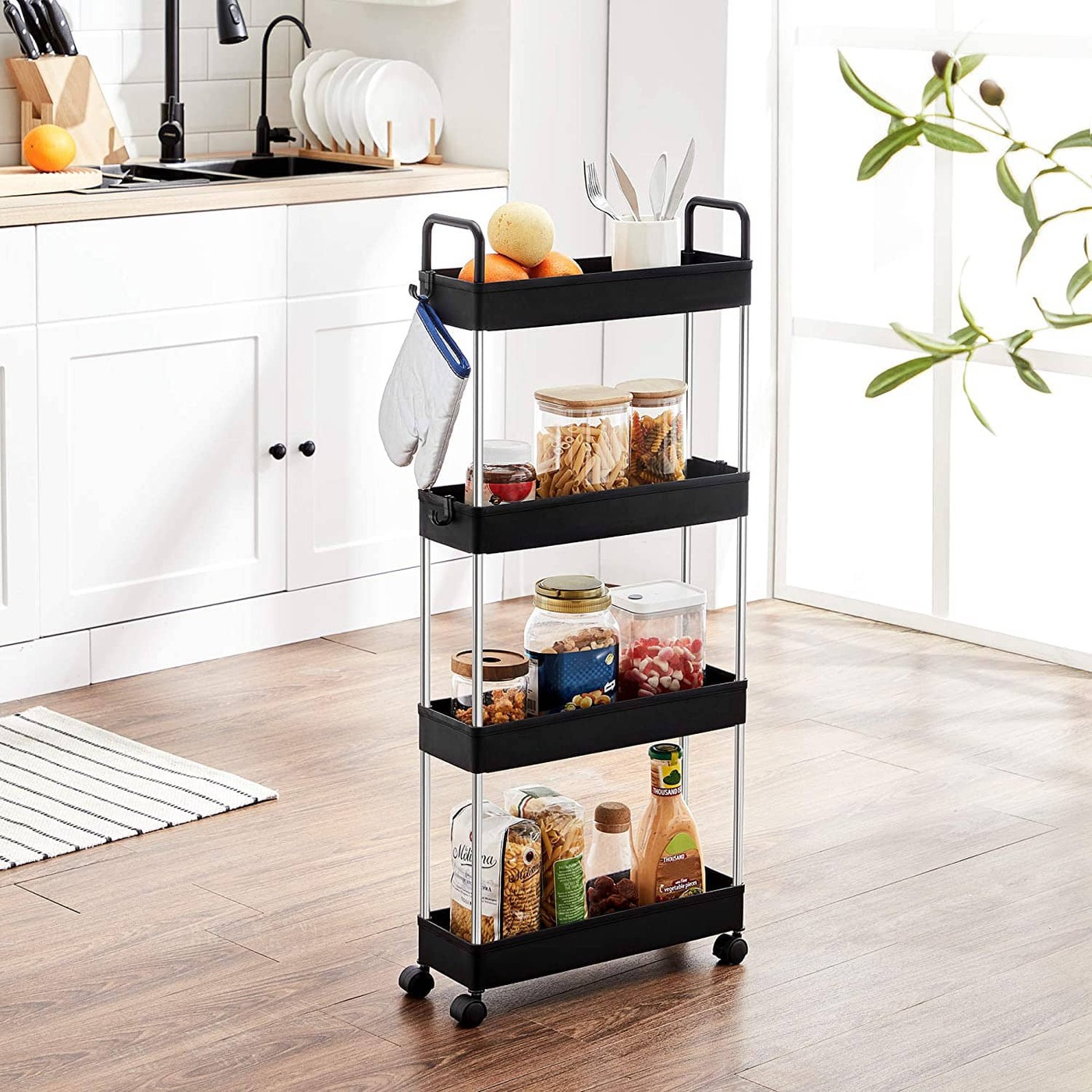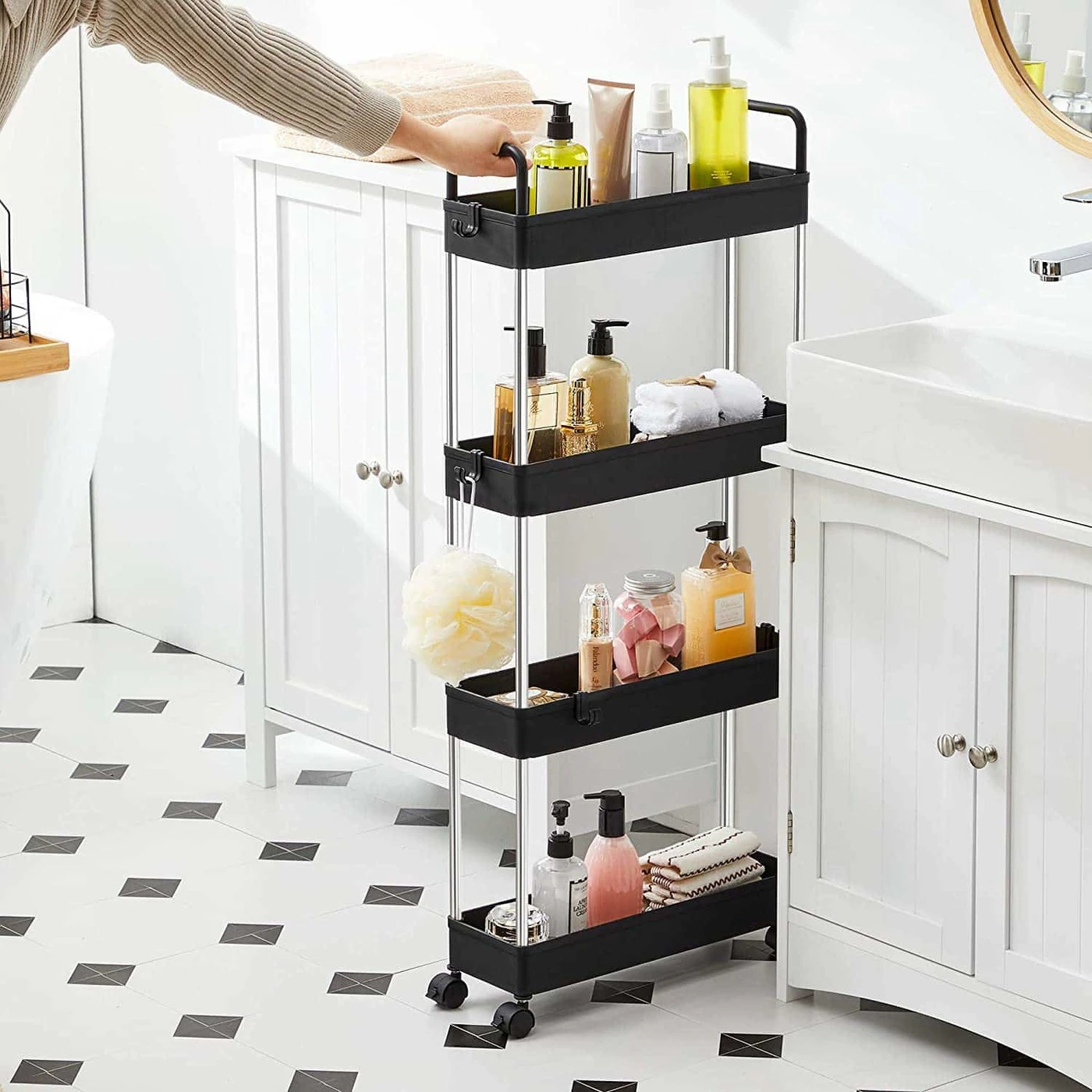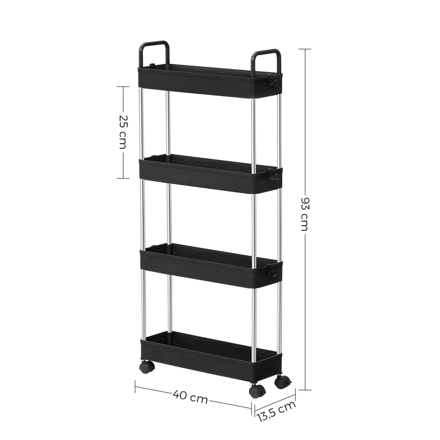 Aprašymas buvo automatiškai išverstas, gali pasitaikyti klaidų.Šalia savo prekystalio: Padėkite prieskonius, padažus, kepimo aliejus ir kitus dažniausiai naudojamus maisto gaminimo ingredientus ant šios virtuvės lentynos ir įstumkite į nedidelę nišą, esančią šalia savo prekystalio. Taigi druska, pipirai ir alyvuogių aliejus yra paruošti, kai baigiate. Šalia vonios: pripildykite šią praktišką vonios lentyną vonios putomis, šampūnu ir rankšluosčiais, susukite ją šalia vonios ir šokite į karštą burbulinę vonią! Kitas prie skalbimo mašinos : Sudėkite ploviklius ir valymo priemones ant šio lankstaus vežimėlio ir pastumkite jį šalia skalbimo mašinos. Skalbimas yra tik pusė pastangų.Informacija apie gaminį: - Spalva: juoda - Medžiaga: nerūdijantis plienas, PP (polipropilenas) - Bendras dydis: 40 x 13,5 x 93 cm (P x P x A) - Svoris: 1,3 kg - Maksimali statinė apkrova vienam lygiui: 5 kgPakuotės turinys :- 1 x Vežimėlis- 6 x Kabliukai- 1 x Instrukcijos SONGMICS Pastabos:- Sunkesnius daiktus dėkite ant apatinės lentynos ir tolygiai pastatykite arba pakabinkite juos kiekviename lygyje, kad neapvirstumėte.- Statydami stumkite, nedėkite rankų tiesiai ant vamzdžių galus, kad išvengtumėte sužeidimų.