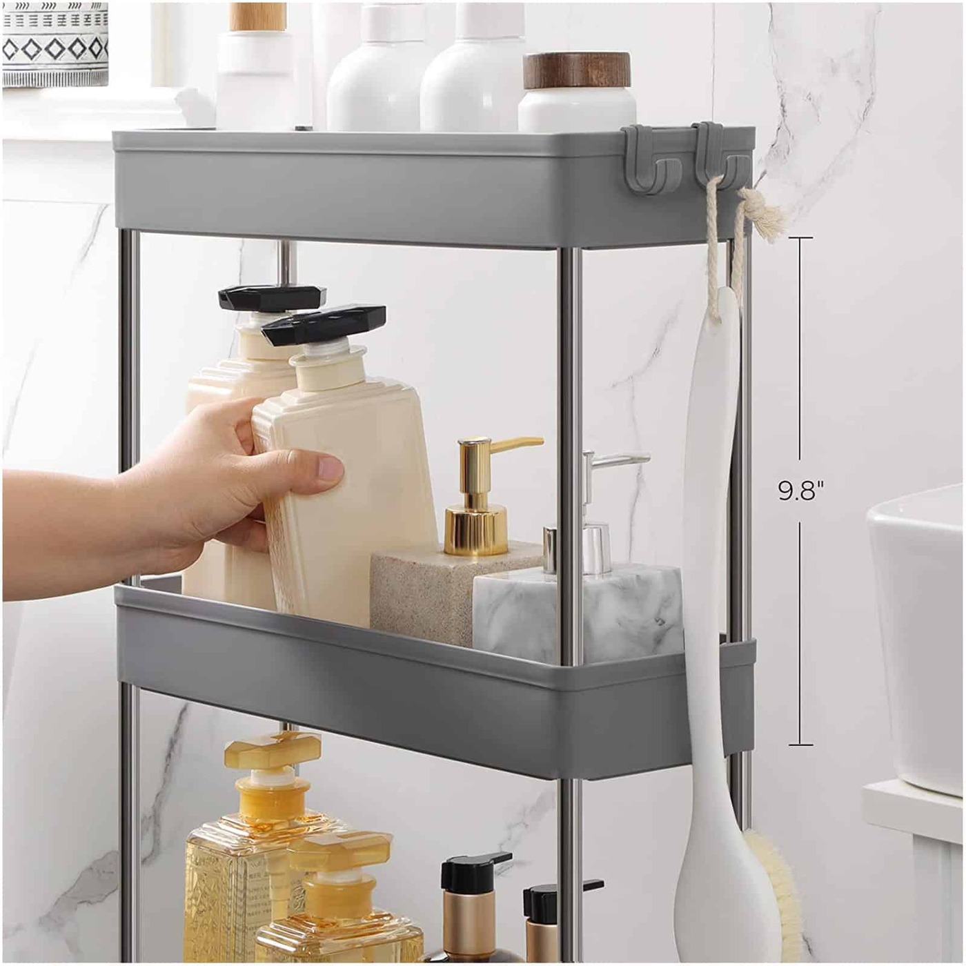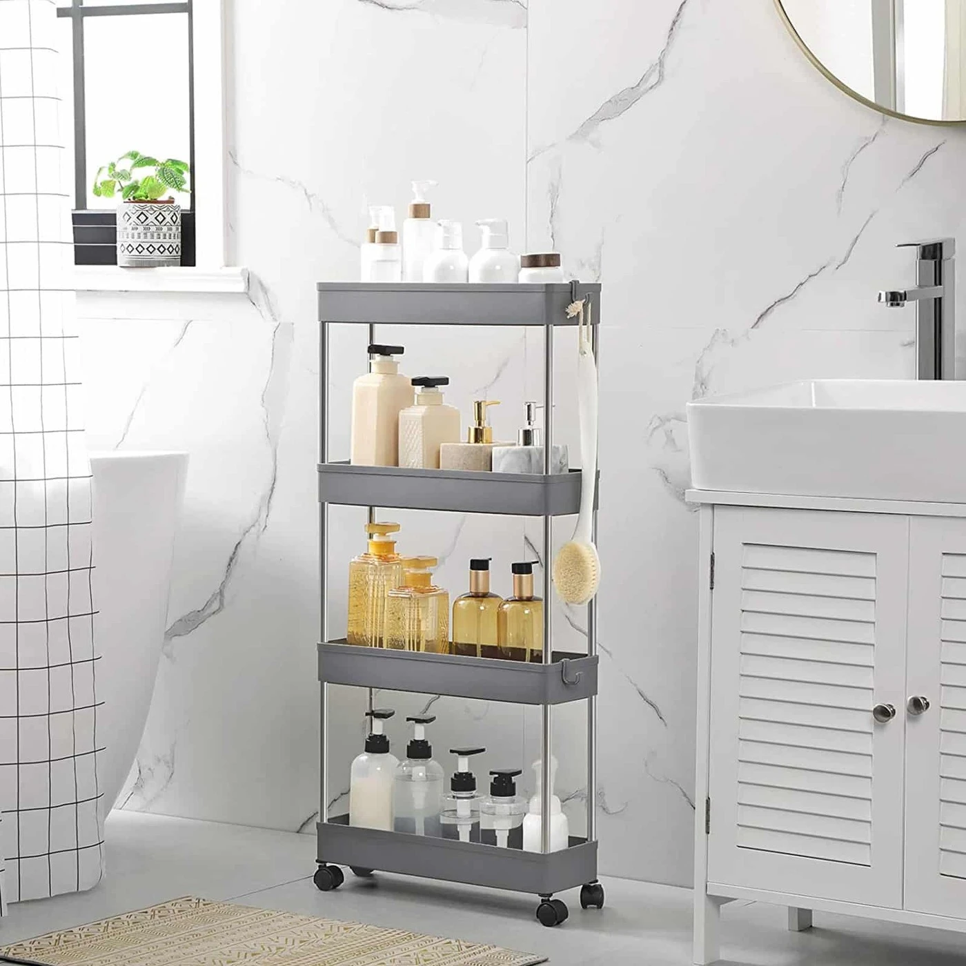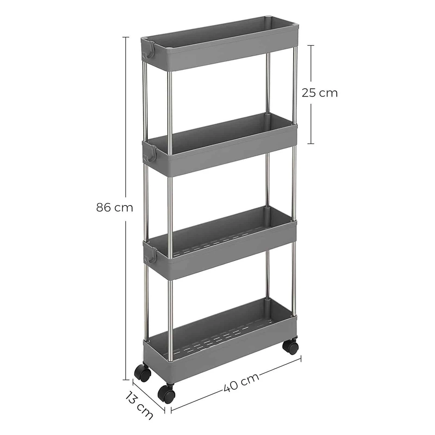 Aprašymas buvo automatiškai išverstas, gali pasitaikyti klaidų.Ar kai kurių daiktų, kuriuos naudojote vakar, šiandien dingo ir jūs turite skirti daug laiko jų paieškai? Nesijaudinkite, šis SONGMICS vežimėlis padės jums užbaigti tą erzinantį slėpynių žaidimą! Viskas pasiekiama Šiame vežimėlyje yra 4 aukštos kokybės PP plastikinės lentynos ir tvirti metaliniai vamzdžiai, todėl jame yra pakankamai vietos visiems tiems daiktams, kurie dar nerado nuolatinės vietos jūsų namuose. Universalus automobilis taip pat gali be problemų atlaikyti jų svorį. Be to, dėl savo kompaktiško dydžio (40 x 12,5 x 86 cm) serviravimo vežimėlis puikiai tinka vonios kambaryje grožio priemonėms laikyti, virtuvėje virtuvės reikmenims arba biure dokumentams laikyti. Jei norite, kad dažnai naudojami daiktai visada būtų po ranka, šis SONGMICS gaminys kaip tik jums!Išsami informacija apie gaminį: - Spalva: Pilka - Medžiaga: PP (polipropilenas), metaliniai vamzdžiai - Bendras dydis: 40 x 12,5 x 86 cm (I x P x A) - Svoris: 1,3 kg - Maksimali statinė apkrova: 20 kg ( 5 kg) vienam lygiui) Pristatymo apimtis: - 1 x vežimėlis - 3 x kabliukai - 1 x vadovas (DE, EN, DE, FR, ES, IT) SONGMICS Pastabos: - Surinkite gaminį tik taip, kaip aprašyta šiame vadove. Nenaudokite jėgos išmontuodami. Kiekviena lentyna gali būti pakrauta iki 5 kg. Ant gaminio viršaus nelaikykite sunkesnių daiktų.