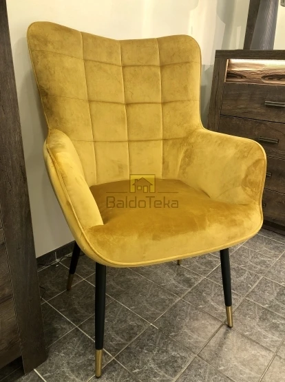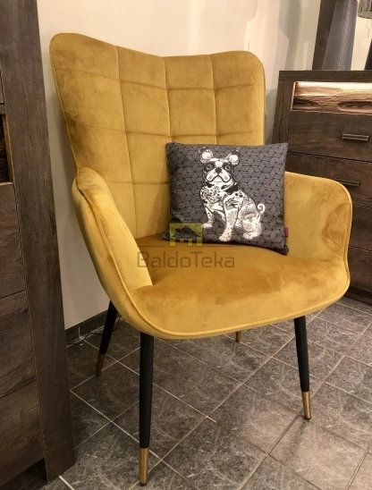 Spalva – geltona garstyčių/juodos kojelės su aukso spalvos užbaigimais.