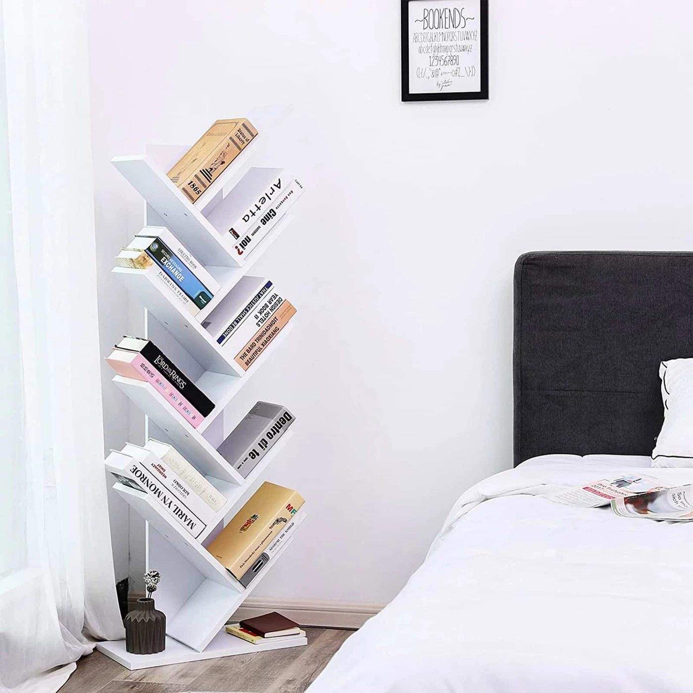 Aprašymas buvo automatiškai išverstas, gali pasitaikyti klaidų.Unikalus dizainas šiuolaikiniam dekorui Dėl unikalaus medžio formos dizaino knygų lentynoje yra 8 lentynos, kuriose yra daug vietos dideliam knygų kiekiui, o kartu yra stilingas ir patrauklus baldas jūsų kambariui Tvirtas ir saugus Medienos drožlių plokštės rėmas su įtrauktas apsaugos nuo apsivertimo mechanizmas užtikrina stabilumą ir tvirtumą net ir pilnai pakrovus knygomis. Saugus vaikams.Universalus Atvira knygų spinta suteikia netrukdomą vaizdą ir lengvą prieigą prie knygų ir ji telpa bet kurioje patalpoje: svetainėje, miegamajame, žaidimų kambaryje, įėjime ir balkone (neatsparus oro sąlygoms). Išsami informacija apie gaminį: - Spalva: balta - Medžiaga: medžio drožlių plokštės - Matmenys : 50 x 141,5 x 25 cm (P x A x G) - Svoris: 13 kg - Maksimali apkrova: 10 kg lentynaiPristatymo komplektas:- 1 x knygų lentyna- 1 x maišelis priedams- 1 x instrukcijos (DE, EN, FR, IT, ES) VASAGLE Pastabos:- Nuvalykite knygų lentyną drėgna šluoste ir nušluostykite sausai.- Pritvirtinkite gaminį prie Saugus ant sienos su apsauga nuo apvirtimo.