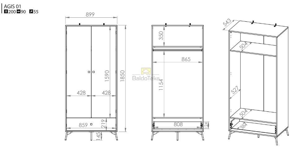 Plotis/Aukštis/Gylis: 90/200/55 cm.