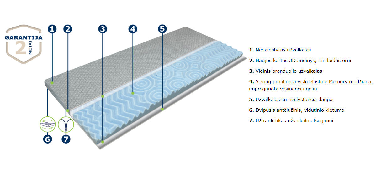 Pagrindas pagamintas iš vėsinančios viskozės elastinės medžiagos „Memory“ su ventiliaciniais kanalais.