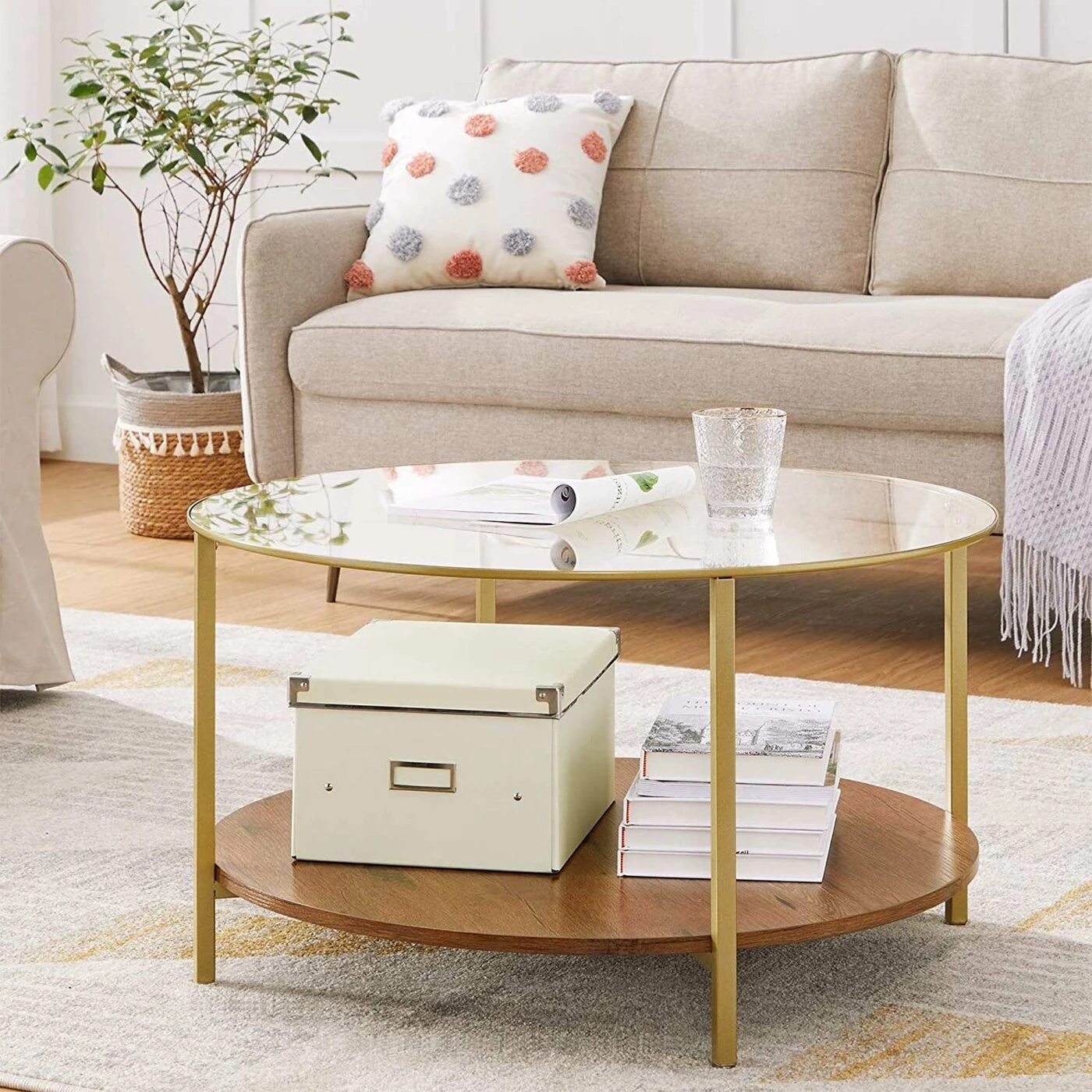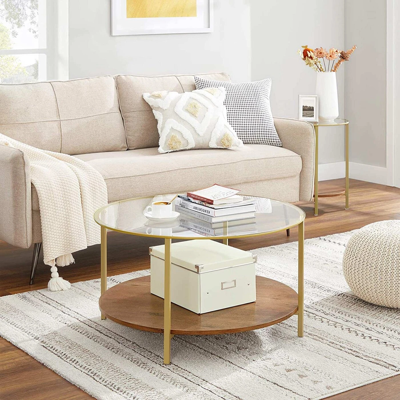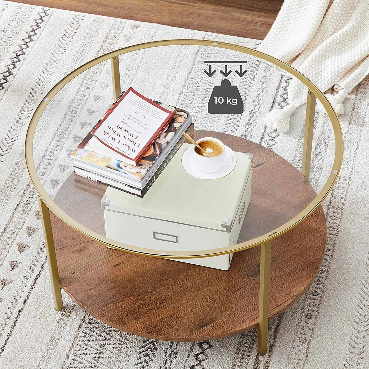 Aprašymas buvo automatiškai išverstas, gali pasitaikyti klaidų.Prekės informacija: - Spalva: lazdyno-auksinė - Medžiaga: medžio drožlių plokštė, plienas, grūdintas stiklas - Dydis: 80 x 45,5 cm (Ø x A) - Svoris: 12,8 kg - Maksimali statinė stiklo paviršiaus apkrova: 10 kg - Maks. apatinės lentynos statinė apkrova: 10 kgPristatymo komplektas: - 1 x kavos staliukas - 1 x priedų paketas - 1 x vadovas (DE, EN, FR, ES, IT) VASAGLE Pastabos: - Saugumo sumetimais vaikams draudžiama lipti ant gaminio ar žaisti su juo .