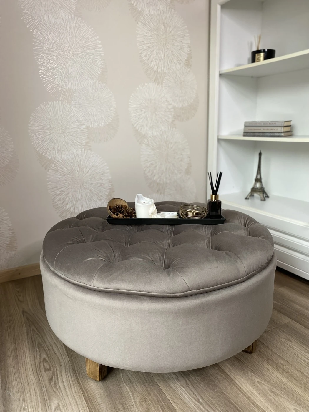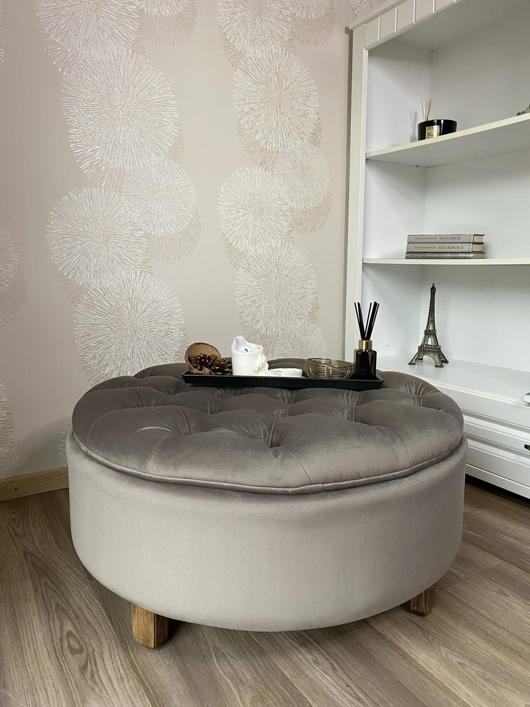 Naujas, rankų darbo pufas. Puikiai tinka naudoti namuose kaip pufą, kojų kėdutę, staliuką ar interjero detalę.