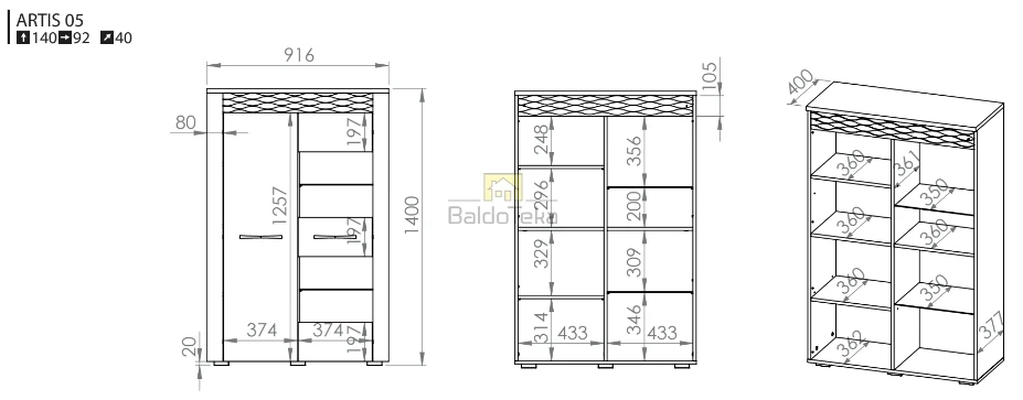 Plotis/Aukštis/Gylis: 92/140/40 cm.