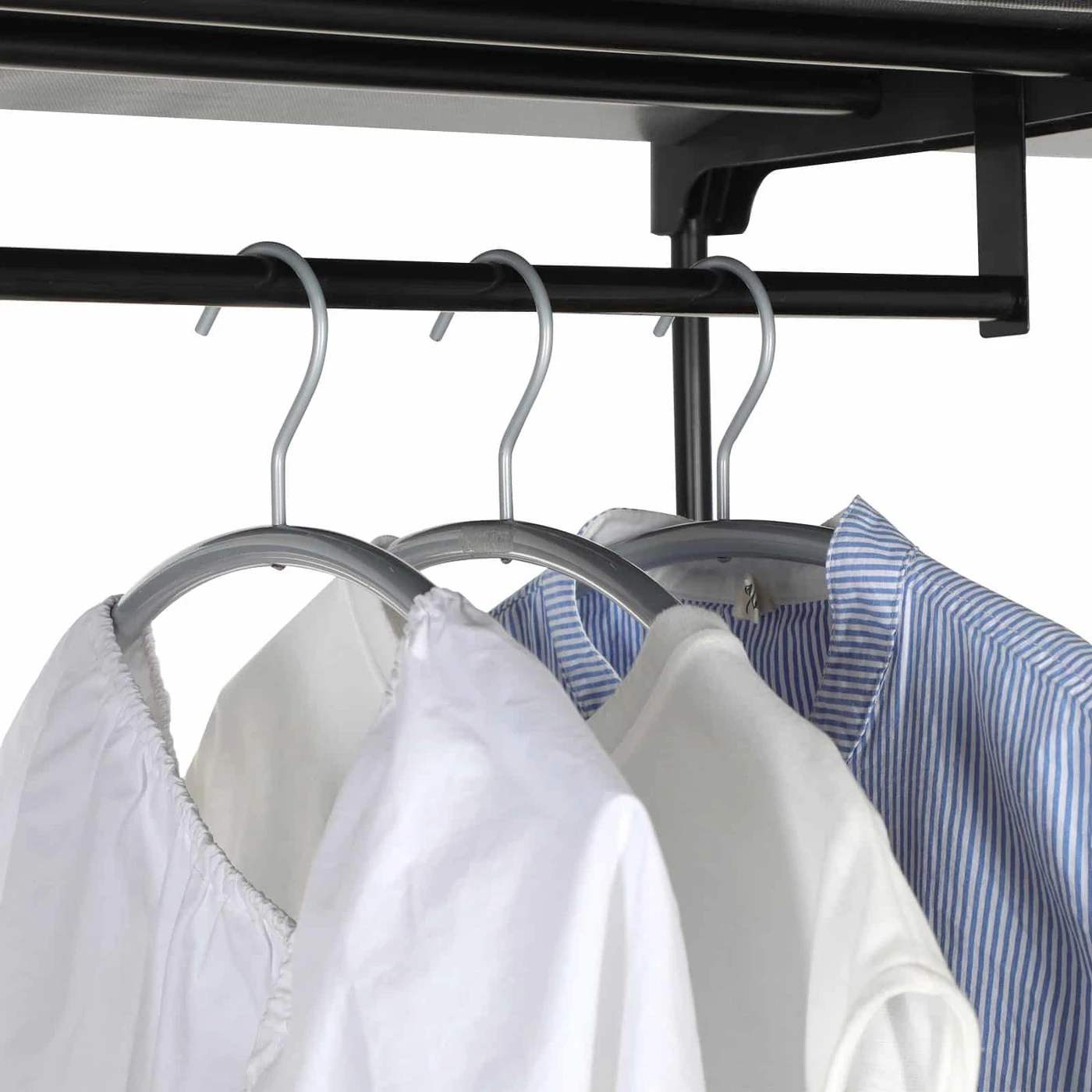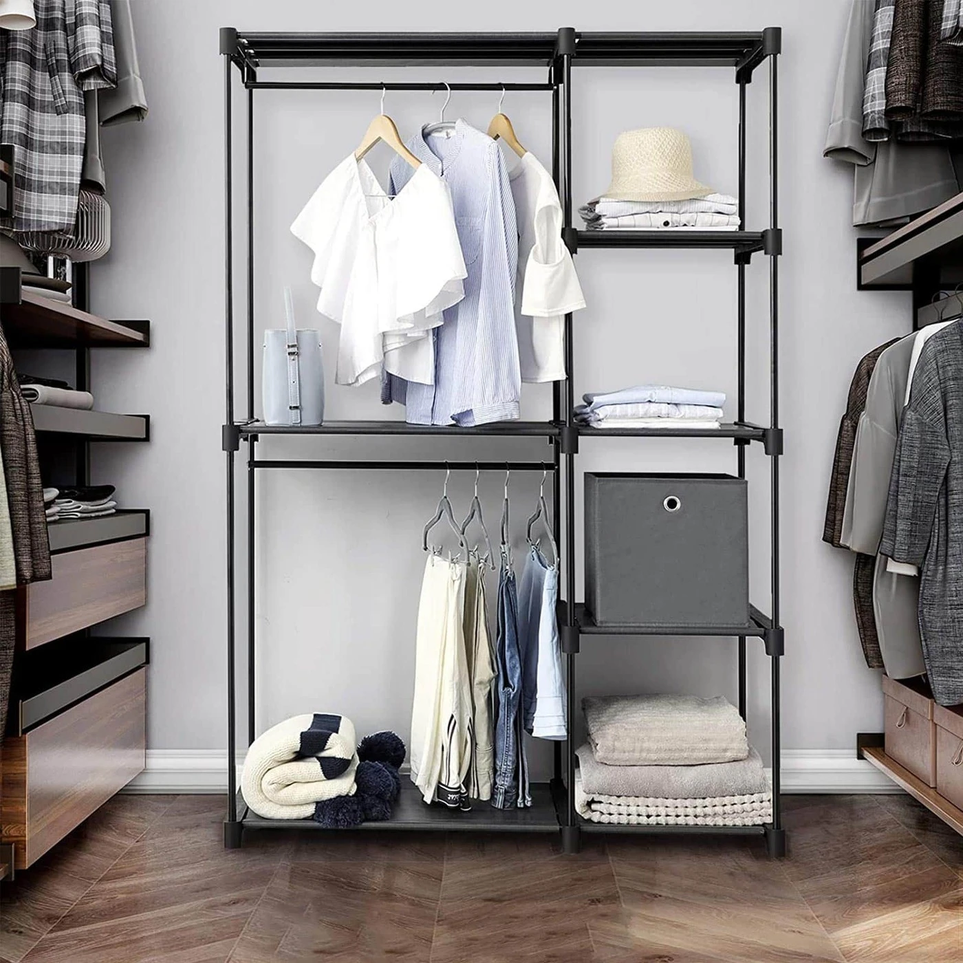 Aprašymas buvo automatiškai išverstas, gali pasitaikyti klaidų.Informacija apie gaminį: Spalva: juoda Medžiaga: neaustinis audinys, metaliniai vamzdeliai, plastikinės jungtys Dydis: 112 x 43 x 165 cm (I x P x A) Svoris: 4,4 kg Maks. Lentynos keliamoji galia: 8 kg Maks. Drabužių kabyklos keliamoji galia: 30 kg Maks. Visos lentynos keliamoji galia: 80 kgPristatymo komplektas: 1 x medžiaginė spintelė 1 x instrukcija (DE, EN, FR, ES, IT) SONGMICS Pastabos: Maksimali apkrova tekste nurodo didžiausią statinį svorį.