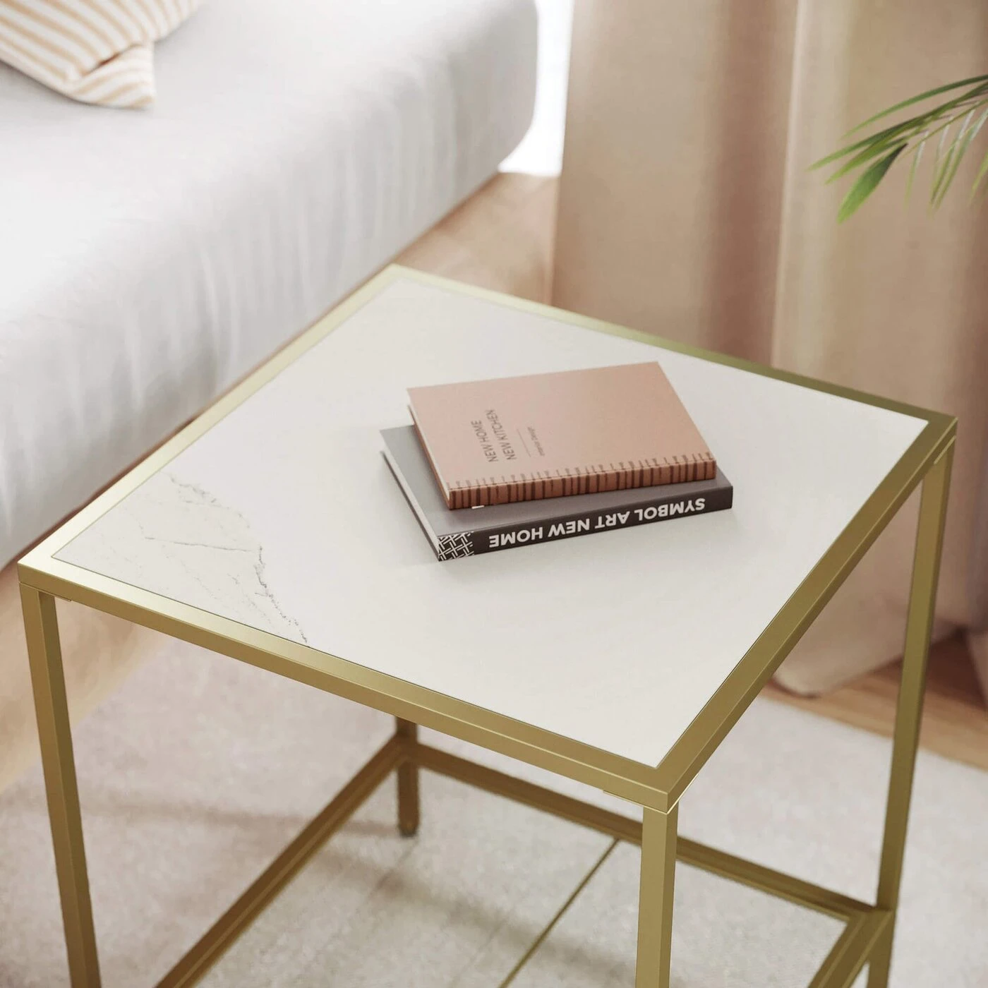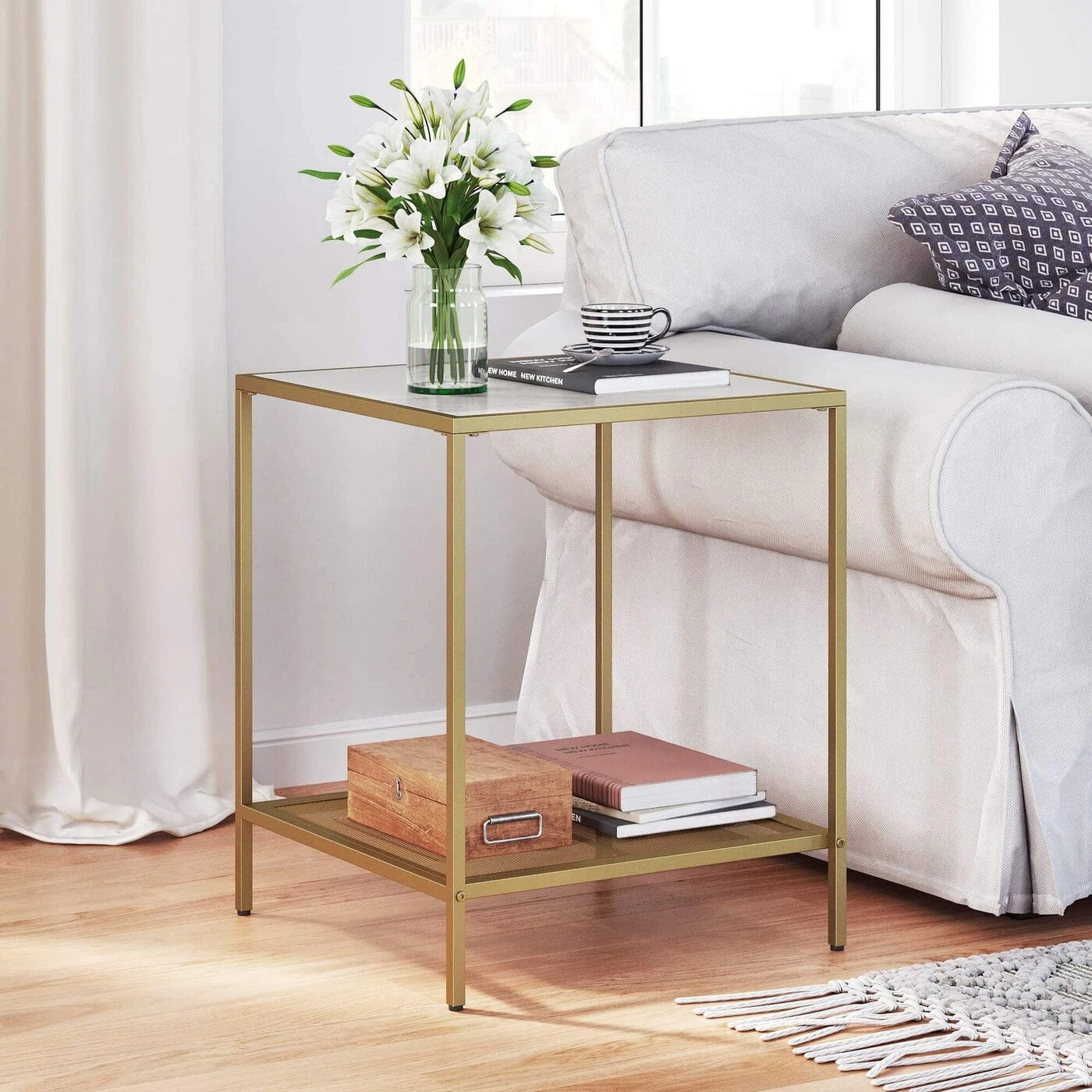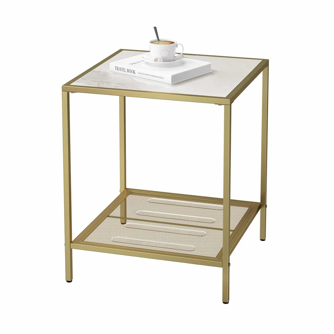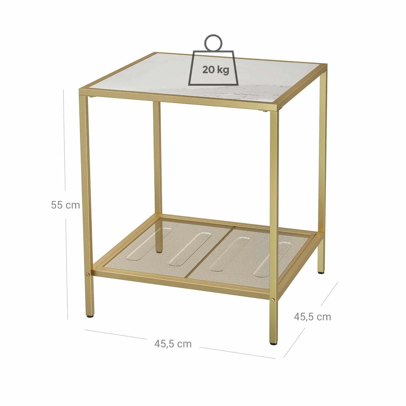 Aprašymas buvo automatiškai išverstas, gali pasitaikyti klaidų.Išsami informacija apie gaminį: - Spalva: Aukso marmuro efektas - Medžiaga: Plienas, Grūdintas stiklas - Dydis: 45,5 x 45,5 x 55 cm (P x P x A) - Svoris: 4,7 kg - Maksimali statinė apkrova vienoje pakopoje: 20 kgPristatymo komplektas: - 1 x šoninis staliukas - 1 x priedų paketas - 1 x vadovas (DE, EN, FR, IT, ES) VASAGLE Pastabos: - Saugumo sumetimais vaikams draudžiama lipti ant gaminio ar žaisti su juo .