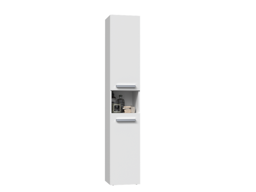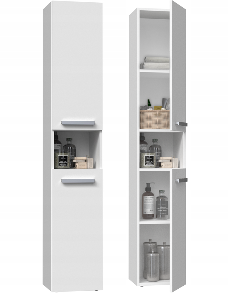 pastatoma, aukšta, 2-ų durelių ir 1-os atviros lentynos vonios spintelė;spintelė pagaminta iš laminuotos medžio drožlių plokštės su ABS kraštų apdaila;rankenėlės pagamintos iš plastiko;spintelės išmatavimai: plotis - 31 cm, gylis - 30 cm, aukštis - 174 cm;vidinis išplanavimas pavaizduotas 3 nuotraukoje;spintelės spalva: korpusas - balta (matinė), fadasas - balta (matinė);dureles galima montuoti tiek kairėje, tiek ir dešinėje pusėje;tvirta ir stabili konstrukcija;