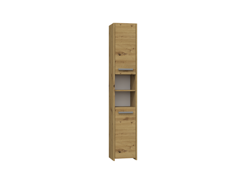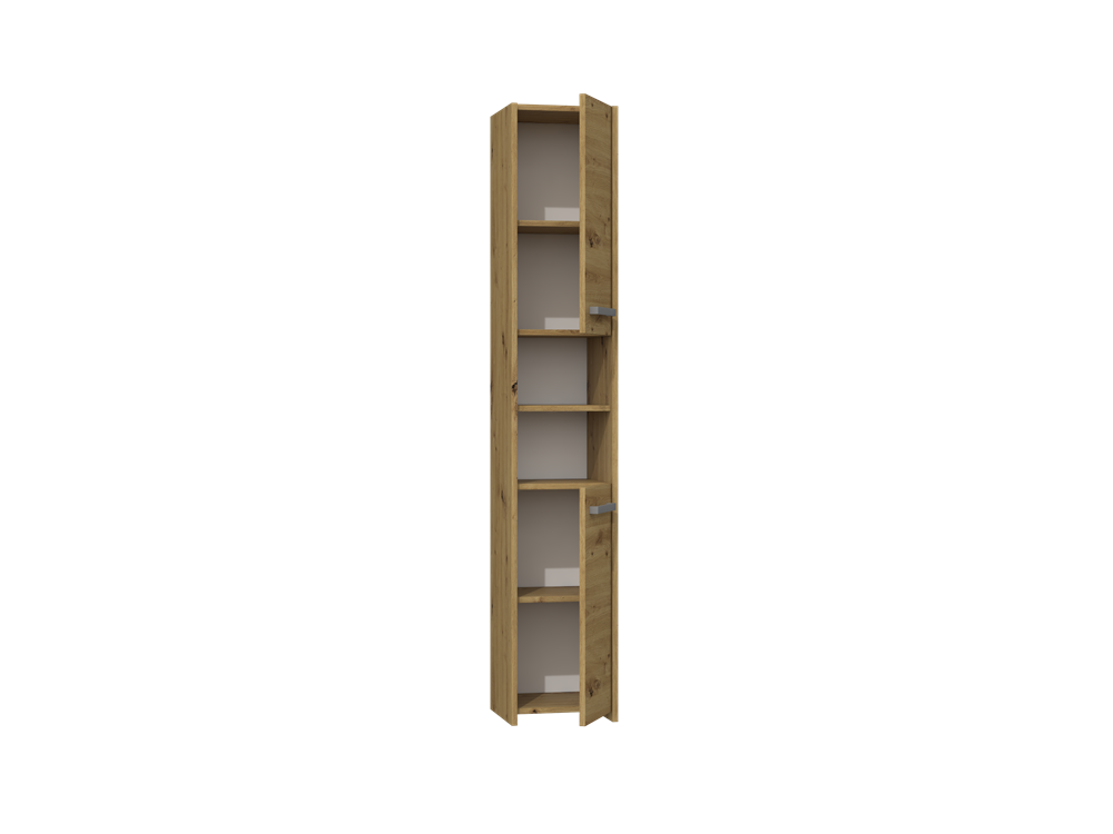 Dviejų durelių ir dviejų atvirų skyrių pastatoma vonios spintelė;Kiekvienų durelių viduje - po 1 lentyną, 2 skyrius; tarp uždarų skyrių - viena lentyna su dviem skyriais Jūsų daiktams laikyti;Minimalistinio stiliaus plastikinės, sidabro spalvos rankenėlės, tinkančios prie daugelio interjerų;Pagaminta iš: medžio drožlių plokštės (MDP), briaunos dengtos ABS danga;Surinkimo metu turėsite galimybę pasirinkti durelių varstymo kryptį; Išmatavimai: plotis - 30 cm, gylis - 30 cm, aukštis - 170 cm;Spalva: ruda (artisan oak);