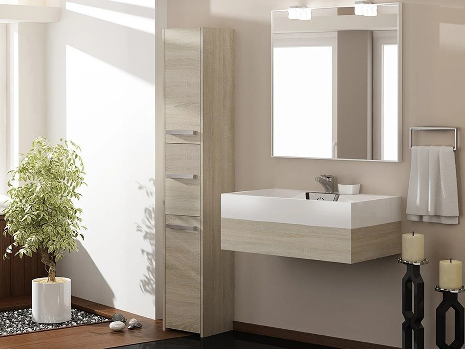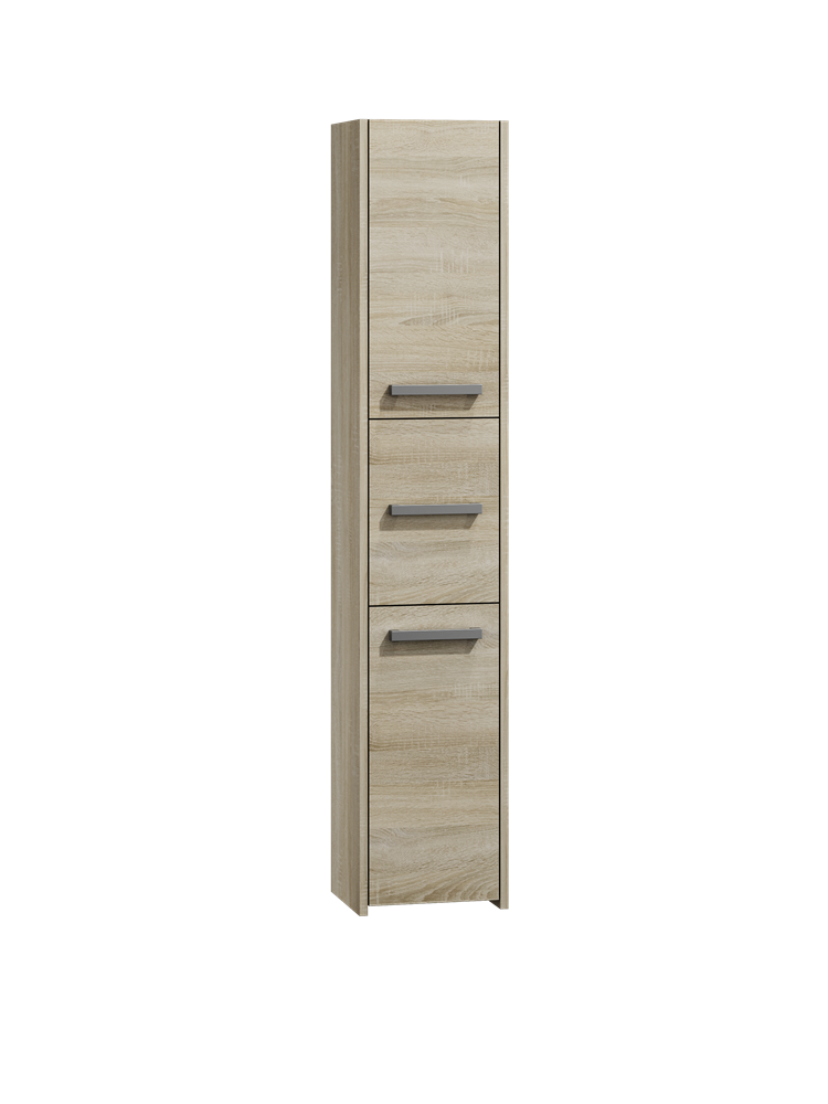 Trijų durelių, pastatoma vonios spintelė;Kiekvienų durelių viduje - po 1 lentyną, 2 skyrius;Dureles galima montuoti tiek iš dešinės, tiek iš kairės pusės; Minimalistinio stiliaus plastikinės, sidabro spalvos rankenėlės, tinkančios prie daugelio interjerų;Pagaminta iš: medžio drožlių plokštės (MDP), briaunos dengtos PVC danga;Išmatavimai: plotis - 30 cm, gylis - 30 cm, aukštis - 170 cm;Spalva: ąžuolo (sonoma);