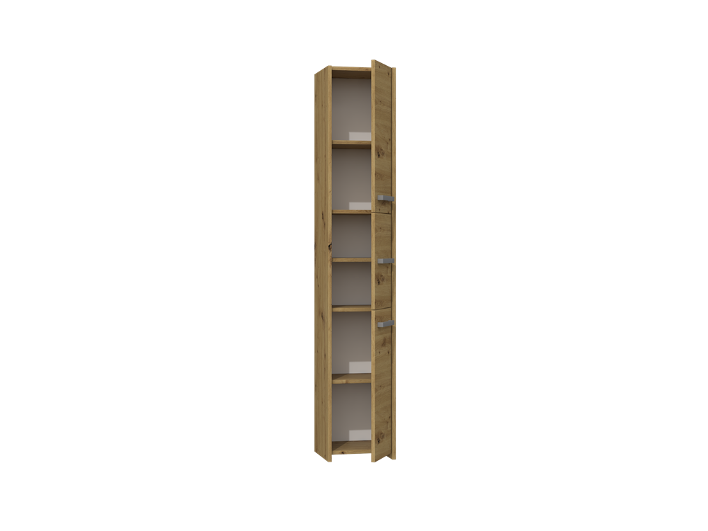 Trijų durelių, pastatoma vonios spintelė;Kiekvienų durelių viduje - po 1 lentyną, 2 skyrius;Dureles galima montuoti tiek iš dešinės, tiek iš kairės pusės; Minimalistinio stiliaus plastikinės, sidabro spalvos rankenėlės, tinkančios prie daugelio interjerų;Pagaminta iš: medžio drožlių plokštės (MDP), briaunos dengtos PVC danga;Išmatavimai: plotis - 30 cm, gylis - 30 cm, aukštis - 170 cm;Spalva: ruda (artisan oak);