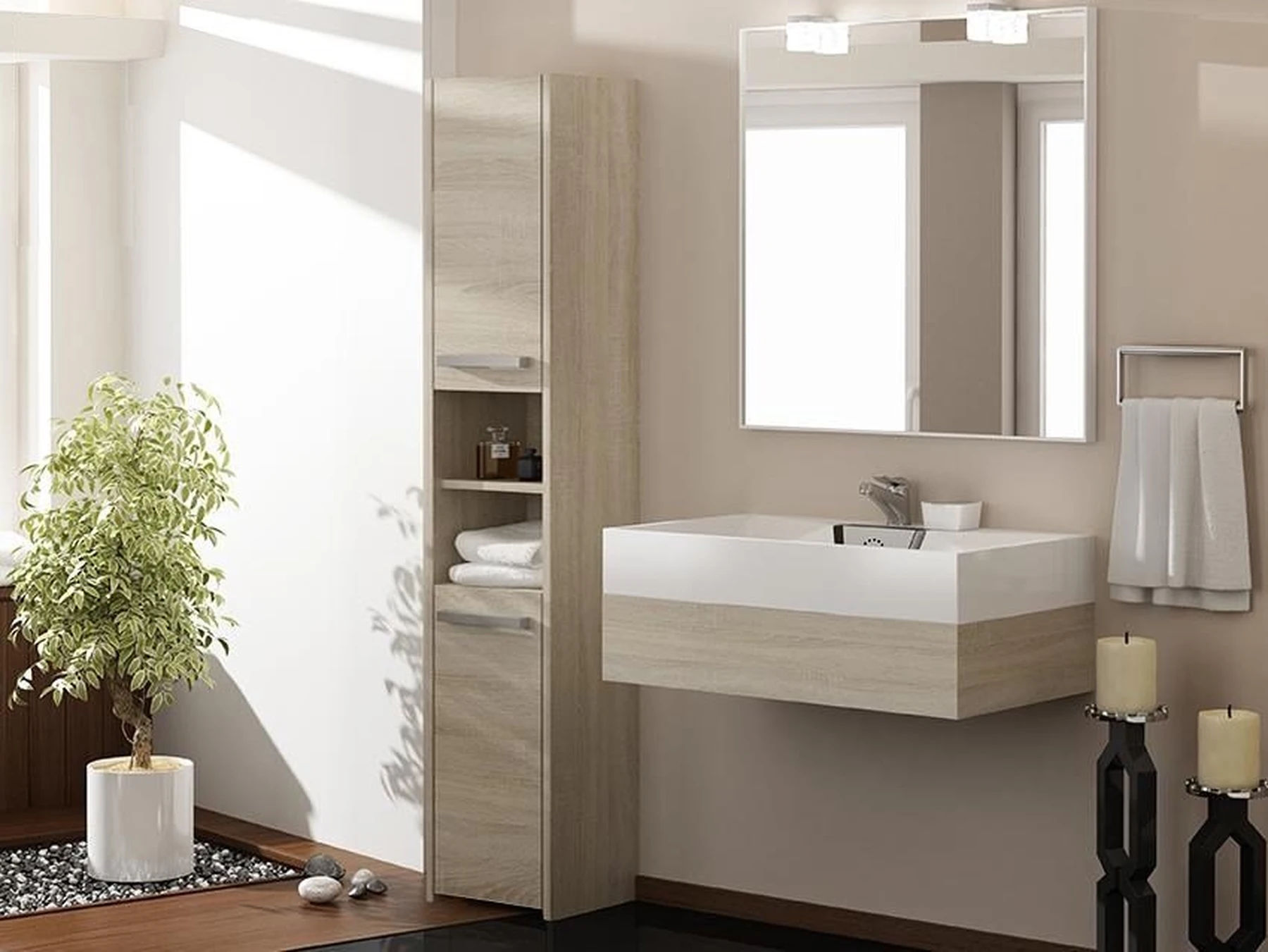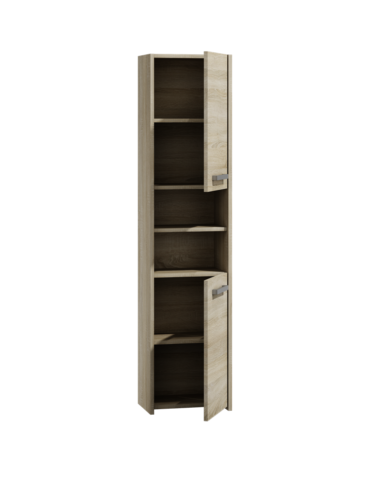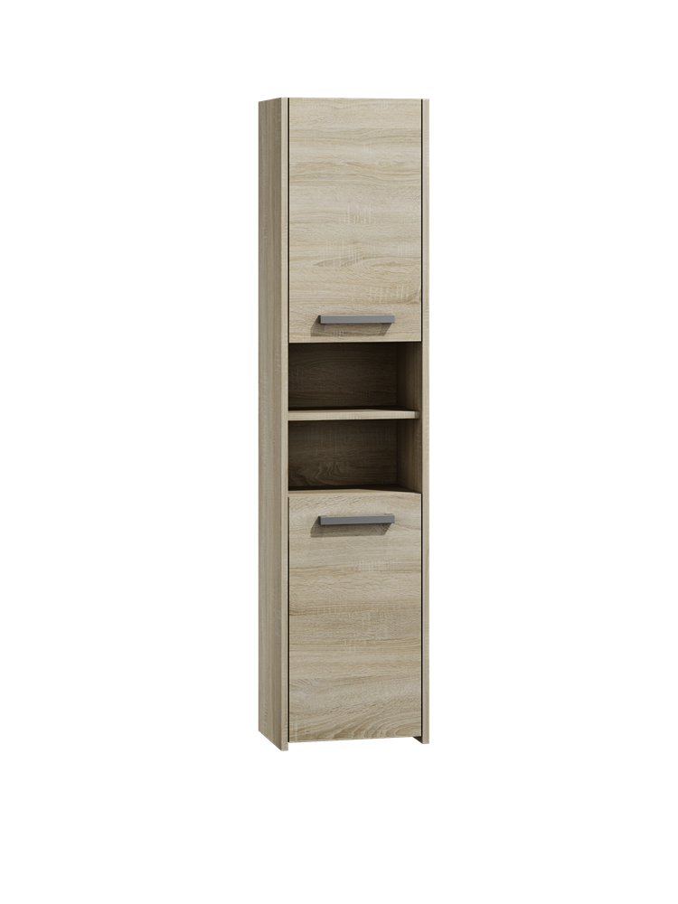 Dviejų durelių ir dviejų atvirų skyrių pastatoma vonios spintelė;Kiekvienų durelių viduje - po 1 lentyną, 2 skyrius; tarp uždarų skyrių - viena lentyna su dviem skyriais Jūsų daiktams laikyti;Minimalistinio stiliaus plastikinės, sidabro spalvos rankenėlės, tinkančios prie daugelio interjerų;Pagaminta iš: medžio drožlių plokštės (MDP), briaunos dengtos PVC danga;Surinkimo metu turėsite galimybę pasirinkti durelių varstymo kryptį;Išmatavimai: plotis - 40 cm, gylis - 30 cm, aukštis - 170 cm;Spalva: ąžuolo (sonoma);