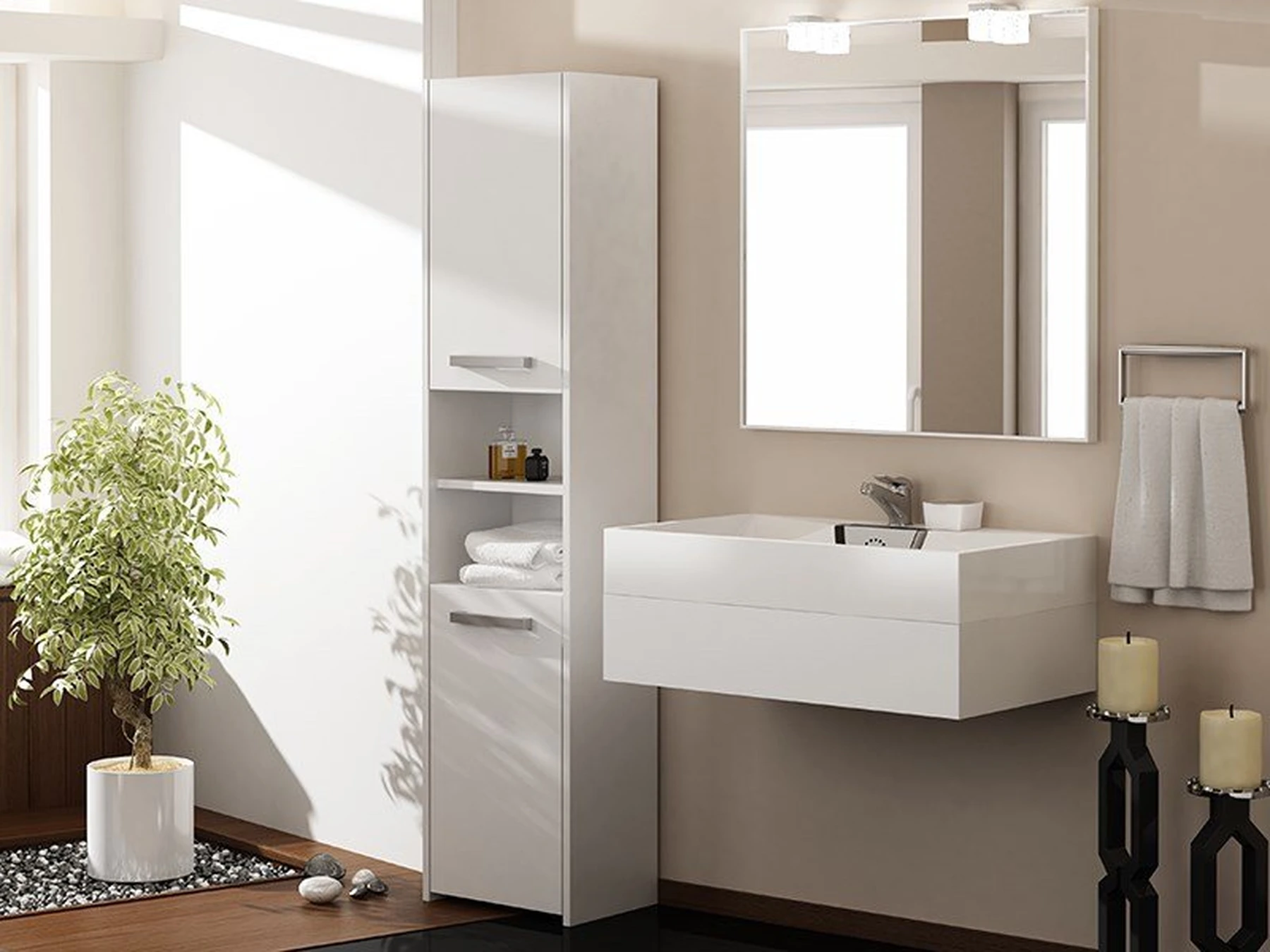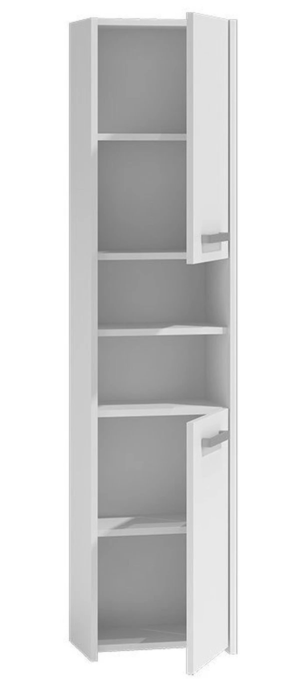 Dviejų durelių ir dviejų atvirų skyrių pastatoma vonios spintelė;Kiekvienų durelių viduje - po 1 lentyną, 2 skyrius; tarp uždarų skyrių - viena lentyna su dviem skyriais Jūsų daiktams laikyti;Minimalistinio stiliaus plastikinės, sidabro spalvos rankenėlės, tinkančios prie daugelio interjerų;Pagaminta iš: medžio drožlių plokštės (MDP), briaunos dengtos PVC danga;Surinkimo metu turėsite galimybę pasirinkti durelių varstymo kryptį;Išmatavimai: plotis - 40 cm, gylis - 30 cm, aukštis - 170 cm;Spalva: balta;