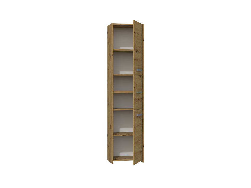 Trijų durelių, pastatoma vonios spintelė;Kiekvienų durelių viduje - po 1 lentyną, 2 skyrius;Minimalistinio stiliaus rankenėlės, tinkančios prie daugelio interjerų;Pagaminta iš: medžio drožlių plokštės (MDP), briaunos dengtos PVC danga;Surinkimo metu turėsite galimybę pasirinkti durelių varstymo kryptį;Išmatavimai: plotis - 40 cm, gylis - 30 cm, aukštis - 170 cm;Spalva: ruda (artisan oak);