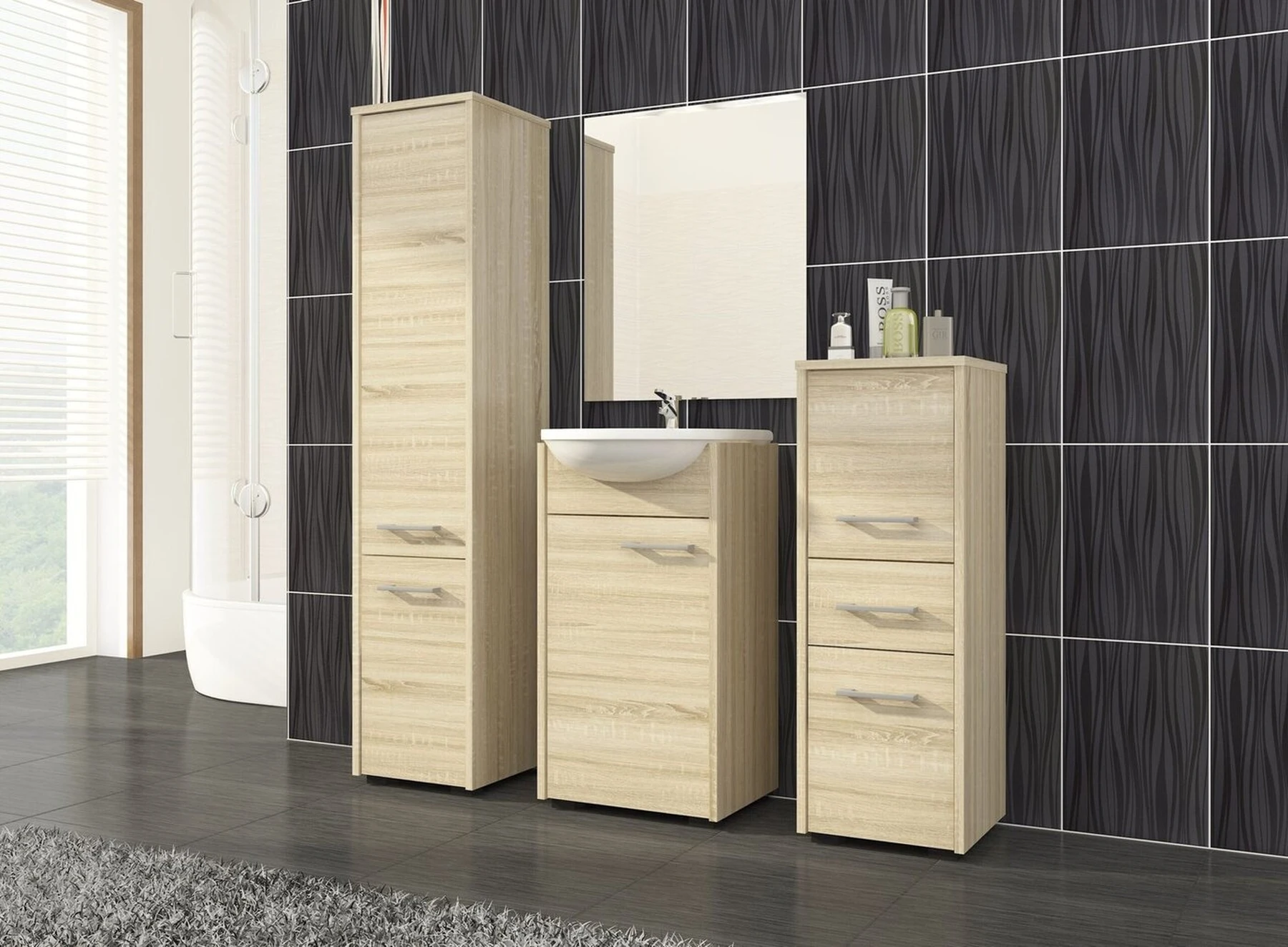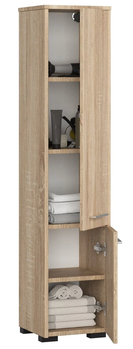 Aprašymas buvo automatiškai išverstas, gali pasitaikyti klaidų. - Spintelė pagaminta iš aukštos kokybės 16 mm Kronospan laminuotos plokštės. Lenta 16 mm storio - Durų viduje yra 4 lentynos - Tinkamai apsaugai skirti kraštai padengti ABS briauna - Sidabrinės durys rankenos – savaime surenkama spintelė - Universali spintelė, pakuotėje yra reguliuojamos pakabos pakabinimui ir kojelės spintelei pastatyti ant grindų - Pristatymo instrukcijos – 24 mėnesių gamintojo garantija Fin 2 durų vonios lentyna yra universalus baldas, kurį galima naudojamas bet kuriame vonios kambaryje, nepaisant jo dydžio. Dėl elegantiško dizaino ir spalvų sonoma ąžuolo spintelė puikiai tinka bet kokiam vonios kambariui su klasikine ar modernia furnitūra, taip pat įvairių atspalvių plytelėms ir terakotai. Vonios stulpas dėl savo matmenų gali užpildyti dažnai nenaudojamą erdvę vonios kampe, taip pat būti pastatytas šalia praustuvo, skalbimo mašinos ar dušo kabinos. Pastatoma vonios lentyna Fin išsiskiria itin kruopščia apdaila. Turi dvi patogias ir plačias duris su ergonomiškomis rankenomis, užtikrinančiomis patogų patekimą į baldo vidų. Gilios ir erdvios lentynos puikiai tinka rankšluosčiams, tualeto reikmenims, kosmetikai ir valymo priemonėms laikyti spintelėje. Vonios stulpelis pagamintas iš laminuotos plokštės, kuri yra atspari dilimui ir vandeniui. ABS briaunos, kuriomis apdailinama spintelė, yra patvarios, neblunka spalvos ir papildomai apsaugo spintelę nuo pažeidimų.