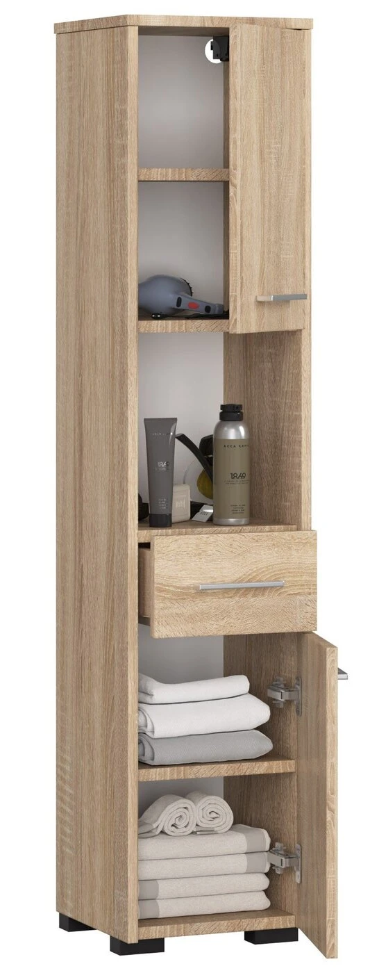 Aprašymas buvo automatiškai išverstas, gali pasitaikyti klaidų. - Spintelė pagaminta iš aukštos kokybės 16 mm Kronospan laminuotos plokštės. Lenta yra 16 mm storio - Kiekvienoje durelių viduje yra po vieną lentyną - Tinkamai apsaugai skirti kraštai padengti ABS briauna - Spalvotos durys rankenos sidabrinės - Savarankiškai surenkama spintelė - Universali spintelė, pakuotėje yra reguliuojamos pakabos pakabinimui ir kojelės spintelei pastatyti ant grindų - Pristatymo instrukcijos – 24 mėnesių garantija Kas būdinga mūsų FIN 2D vonios stulpui? Visų pirma, unikalus modernus dizainas. Jis puikiai dera prie šiuolaikinio vonios kambario išvaizdos ir, pakeitimui, nėra, baltos spalvos. Dėl to dažniausiai šaltas kambarys įgauna šiek tiek šilumos. Pagaminta iš plokštės, atsparios ne tik braižymui ir trinčiai, bet ir drėgmei, dėl kurios pažeidžiama dauguma įprastų spintelių, šis stulpas yra viena geriausių investicijų. 140 cm aukščio leidžia paslėpti reikalingus daiktus ir suteikia papildomos vietos po ranka pasidėti tuos, kuriuos dažniausiai naudojate. 30 cm stulpelio gylis ir ilgis neužima daug vietos ir ypač praverčia mažose patalpose, o dvi atskirai uždaromos lentynos talpina didelį kiekį daiktų, įskaitant rankšluosčius. Papildomas stalčius leidžia paslėpti smulkius daiktus iš matymo lauko. Vonios kambario Ąžuolo spalva dedama ant elegantiškų stulpų, kurie užtikrina jo stabilumą.
