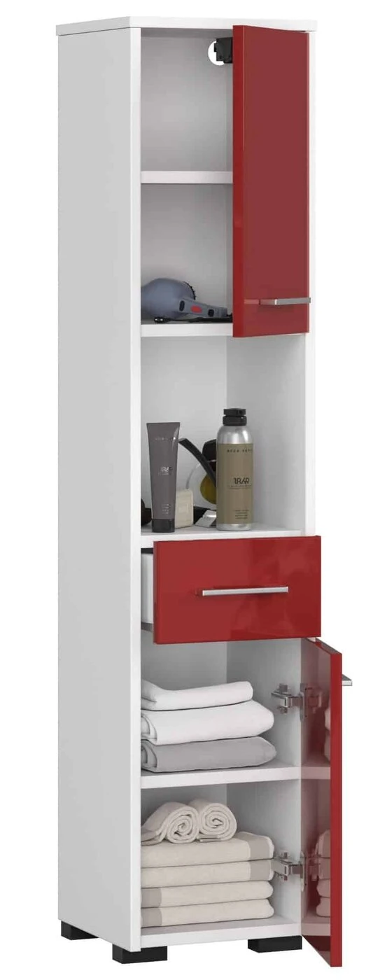 Aprašymas buvo automatiškai išverstas, gali pasitaikyti klaidų. Vonios baldai siauros knygų spintos formos, stulpelis reikalingiems indams, kosmetikai, vonios tekstilei susidėti. Spintelės korpusas pagamintas iš kokybiškos 16 mm storio laminuotos plokštės. Tvirtas, įspūdingas raudonos spalvos priekis ir itin blizgus apdaila. Sidabrinės durų rankenos. Spintoje yra lentynos. Segmente už kiekvienų durų yra po vieną lentyną. Gaminio matmenys pritaikyti mažiems vonios kambariams ir derinti į modulius bei baldų komplektus: aukštis 140 cm plotis 30 cm gylis 30 cm. Galimybė savarankiškai surinkti spintelę. Komplekte yra elementai, reikalingi montavimui dviem versijomis: ant sienos - reguliuojamos pakabos, ant žemės - stovinčios spintelės varžtų kojelės, vartotojo vadovas. Privalumai: Padidintas atsparumas drėgmei ir pažeidimams – kraštai padengti ABS apvadu. Modernus dizainas, efektyvus spalvų derinys:, baltos spalvos, raudona ir sidabrinė bei veidrodinis priekinių dalių blizgesys. Garantija 24 mėn.
