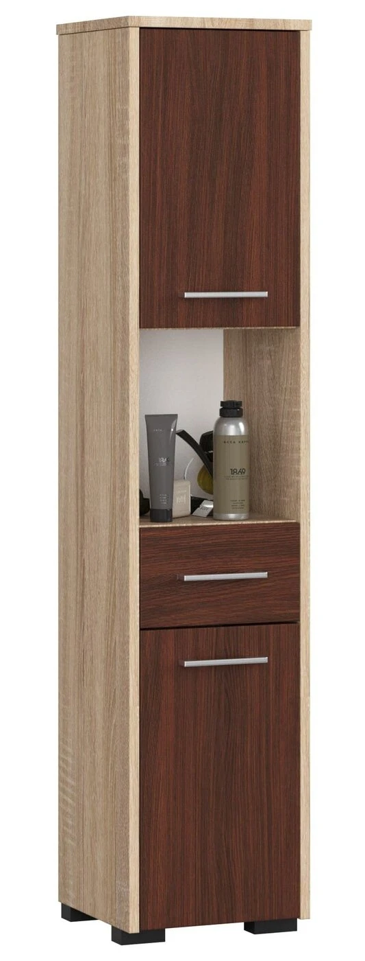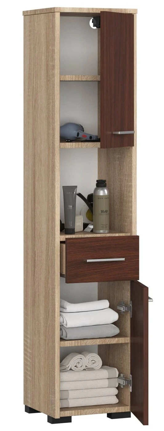 Aprašymas buvo automatiškai išverstas, gali pasitaikyti klaidų. Vonios kambario stovas FIN 2D 1SZ 1W, tamsiai ruda/ąžuolo yra vonios kambario baldas, skirtas būtiniems vonios reikmenims, kosmetikai ir ip rankšluosčiams laikyti. Spintelė su dvejomis durimis, dviem vidinėmis lentynomis, stalčiumi ir atvira vieta reikalingiausiems daiktams susidėti. Vonios stulpų / lentynų korpusai iš vientisos laminuotos plokštės, kurių storis Kronospan 16 mm Sonoma medienos raštas. Durų fasadai, tamsiai ruda rašto. Sidabrinės rankenos su modernia, tiesia linija. Gaminio matmenys pritaikyti mažiems vonios kambariams. Galima derinti į baldų modulius didesnėse patalpose. aukštis 140 cm plotis 30 cm gylis 30 cm. Savarankiško surinkimo galimybė. Komplekte yra elementai, reikalingi montavimui dviem versijomis: ant sienos - reguliuojamos pakabos, ant žemės - varžtų kojelės, naudotojo vadovas. Privalumai: Padidėjęs atsparumas drėgmei ir pažeidimams – briaunos padengtos ABS briauna. Šiuolaikiška, bet jauki estetika, nurodanti dviejų rūšių medieną, praturtinta kilniu rankenų paprastumu. 24 mėnesių garantija.