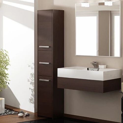 Minimalistinio stiliaus pastatoma, 3 durelių vonios spintelė;Už durelių po dvi lentynas;Spintelė pagaminta iš laminuotos medžio drožlių plokštės (MDP);Spintelės kraštų apdailos medžiaga: PVC;Spintelės išmatavimai: aukštis - 170 cm, plotis - 30 cm, gylis - 30 cm;Spintelės spalva: tamsiai ruda (wenge);Sidabrinės spalvos plastikinės rankenėlės;