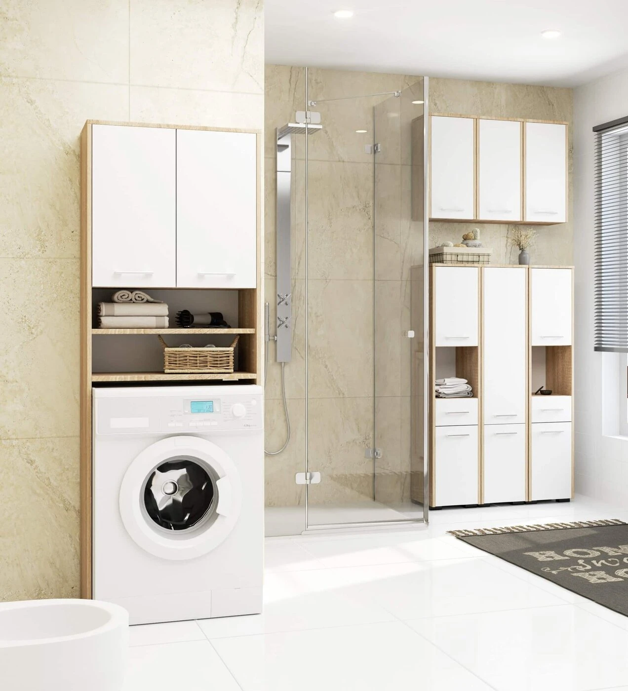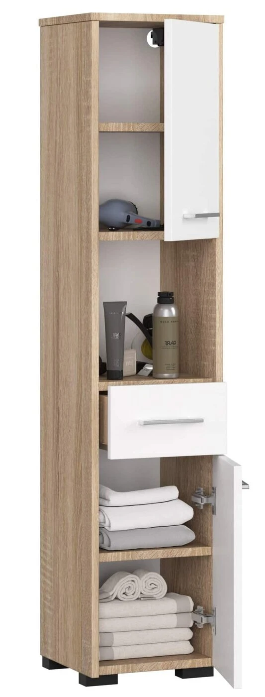 Aprašymas buvo automatiškai išverstas, gali pasitaikyti klaidų. Mūsų parduotuvės siūloma vonios lentyna yra puikus sprendimas užpildyti tuščią erdvę vonios kambaryje ir tuo pačiu paslėpti visus reikalingus daiktus. Užbaikite negražias griozdiškas skalbimo mašinas, kriaukles ar veidrodines lentynas. Ši vonios lentyna suteiks jūsų vonios kambariui stiliaus. Dėl to, kad yra universalios spalvos -, balta/ąžuolo, stulpas puikiai tiks vonios kambariuose, kurie dekoruoti tiek moderniu, tiek klasikiniu stiliumi. Spintelė buvo sukomplektuota sidabro spalvos rankenomis. Šių baldų universalumą liudija ir tai, kad jie komplektuojami su reguliuojamomis pakabomis ir kojelėmis, skirtomis spintelei pastatyti ant žemės. Vonios stovo stovas pagamintas 16 mm storio laminuotos plokštės, kuri pasižymi atsparumu dilimui. Siekiant užtikrinti 100% spintelės apsaugą, jos kraštai padengti ABS apvadu. Knygų spinta susideda iš penkių lentynų ir vienos ištraukiamos spintelės, tai neabejotinai itin erdvus baldas, kuris lėtai sutvarkys vonios kambario interjerą. Spintelė tinkama montuoti savarankiškai, instrukcija pridedama prie dėžutės.