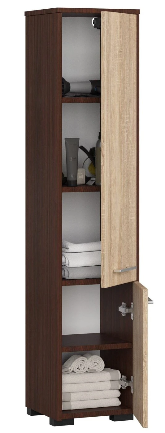 Aprašymas buvo automatiškai išverstas, gali pasitaikyti klaidų. Vonios lentyna FIN yra puikus sprendimas kiekvienam vonios kambariui. Taip pat tinka ir kitose patalpose, kuriose gali būti daug drėgmės, pavyzdžiui, skalbykloje ar džiovykloje. Dėl mažo pločio ir gylio – 30 cm – tilps siauroje erdvėje prie kriauklės, skalbimo mašinos ar dušo kabinos. Viduje yra 4 erdvios lentynos, kurios padės palaikyti tvarką vonios niekučių. Puikiai tiks kaip atskiras baldas ar komplekto dalis. Stovo konstrukcija leidžia ją pakabinti ir pastatyti. Komplekte yra reguliuojamos pakabos ir kojelės: surinkimui nereikia pirkti atskirai reikalingų elementų. Visą daiktą galima lengvai surinkti patiems. Komplekte yra instrukcijos. Vonios gaminiui taikoma 24 mėnesių garantija. Įsigydami šį modelį gausite estetišką baldą, kuris: pagamintas iš patvarios, trinčiai ir drėgmei atsparios medžiagos, leis visapusiškiau išnaudoti vonios erdvę, tilps jūsų kosmetika, rankšluosčiai ir vonios reikmenys, turi įdomų, modernų dizainą: šarnyrinės sonomos durys ir, tamsiai ruda spalvos korpusas puikiai kontrastuoja vienas su kitu, kraštai padengti nuo pažeidimų apsaugančia medžiaga (ABS), kurios dėka visuma per daug greitai nepraras estetiškumo, lengva pašalinti nešvarumus.