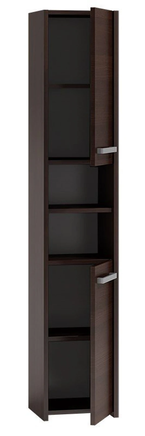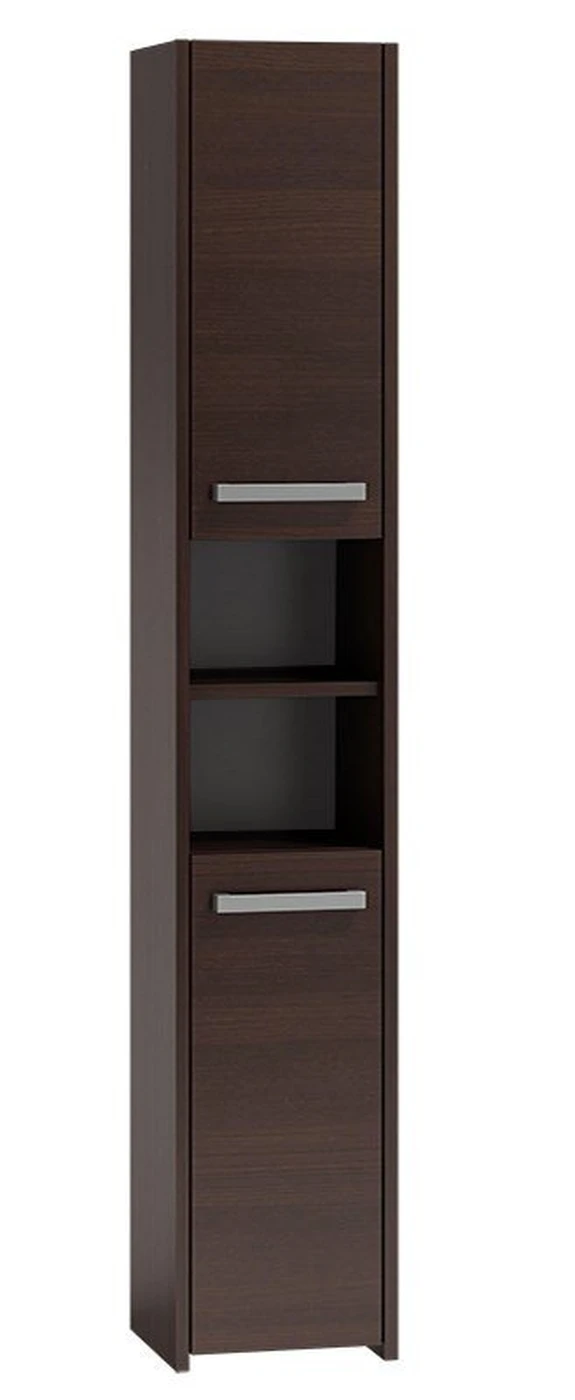 pastatoma, aukšta, dviejų durelių ir vieno atviro skyriaus vonios spintelė;vonios spintelė pagaminta iš laminuotos medžio drožlių plokštės (MDP) su PVC kraštų apdaila;vidinis spintelės išplanavimas pavaizduotas 2 nuotraukoje;spintelės išmatavimai: plotis - 30 cm, gylis - 30 cm, aukštis - 170 cm;pilkos spalvos rankenėlės;tvirta ir stabili konstrukcija;spintelės spalva: tamsiai ruda (wenge);dureles galima montuoti tiek kairėje, tiek dešinėje pusėje;