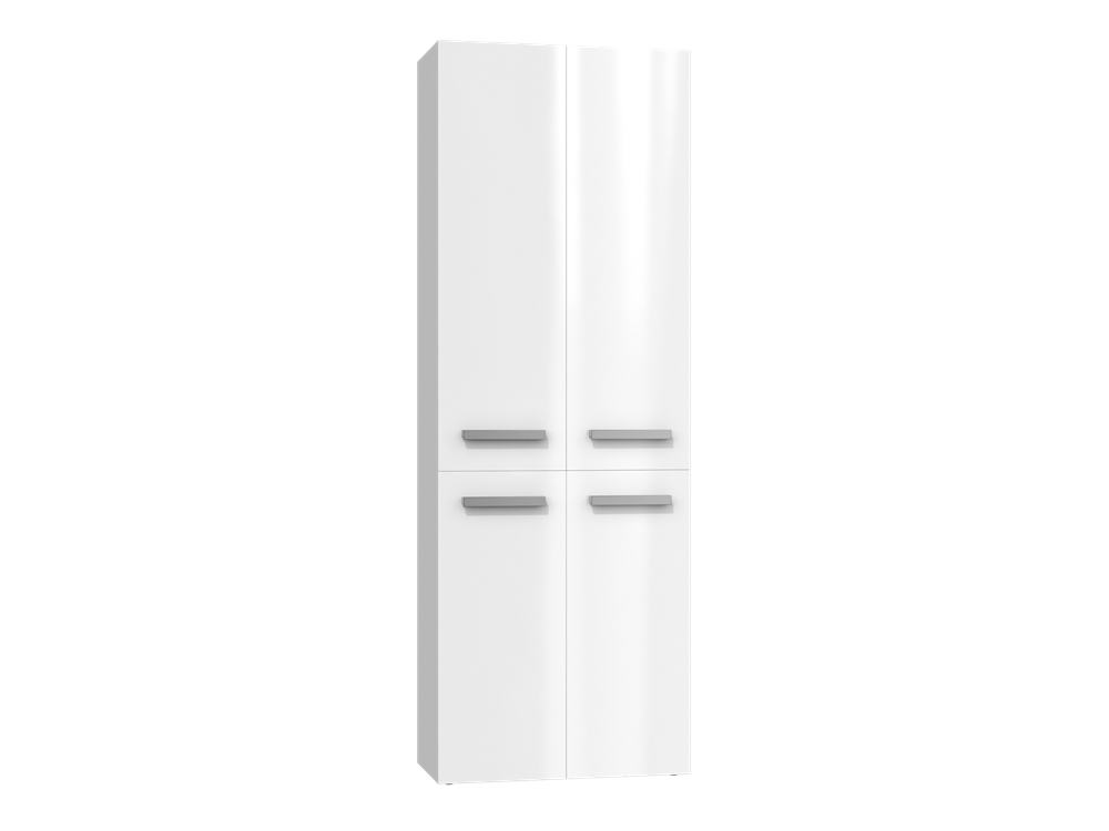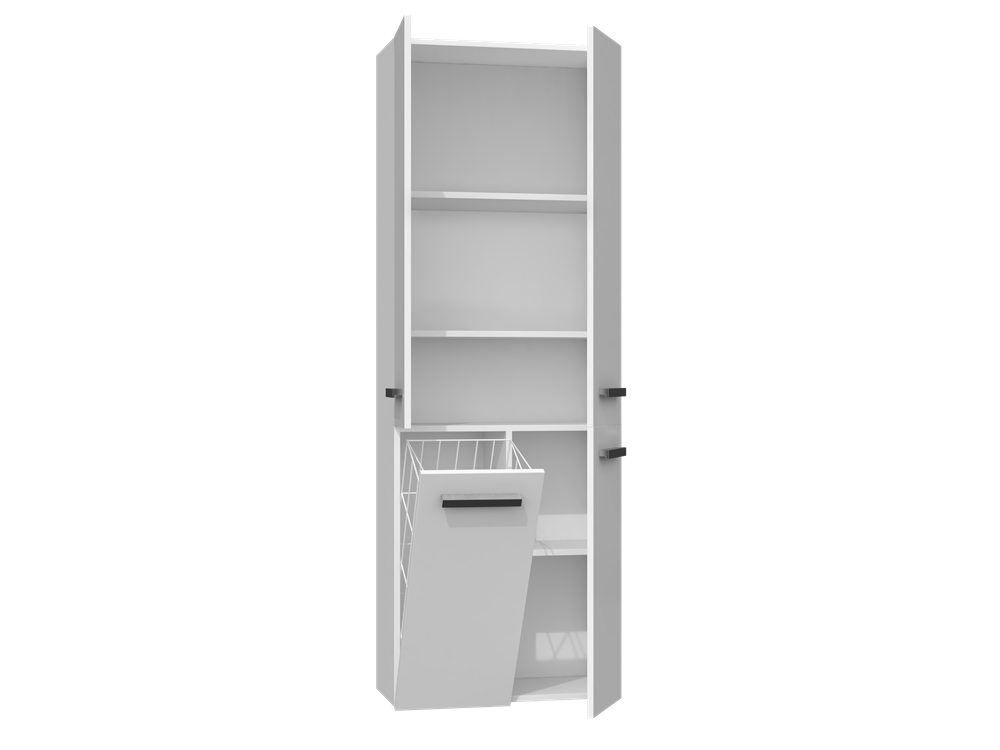 Pastatoma vonios spintelė;Spintelė su durelėmis, viršutinėje spintelės dalyje: 2 lentynos, 3 skyriai;Atidaromuose apatiniuose skyriuose - vienas skyrius skalbiniams ir viena uždara lentyna (2 skyriai);Minimalistinio stiliaus plastikinės, sidabro spalvos rankenėlės, tinkančios prie daugelio interjerų;Pagaminta iš: korpusas - 16 mm storio medžio dulkių plokštės (MDF), durelės - iš 17 mm storio MDF; briaunos dengtos PVC danga;Išmatavimai: plotis - 60 cm, gylis - 30 cm, aukštis - 174 cm;Spalva: blizgi balta;