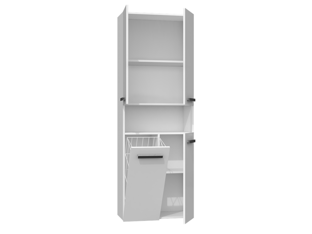 Pastatoma vonios spintelė;Spintelė su durelėmis, viršutinėje spintelės dalyje: 1 lentyna, 2 skyriai;Viena atvira lentyna Jūsų daiktams;Atidaromuose apatiniuose skyriuose - vienas skyrius skalbiniams ir viena uždara lentyna (2 skyriai);Minimalistinio stiliaus plastikinės, sidabro spalvos rankenėlės, tinkančios prie daugelio interjerų;Pagaminta iš: korpusas - 16 mm storio medžio dulkių plokštės (MDF), durelės - iš 17 mm storio MDF; briaunos dengtos PVC danga;Išmatavimai: plotis - 60 cm, gylis - 30 cm, aukštis - 174 cm;Spalva: blizgi balta;