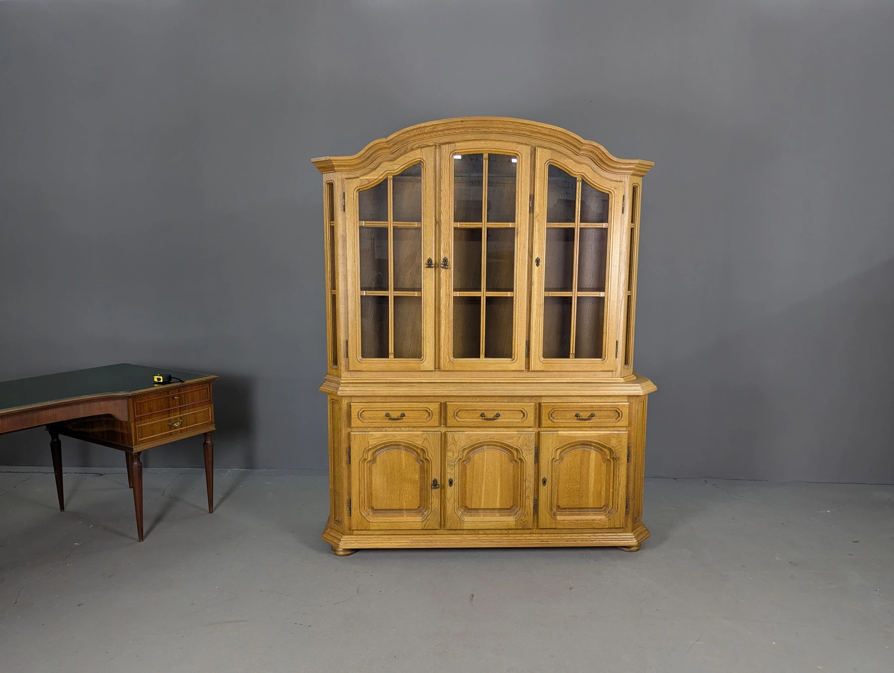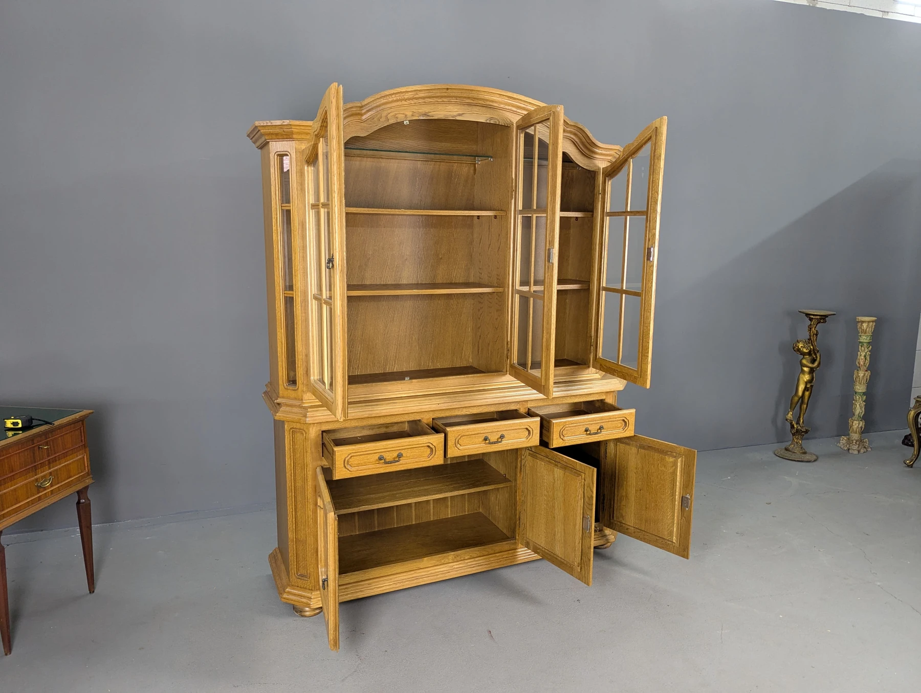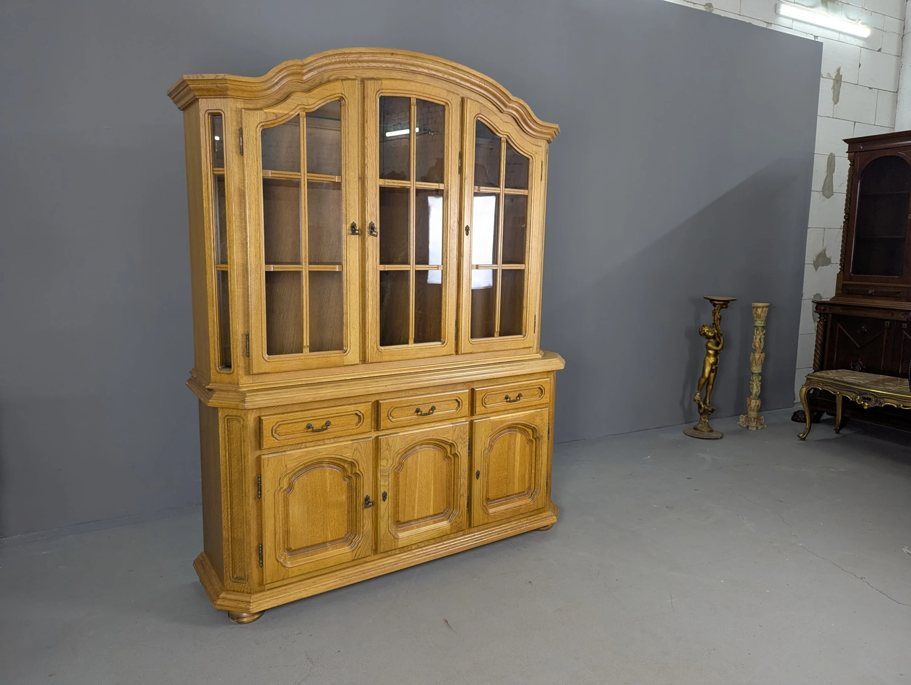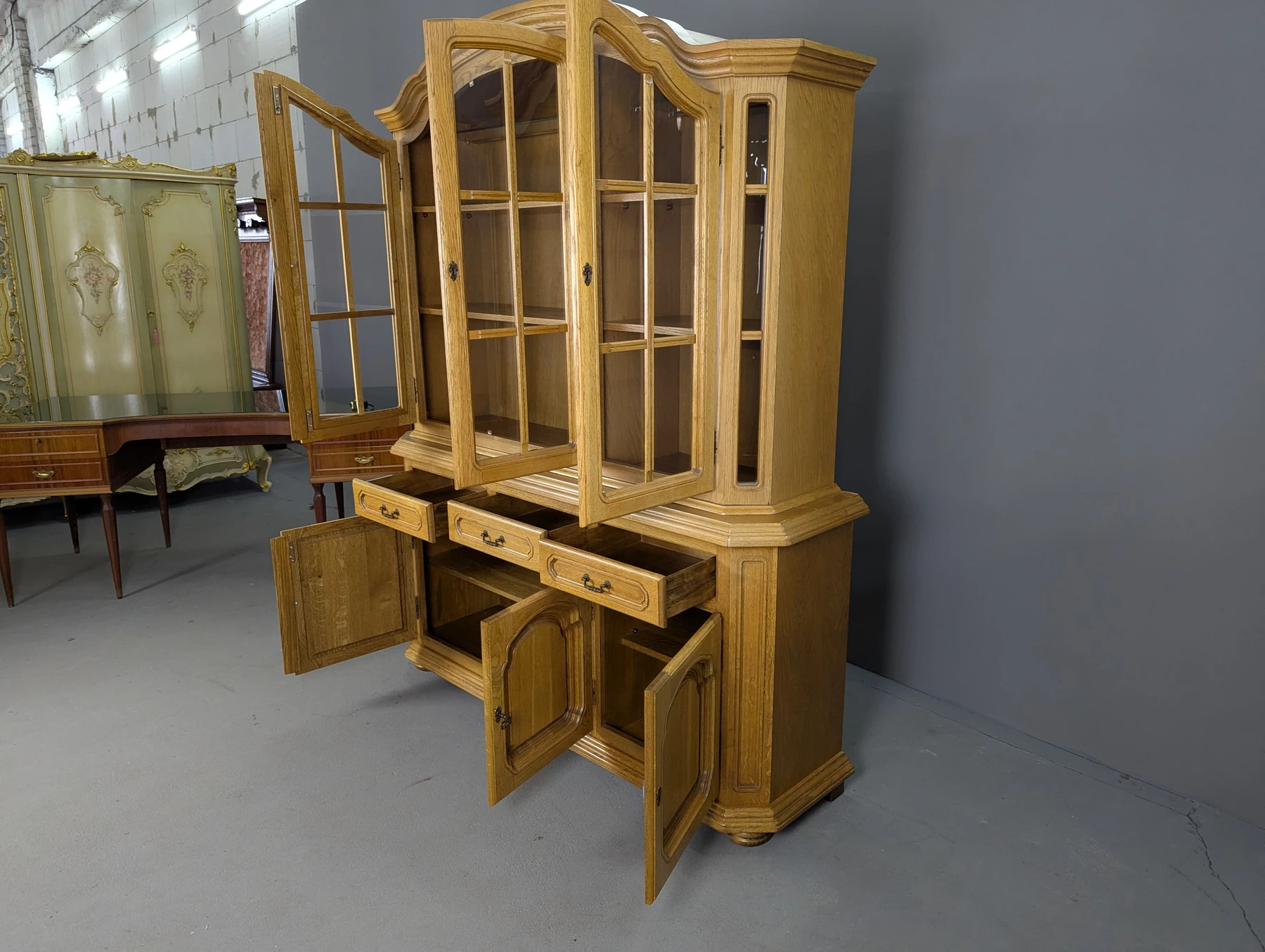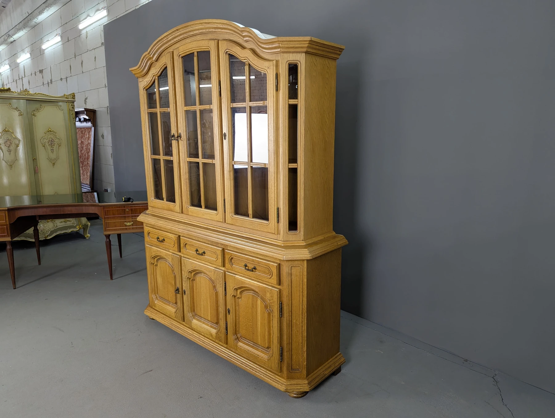 Ąžuolo indauja su vitrina – solidus klasikinio dizaino baldas, pasižymintis natūralaus medžio šiluma ir patvarumu. Viršutinėje dalyje – stiklinės durelės su dekoratyviais rėmeliais, už kurių slepiasi erdvios lentynos indams, knygoms ar dekoratyviems objektams. Apatinė dalis su trimis stalčiais ir uždaromis spintelėmis leidžia patogiai laikyti staltieses, indus ar kitus namų daiktus. Švelniai lenkti durelių kontūrai, masyvūs šonai ir tradicinės žalvarinės rankenėlės sukuria harmoningą ir ilgaamžį įvaizdį. Tai baldas, tinkantis svetainei, valgomajam ar kaimiško bei klasikinio stiliaus interjerui.
