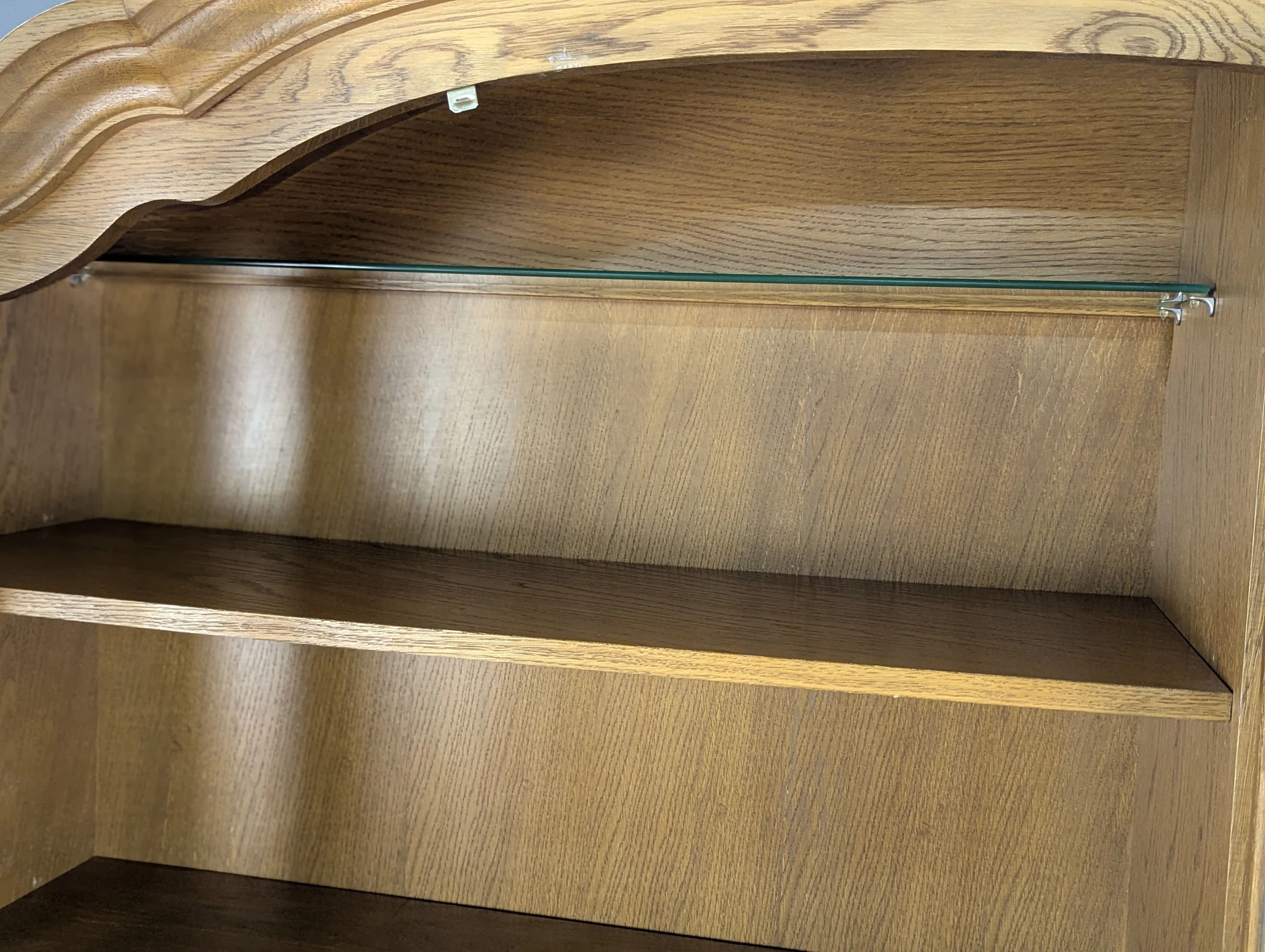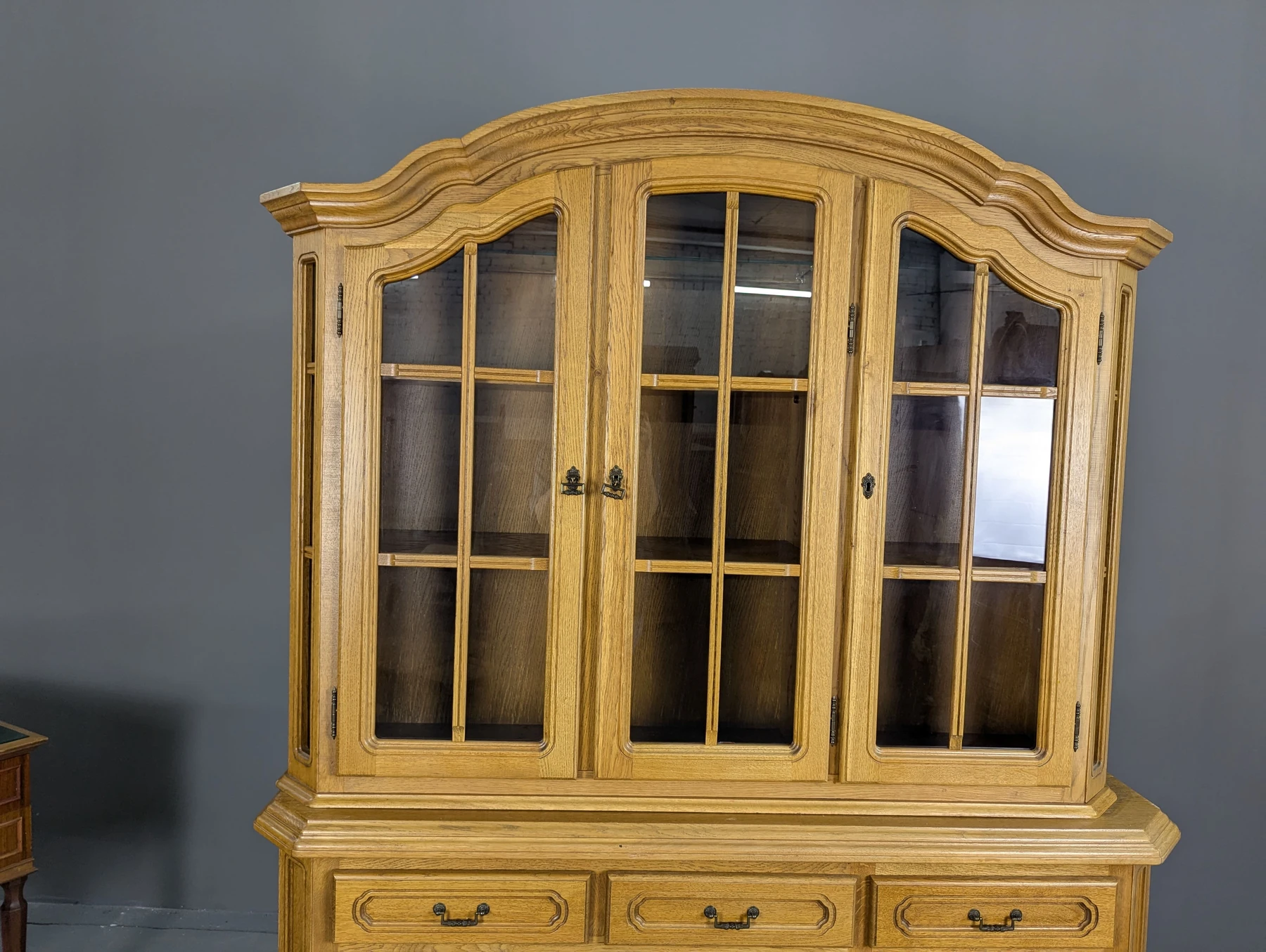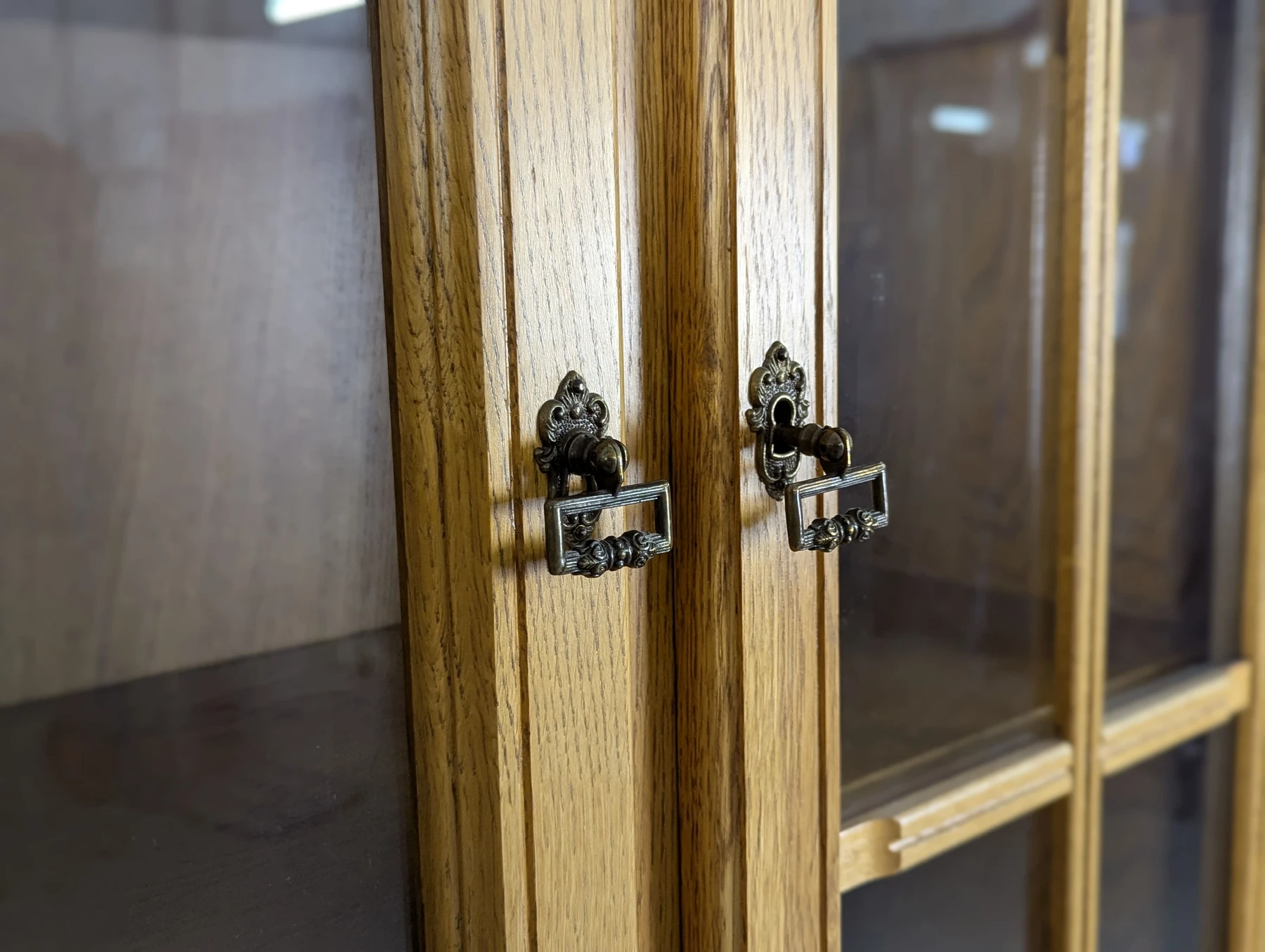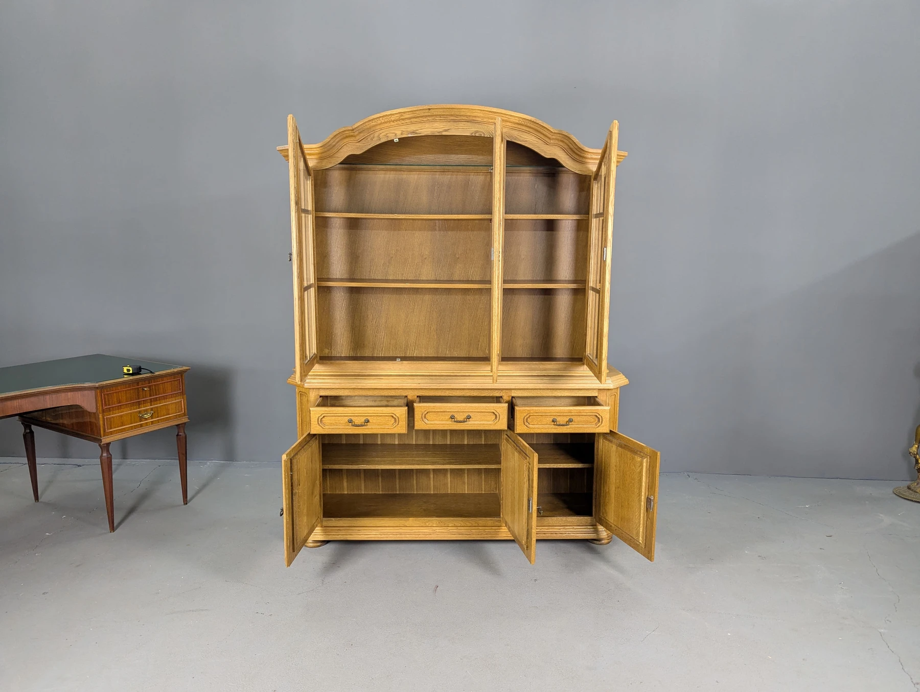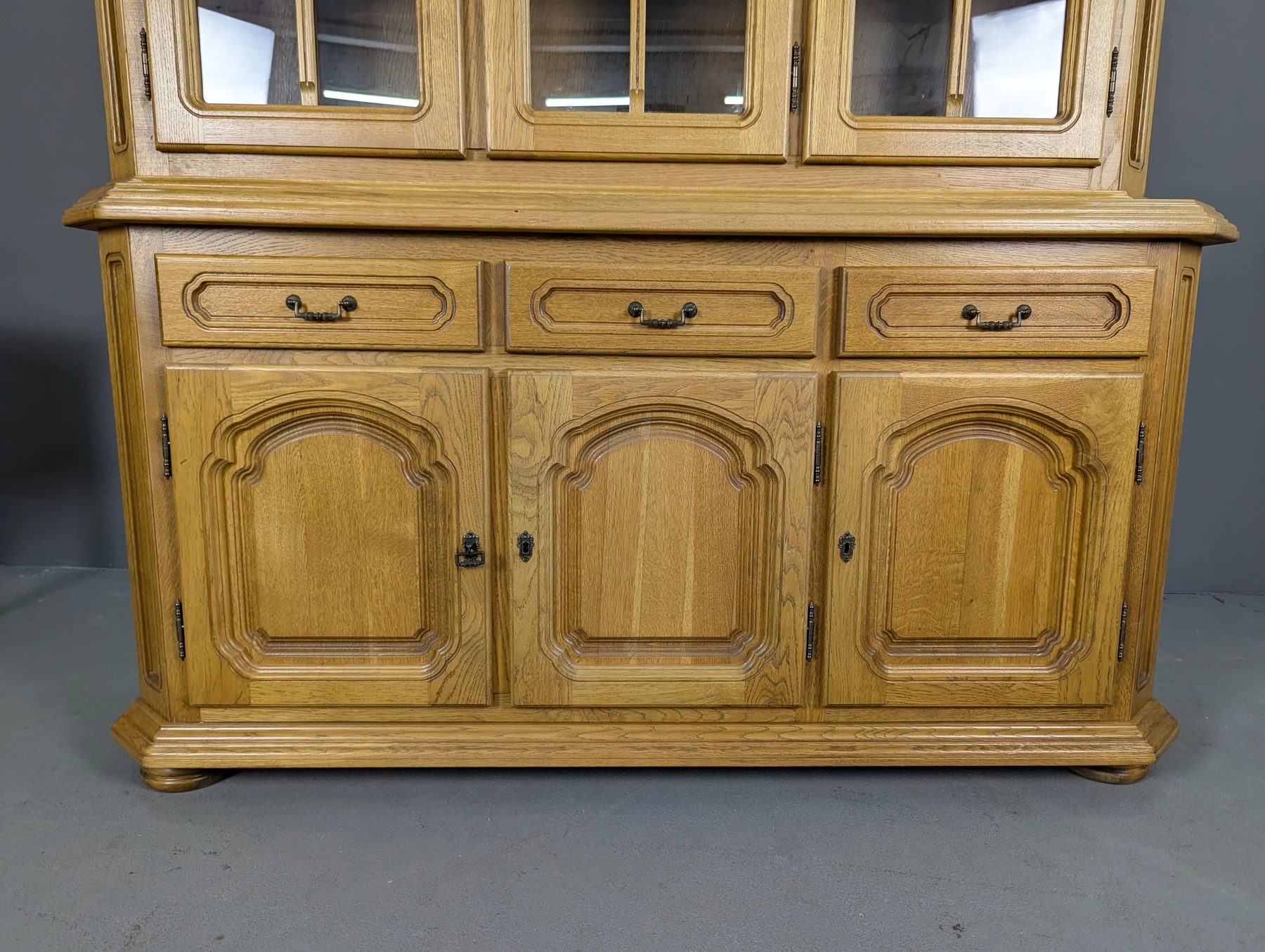 Ąžuolo indauja su vitrina – solidus klasikinio dizaino baldas, pasižymintis natūralaus medžio šiluma ir patvarumu. Viršutinėje dalyje – stiklinės durelės su dekoratyviais rėmeliais, už kurių slepiasi erdvios lentynos indams, knygoms ar dekoratyviems objektams. Apatinė dalis su trimis stalčiais ir uždaromis spintelėmis leidžia patogiai laikyti staltieses, indus ar kitus namų daiktus. Švelniai lenkti durelių kontūrai, masyvūs šonai ir tradicinės žalvarinės rankenėlės sukuria harmoningą ir ilgaamžį įvaizdį. Tai baldas, tinkantis svetainei, valgomajam ar kaimiško bei klasikinio stiliaus interjerui.