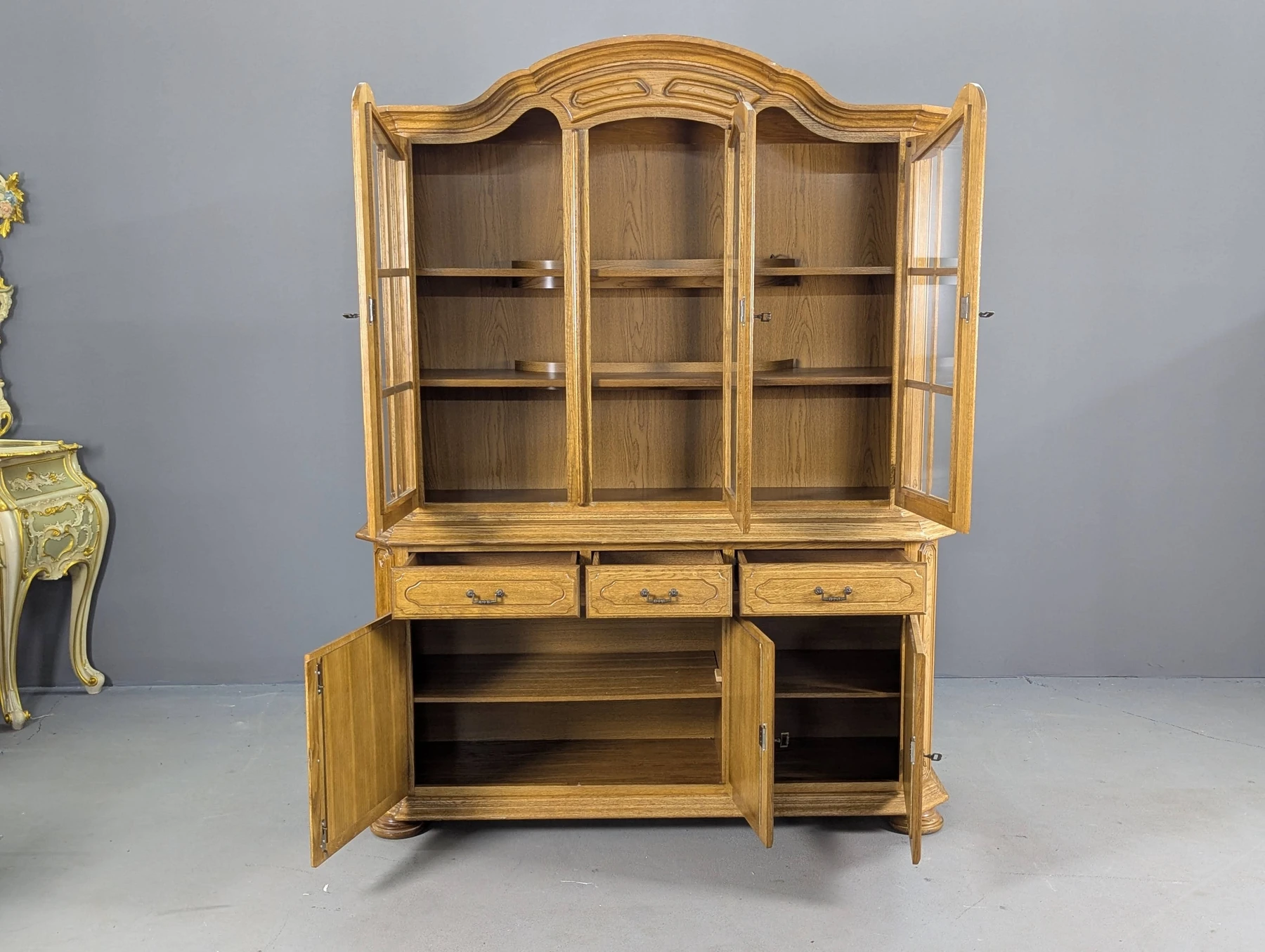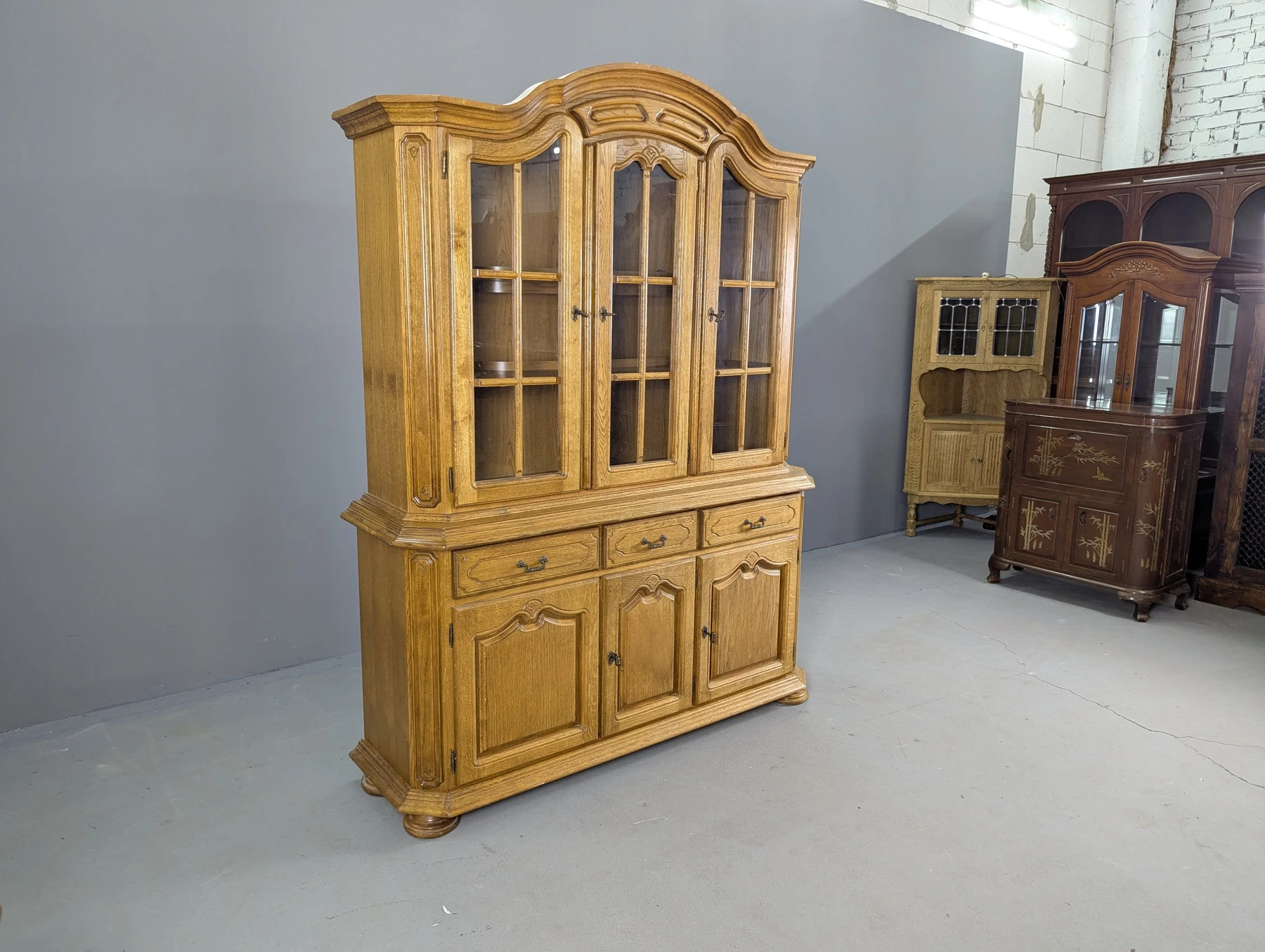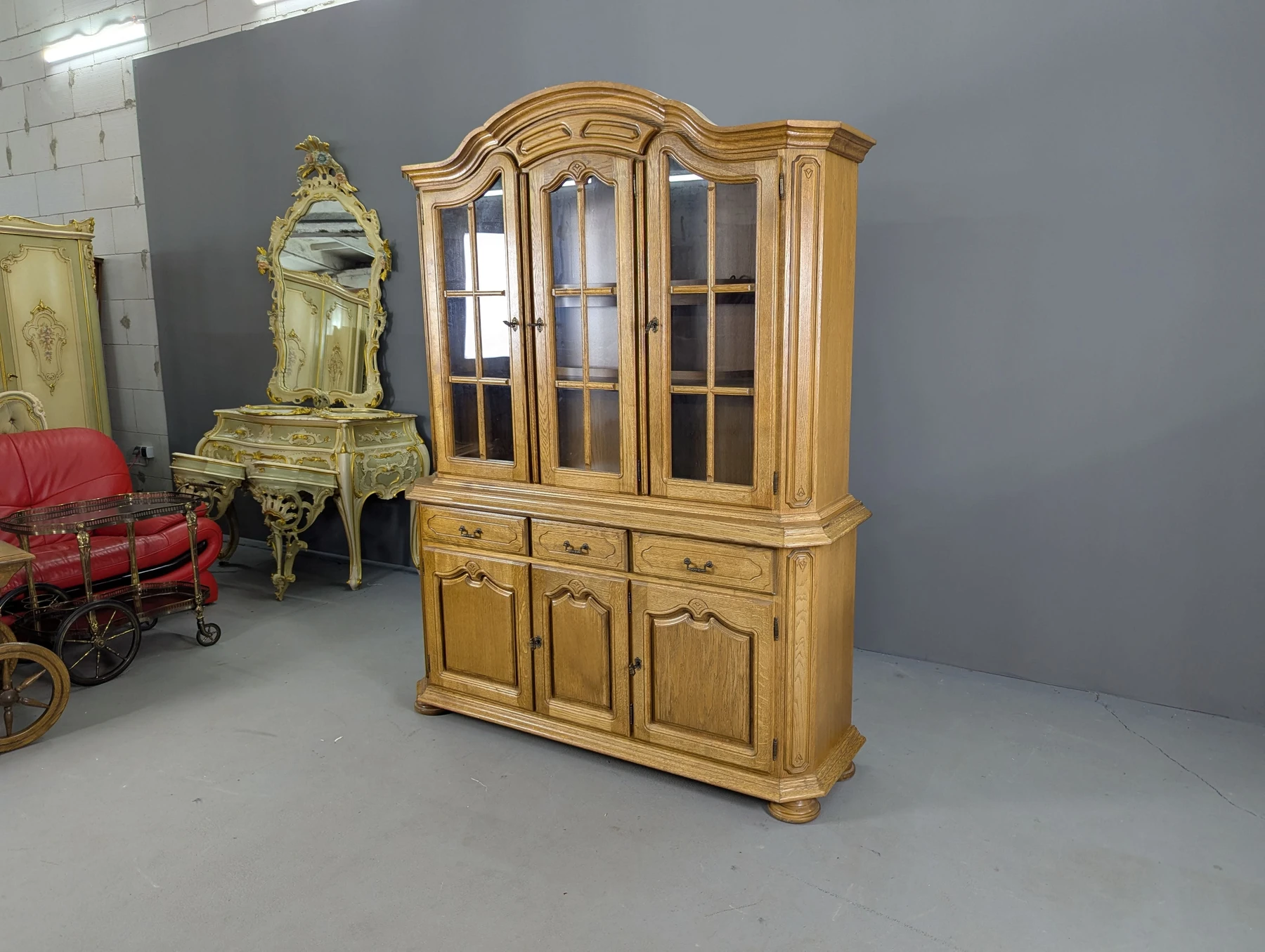 Šviesaus medžio indauja su stiklinėmis durelėmis ir trimis talpiais stalčiais viršutinėje dalyje. Viršutinė spintos dalis skirta indams, stiklo dirbiniams ar dekoracijoms eksponuoti, o apatinėje – uždaros spintelės, kuriose galima laikyti įvairius daiktus. Išraiškingas lenktas viršus ir profiliuoti fasadai suteikia baldui klasikinio jaukumo ir struktūros. Baldas tvirtas, masyvus, puikiai tinka svetainei ar valgomajam.
