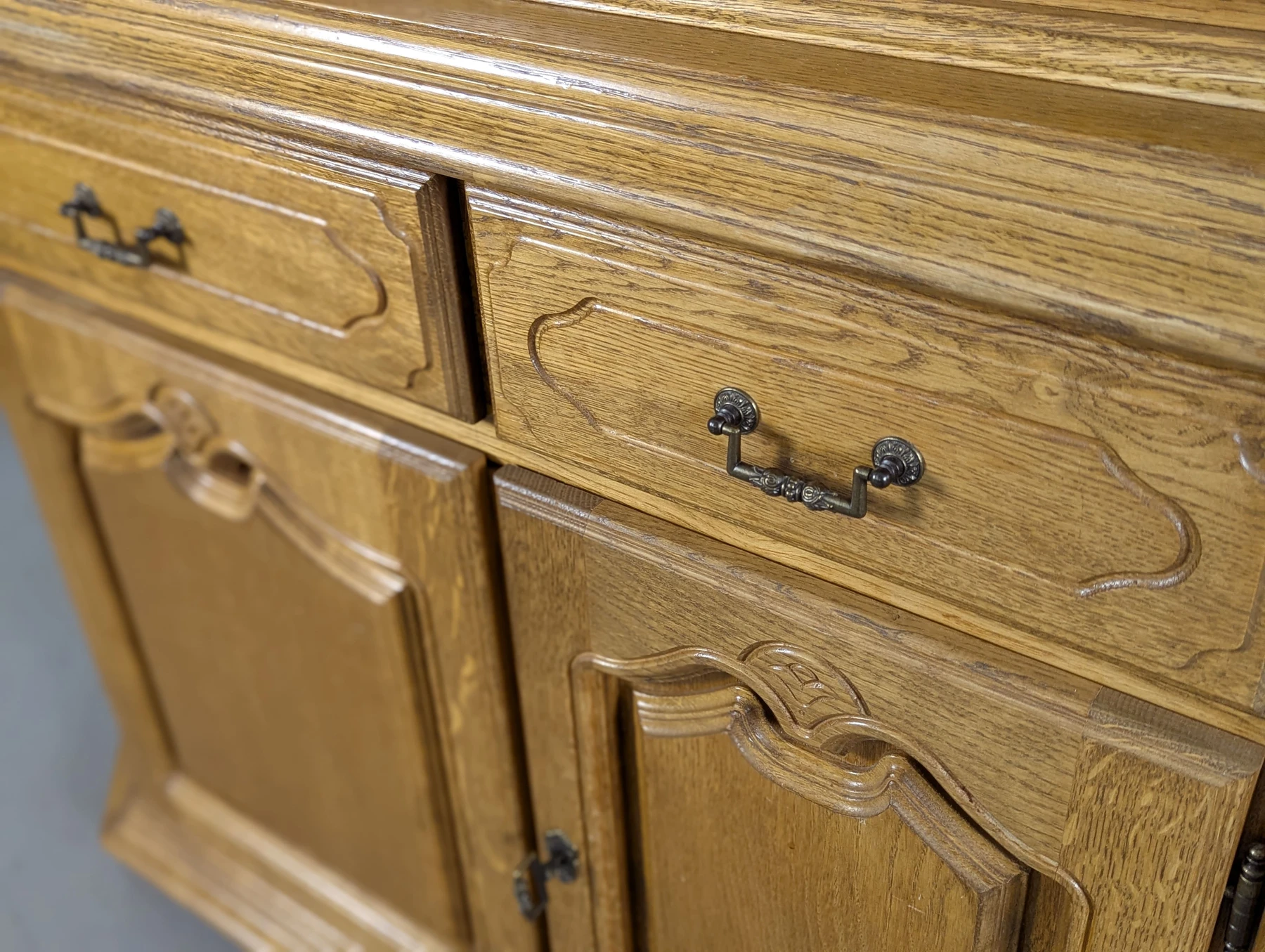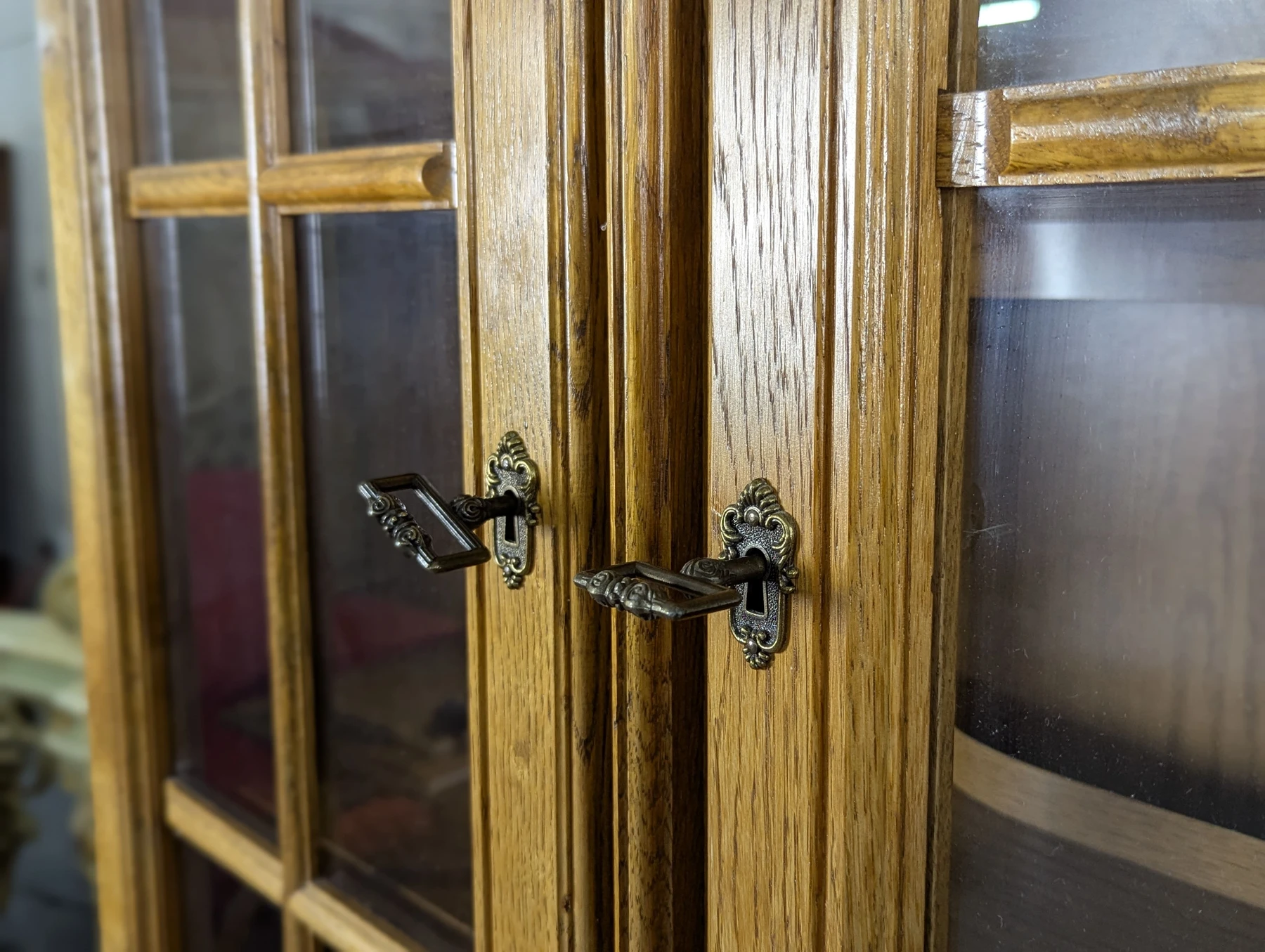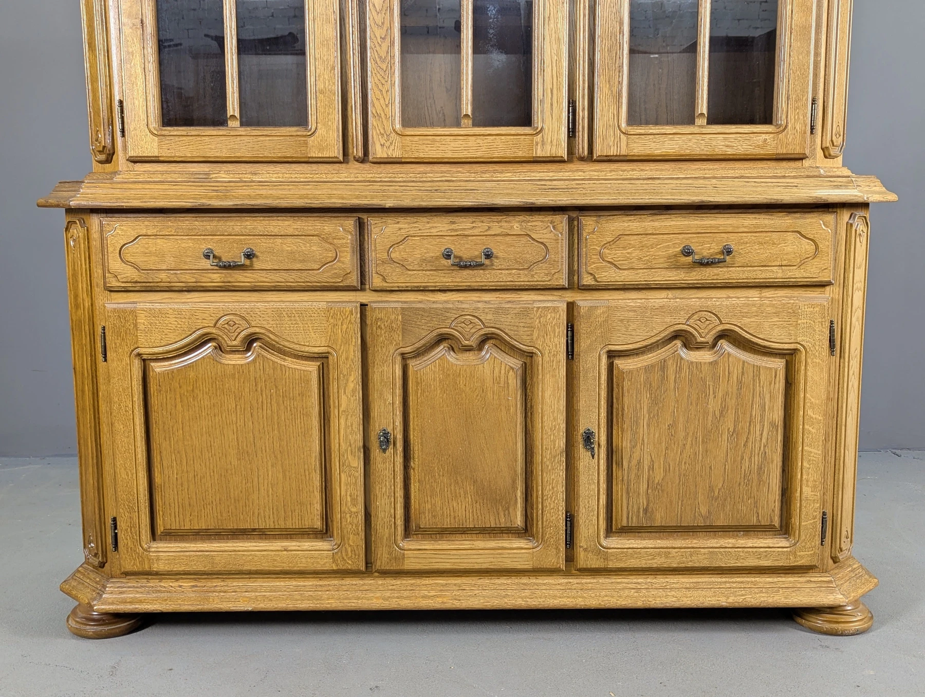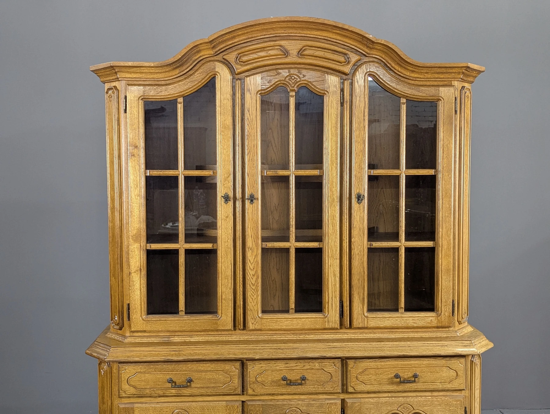 Šviesaus medžio indauja su stiklinėmis durelėmis ir trimis talpiais stalčiais viršutinėje dalyje. Viršutinė spintos dalis skirta indams, stiklo dirbiniams ar dekoracijoms eksponuoti, o apatinėje – uždaros spintelės, kuriose galima laikyti įvairius daiktus. Išraiškingas lenktas viršus ir profiliuoti fasadai suteikia baldui klasikinio jaukumo ir struktūros. Baldas tvirtas, masyvus, puikiai tinka svetainei ar valgomajam.