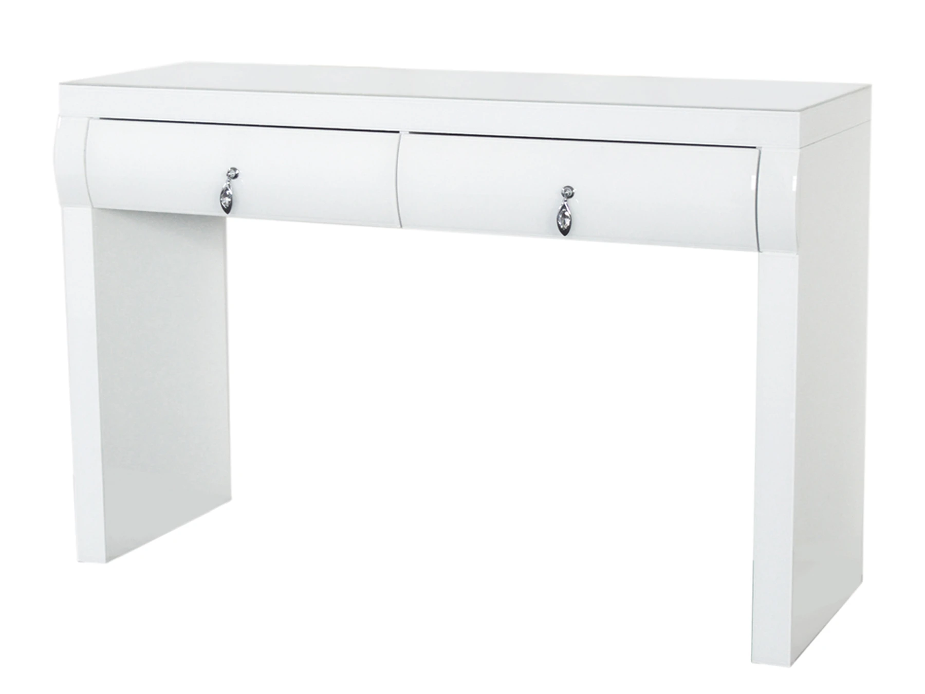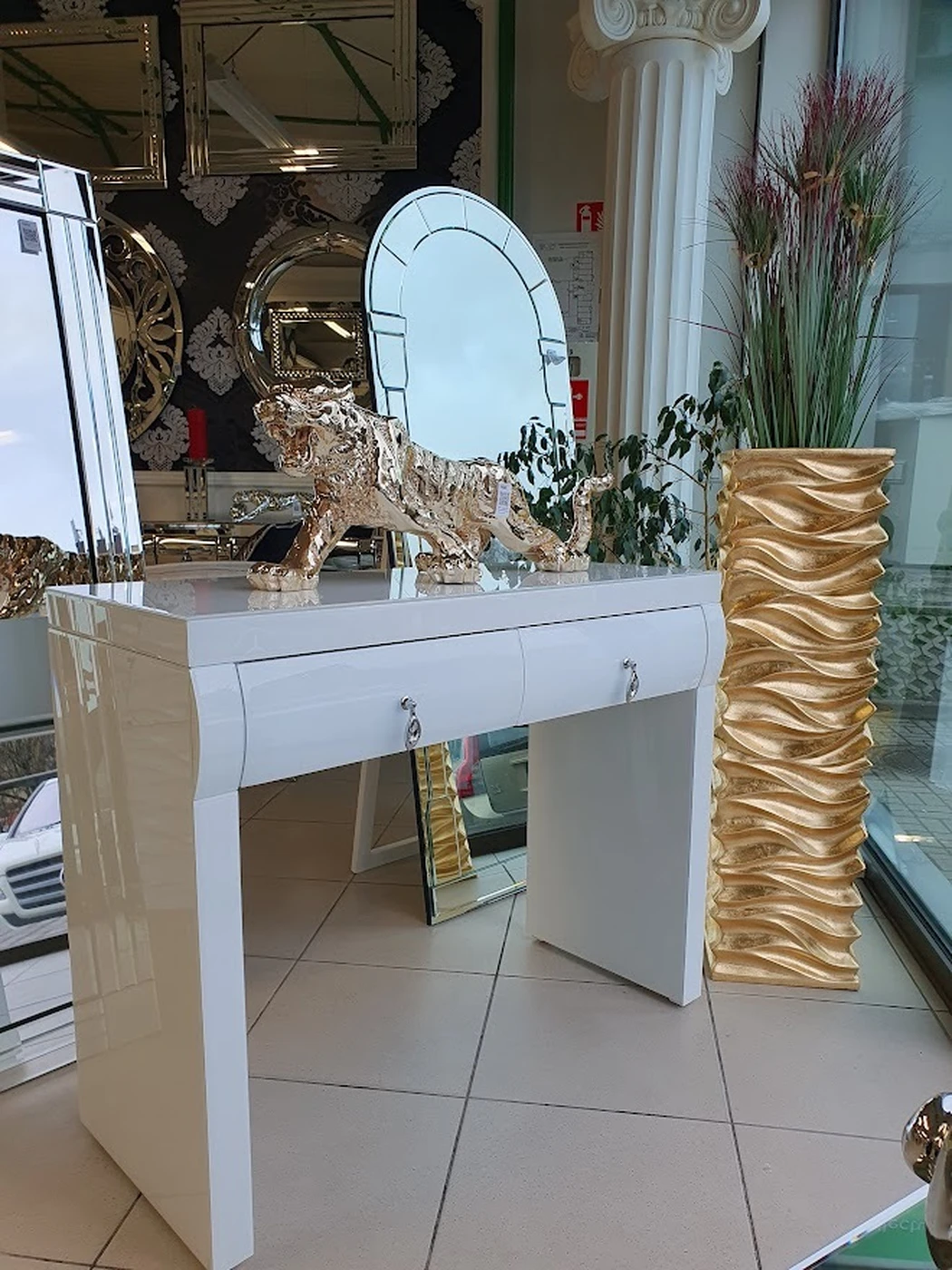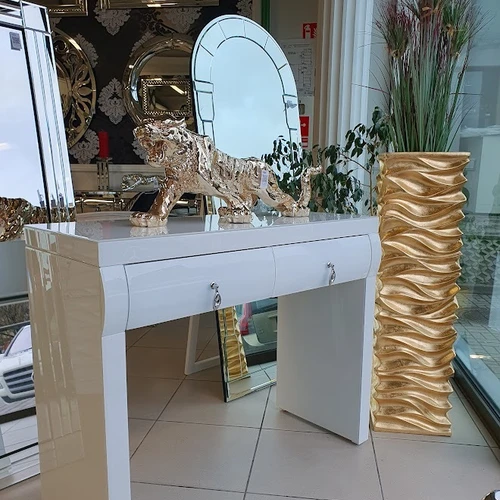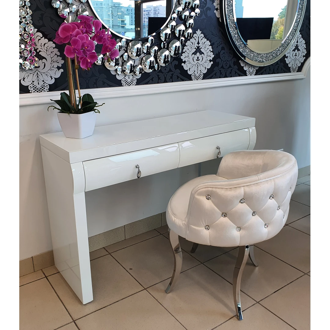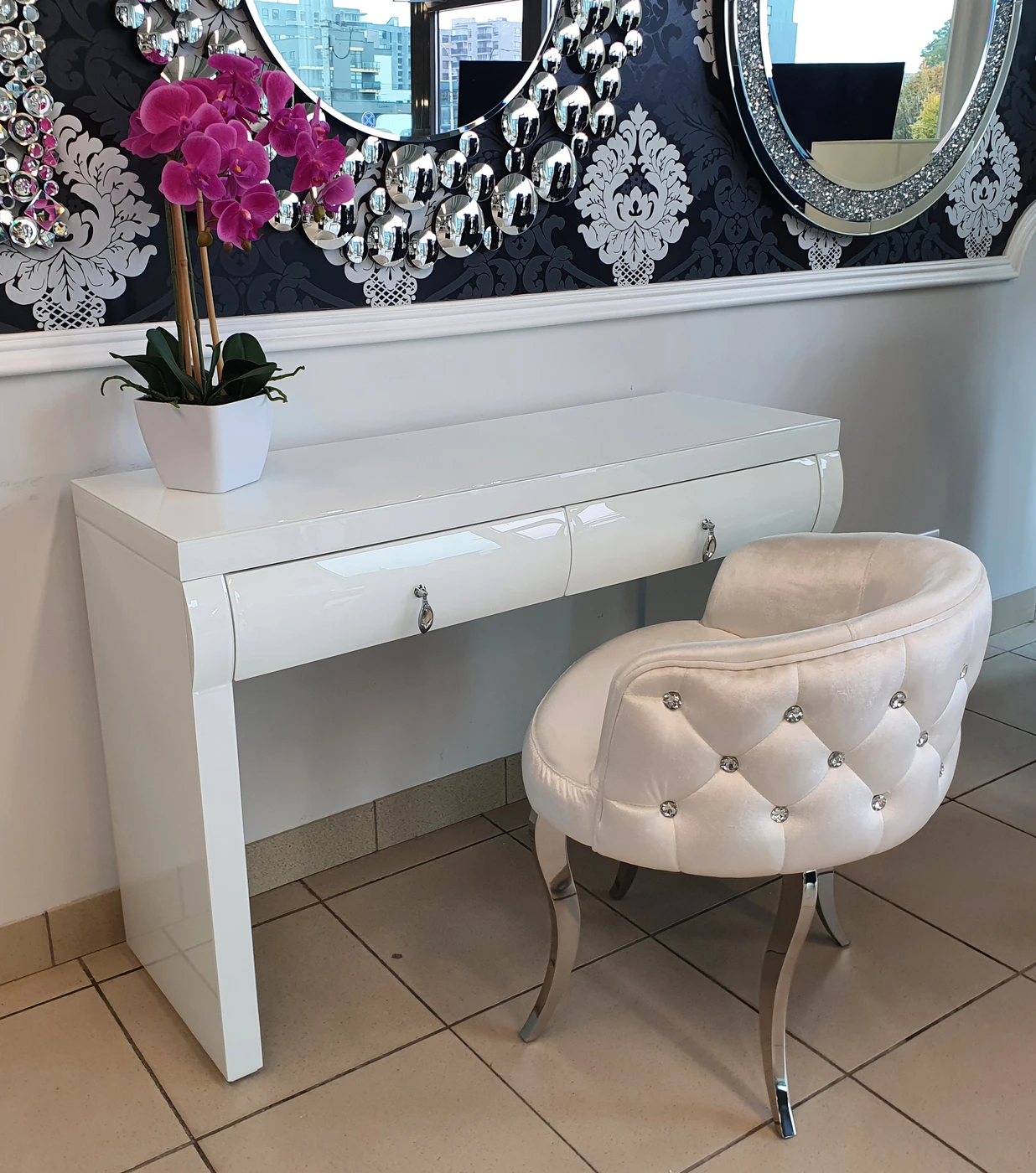 Stilingas balto stiklo kosmetinis staliukas kuris labai gražiai žiūrisi tiek moderniame, tiek ir klasikiniame interjere.