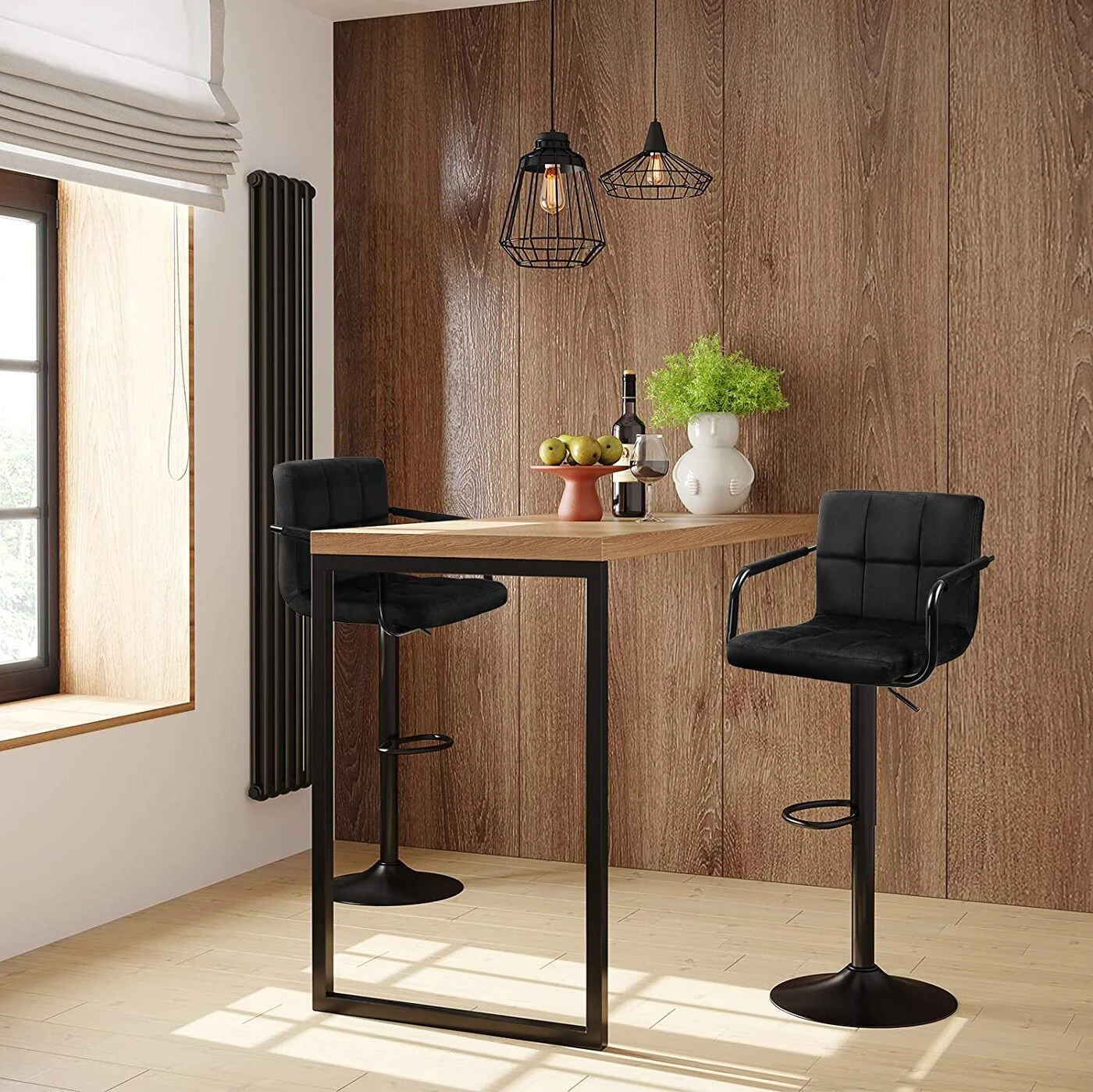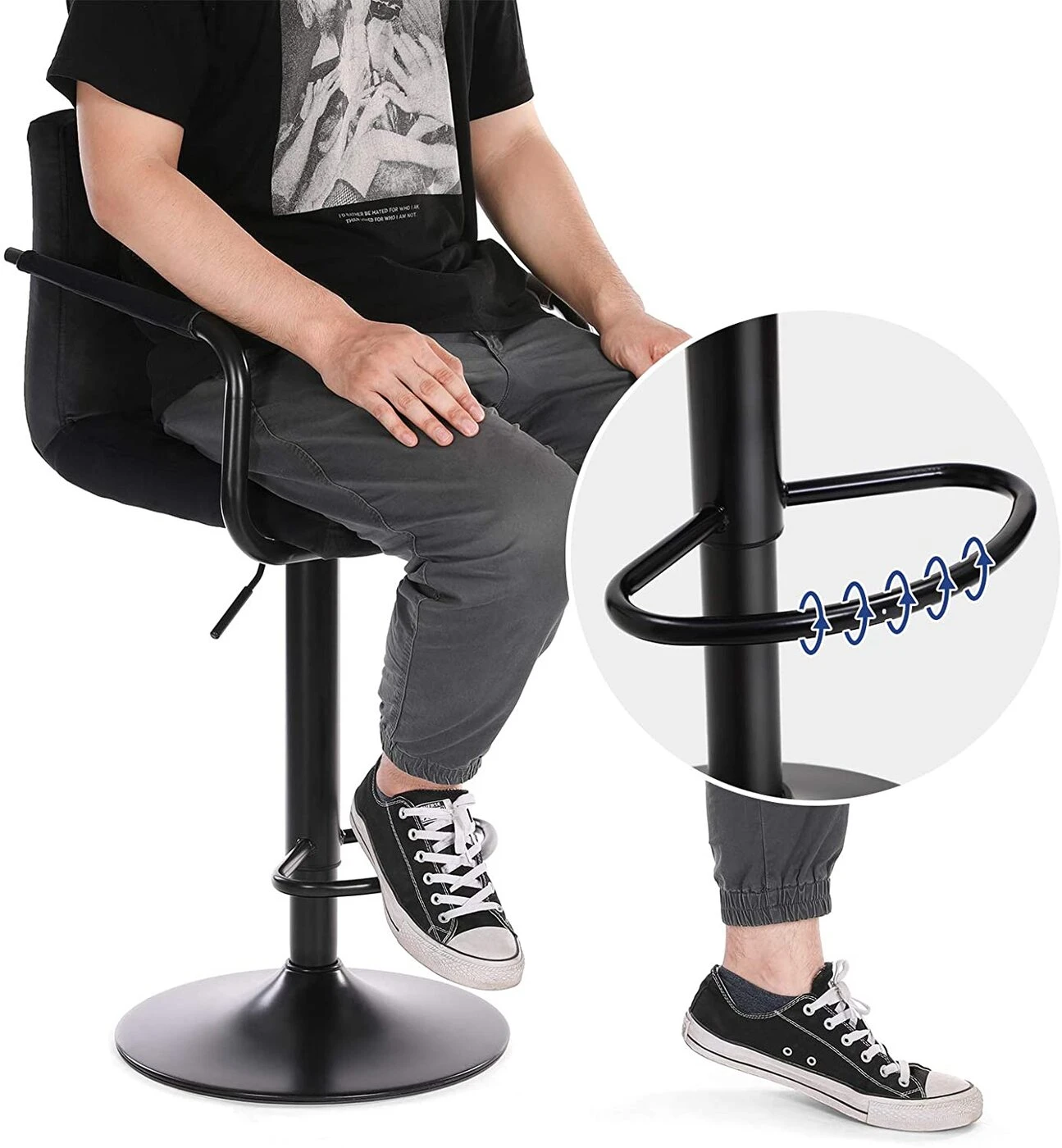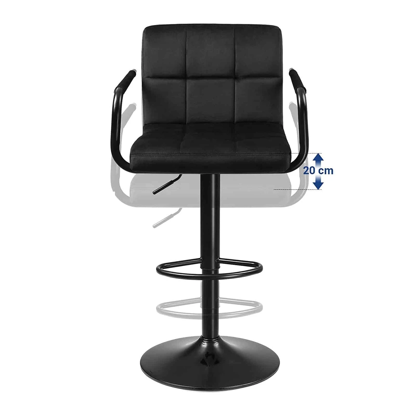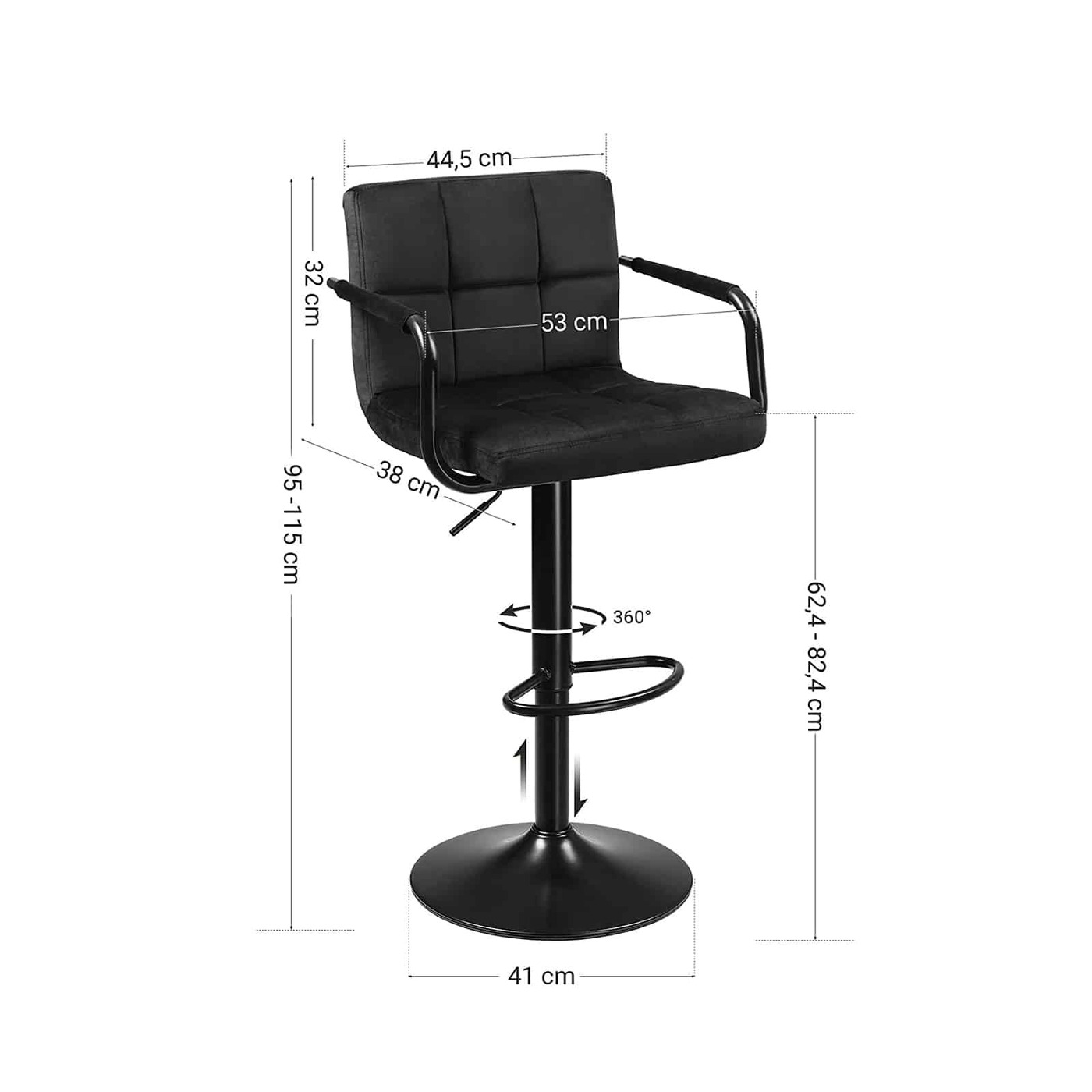 Aprašymas buvo automatiškai išverstas, gali pasitaikyti klaidų.Patogumas – tai ne tik sėdėjimas ant sofos svetainėje. Dėl šių gerai apmuštų SONGMICS baro kėdžių, kurios turi minkštą atlošą, praktiškus porankius ir atramą kojoms, jaukumas dabar gali rastis ir jūsų virtuvėje. Saugiai sukite 360° besisukančios virtuvės kėdės sukasi sklandžiai ir be klibėjimo. Pagrindo skersmuo yra 41 cm, o apačioje yra neslystantis plastikinis žiedas. Tai užtikrina saugų naudojimą ir apsaugo grindis nuo įbrėžimų. Elegancija iki maksimumo Paprastas profilis, patogus aksominis užvalkalas ir milteliniu būdu dengta metalinė konstrukcija ne tik suteikia spindesio šiam gaminiui, bet ir jūsų virtuvei. Čia galėsite papusryčiauti su mylimu žmogumi, padirbėti prie kompiuterio ar išpilstyti lankytojams taurę vyno.Išsami informacija apie gaminį: - Spalva: juoda - Medžiaga: aksomas, metalas, porolonas - Dydis: 38 x 44,5 x (95-115) cm (P x P x A) - Reguliuojamas sėdynės aukštis: 62,5-82,5 cm - Sėdynės dydis: 38 x 44,5 cm (I x P) - Atlošo aukštis: 32 cm - Pagrindo skersmuo: 41 cm - Vienos kėdės svoris: 9 kg - Maksimali baro kėdės statinė apkrova: 120 kg Pristatymo komplektacija: - 2 x baro kėdės - 2 x priedų paketas – 1 x vadovas (DE, EN, FR, ES, IT)