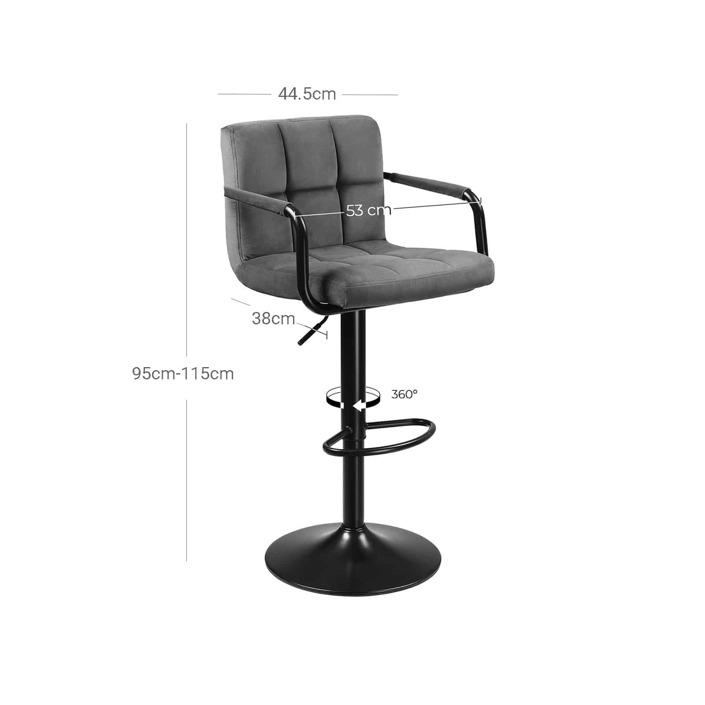 Aprašymas buvo automatiškai išverstas, gali pasitaikyti klaidų.Patogumas – tai ne tik sėdėjimas ant sofos svetainėje. Dėl šių gerai apmuštų SONGMICS baro kėdžių, kurios turi minkštą atlošą, praktiškus porankius ir atramą kojoms, jaukumas dabar gali rastis ir jūsų virtuvėje. Saugiai sukite 360° besisukančios virtuvės kėdės sukasi sklandžiai ir be klibėjimo. Pagrindo skersmuo yra 41 cm, o apačioje yra neslystantis plastikinis žiedas. Tai užtikrina saugų naudojimą ir apsaugo grindis nuo įbrėžimų. Elegancija iki maksimumo Paprastas profilis, patogus aksominis užvalkalas ir milteliniu būdu dengta metalinė konstrukcija ne tik suteikia spindesio šiam gaminiui, bet ir jūsų virtuvei. Čia galėsite papusryčiauti su mylimu žmogumi, padirbėti prie kompiuterio ar išpilstyti lankytojams taurę vyno.Išsami informacija apie gaminį: - Spalva: tamsiai pilka - Medžiaga: aksomas, metalas, porolonas - Dydis: 38 x 44,5 x (95-115) cm (P x P x A) - Reguliuojamas sėdynės aukštis: 62,5-82,5 cm - Sėdynės dydis : 38 x 44,5 cm (I x P) - Atlošo aukštis: 32 cm - Pagrindo skersmuo: 41 cm - Vienos kėdės svoris: 9 kg - Maksimali baro kėdės statinė apkrova: 120 kg Pristatymo komplektas: - 2 x baro kėdės - 2 x priedų paketas - 1 x vadovas (DE, EN, FR, ES, IT)