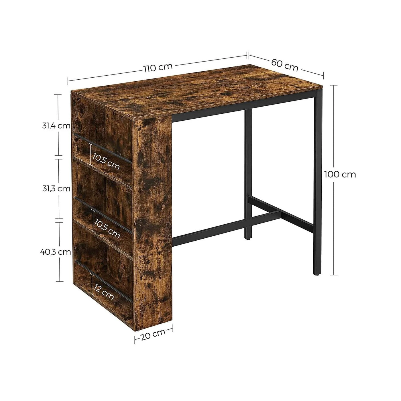 Aprašymas buvo automatiškai išverstas, gali pasitaikyti klaidų. Išsami informacija apie gaminį: - Spalva: vintažinė ruda-juoda - Medžiaga: medžio drožlių plokštės, plienas - Dydis: 110 x 60 x 100 cm (P x P x A) - Svoris: 26 kg - Maksimali bendra apkrova: 30 kg - Maks. Statinė apkrova vienam lentynos lygiui: 10 kgPristatymo komplektas:- 1 x baro staliukas- 1 x priedų pakuotė- 2 x apsaugos nuo posvyrio įtaisai- 1 x instrukcijaVASAGLE Pastabos:- Saugumo sumetimais vaikams draudžiama lipti ant gaminio ar žaisti su juo.- Maksimalus statinis gaminio apkrova 30 kg. Neviršykite šio maksimalaus svorio. – Pritvirtinkite šį gaminį prie sienos su komplekte esančiu neapvirtimu, kad užtikrintumėte saugų naudojimą.