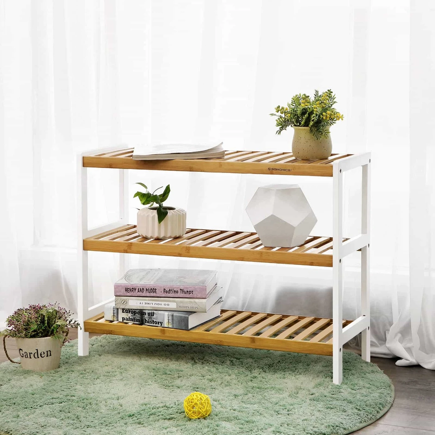 Aprašymas buvo automatiškai išverstas, gali pasitaikyti klaidų.Songmics batų lentyna yra ideali prieškambario ar prieškambario tvarkyklė. Gaunate prašmatnią batų lentyną, kuri įtikina geru apdirbimu ir yra itin dekoratyvi. Tai ne tik įneša tvarką namuose, bet ir galėsite pristatyti batus bei dekoratyvinius daiktus parduotuvėje. Batus, krepšius, augalus, krepšius ir vonios reikmenis, tokius kaip rankšluosčiai, galima sudėti į 4 saugojimo vietas. Čia yra daugiau idėjų. Kodėl verta rinktis Songmics batų lentyną? „Songmics“ visada yra orientuota į klientą ir deda visas pastangas, kad gaminiai būtų kokybiški ir kokybiški. Mes teikiame puikų klientų aptarnavimą ir padarysime viską, kad išspręstume jūsų problemas. Pastaba: - Nesėdėkite ir nesiremkite į jį.Išsami informacija apie gaminį: - Matmenys: 70 x 55 x 26 cm (P x A x G) - Medžiaga: bambukas - Pakuotės matmenys: 69 x 31 x 11 cm - Svoris: 3,4 kg Pristatymo komplektas: - 1 x batų lentyna su 3 lygiais