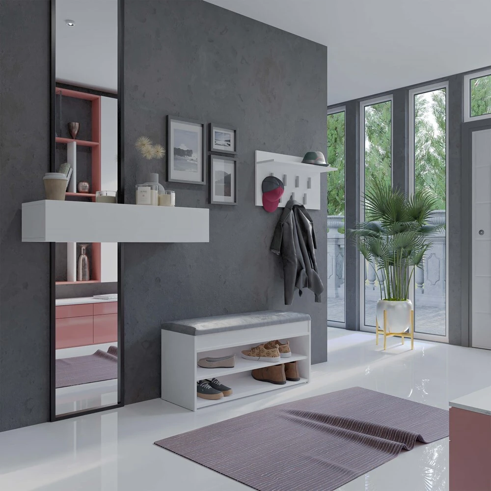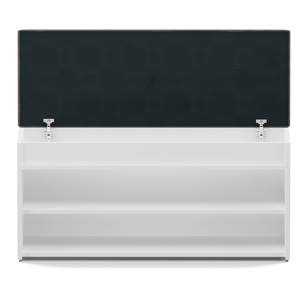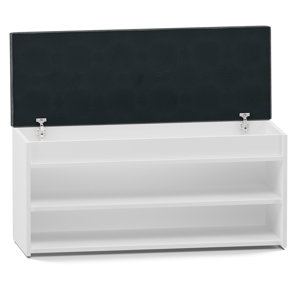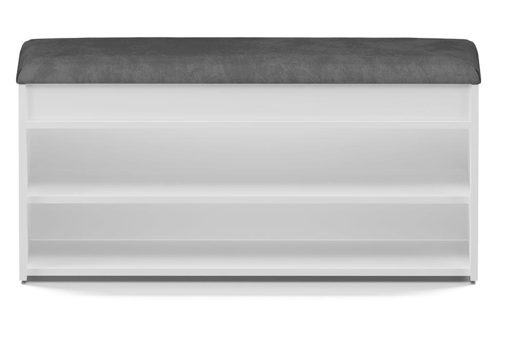 pastatoma, 2-ų atvirų skyrių batų lentyna - minkštasuolis su daiktadėže;lentyna pagaminta iš 16 mm storio laminuotos medžio drožlių plokštės su ABS kraštų apdaila;minkšta ir patogi sėdynė;lentynos išmatavimai: plotis - 100 cm, gylis - 35 cm, aukštis - 49 cm;vidinis išplanavimas pavaizduotas 2 nuotraukoje;lentynos spalva: balta, sėdynė - pilka;įbrėžimams ir drėgmei atsparus paviršius;tvirta ir stabili konstrukcija;