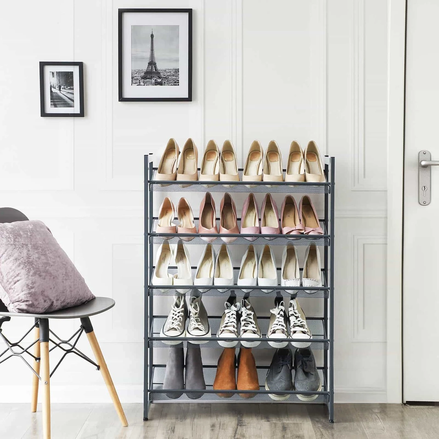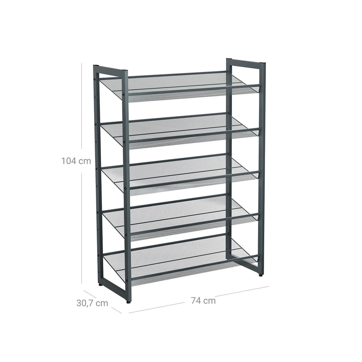 Aprašymas buvo automatiškai išverstas, gali pasitaikyti klaidų.Reguliuojamos lentynosLentynos gali būti lanksčiai montuojamos plokščiai arba kampu, priklausomai nuo jūsų poreikių.Metalinio tinklelio lentynaMetalinis tinklelis sukurtas su ypač tankiu tinkleliu, kad jūsų batai ar kiti smulkūs daiktai nenukristų.4 reguliuojamos kojelėsTai leidžia lengvai pastatyti lentyną ant nelygių grindų.Išsami informacija apie gaminį: Spalva: tamsiai pilka Medžiaga: geležis Gaminio dydis: 74 x 30,7 x 104 cm (P x G x A) Svoris: 5,7 kg Kiekvieno lygio talpa: 10 kg Pristatymo komplektas: 1 x batų lentyna 2 x plastikinės jungtys 1 x priedų krepšys 1 x instrukcijos (DE, EN, FR , ES, IT) SONGMICS Pastabos: Nerekomenduojame dėti dviejų 5 pakopų batų lentynų vienas ant kito, nes tai gali neigiamai paveikti gaminių saugą ir stabilumą.