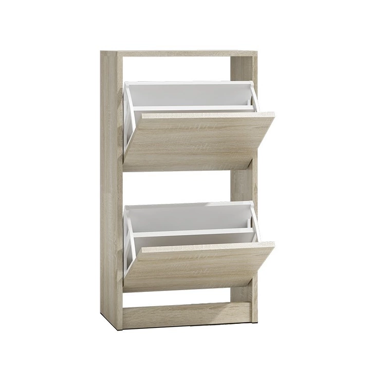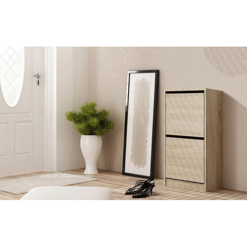 Dviejų durelių spintelė batams sudėti;Durelės atsidaro žemyn;Korpusas ir fasadas pagaminti iš 18 mm storio laminuotos medžio drožlių plokštės (MDP);Spintelės kraštai dengti mechaminiam ir cheminiams pažeidimams atsparia PVC danga;Lengvai valomas, atsparus įbrėžimams paviršius;Spintelės išmatavimai: aukštis – 94 cm, plotis – 49 cm, gylis – 28 cm; Spintelės spalva: ąžuolo (sonoma);Spintelės stalčiaus viduje: dviejų eilių plastikinis krepšys;