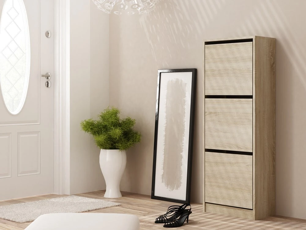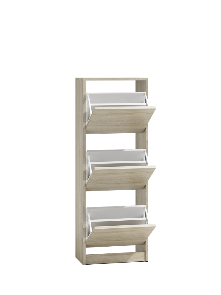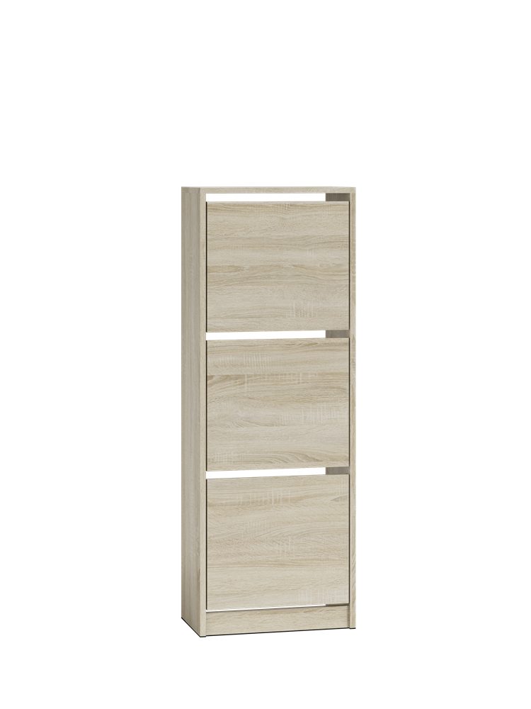 Trijų durelių spintelė batams sudėti;Durelės atsidaro žemyn;Korpusas ir fasadas pagaminti iš 18 mm storio laminuotos medžio drožlių plokštės (MDP);Spintelės kraštai dengti mechaminiam ir cheminiams pažeidimams atsparia PVC danga;Lengvai valomas, atsparus įbrėžimams paviršius;Spintelės išmatavimai: aukštis – 136 cm, plotis – 49 cm, gylis – 28 cm; Spintelės spalva: ąžuolo (sonoma);Spintelės stalčiaus viduje: dviejų eilių plastikinis krepšys;